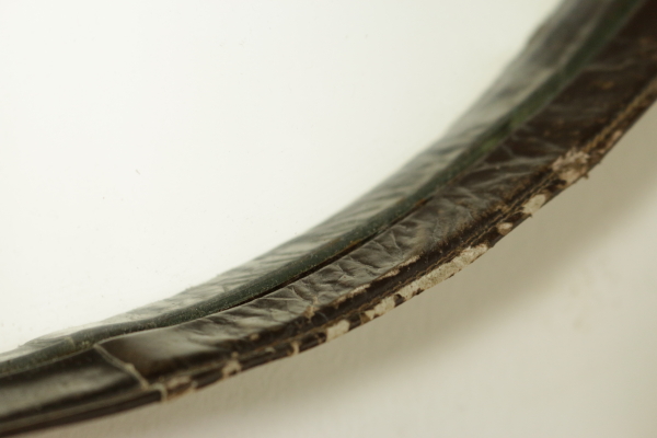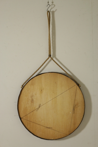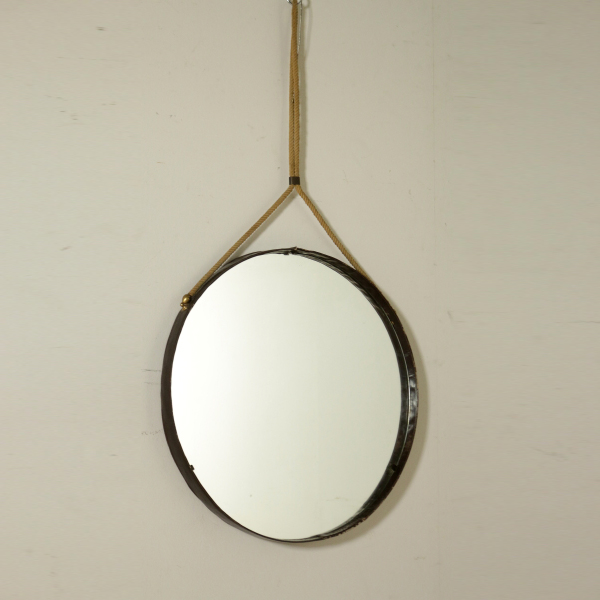 Spiegel 60er jahre an der wand mit einem rahmen aus holz, bedeckt mit leder.