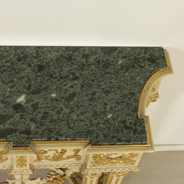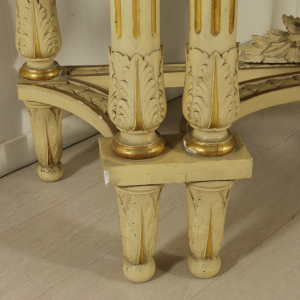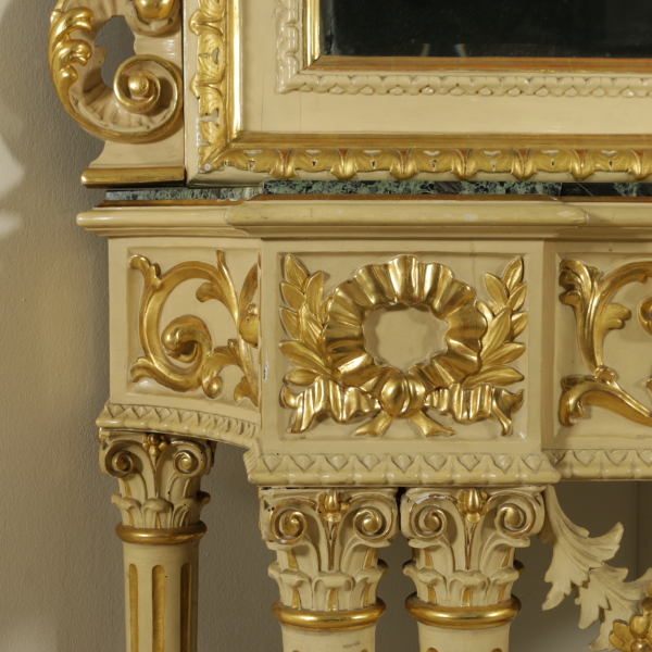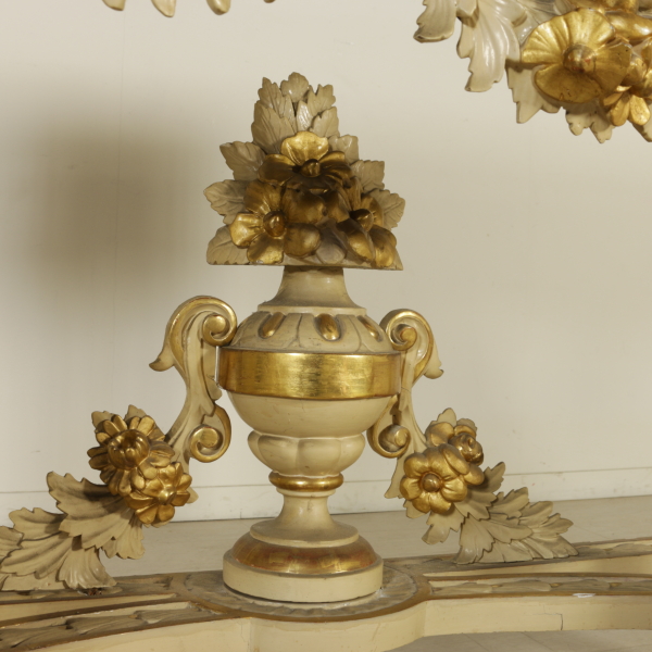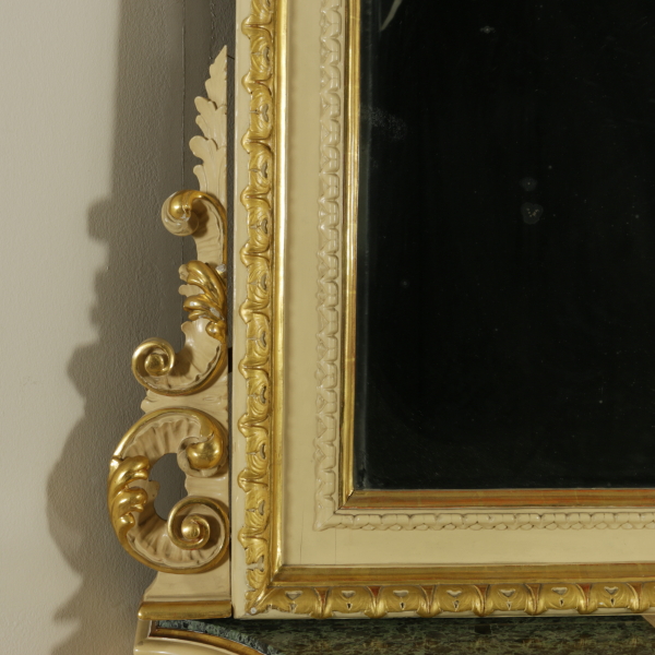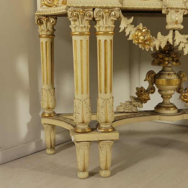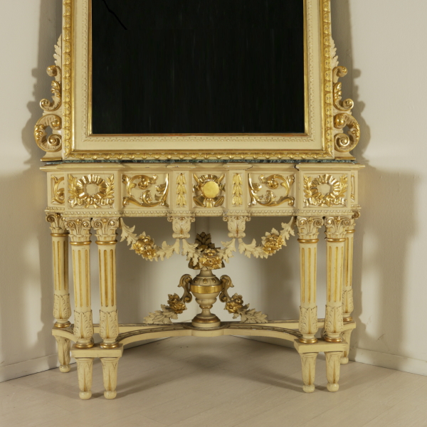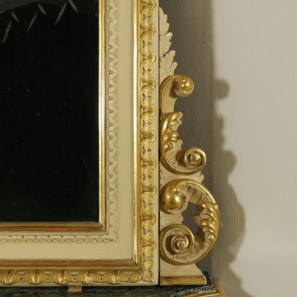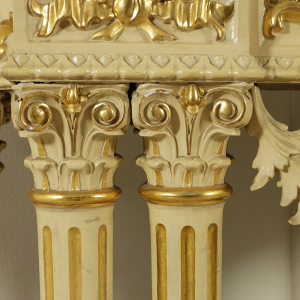 Wichtig der mittelkonsole, unterstützt durch sechs beine gedrehten und kannelierten, mit geschnitzten kapitellen und marmor-arbeitsplatte. Hohe spiegel geformt mit der bewältigung mit wappen. Reich geschnitzt mit girlanden, knoten, liebe, blumen und voluten fogliacee. Lackiert und vergoldet.