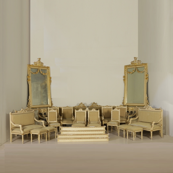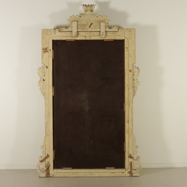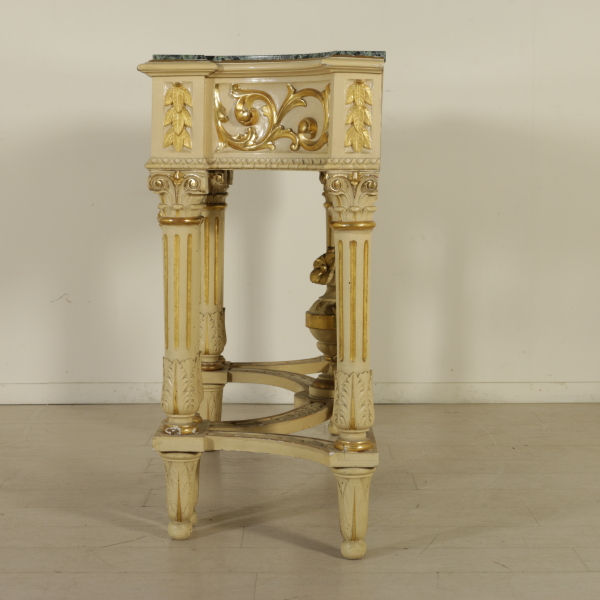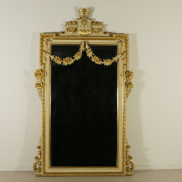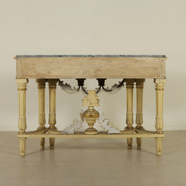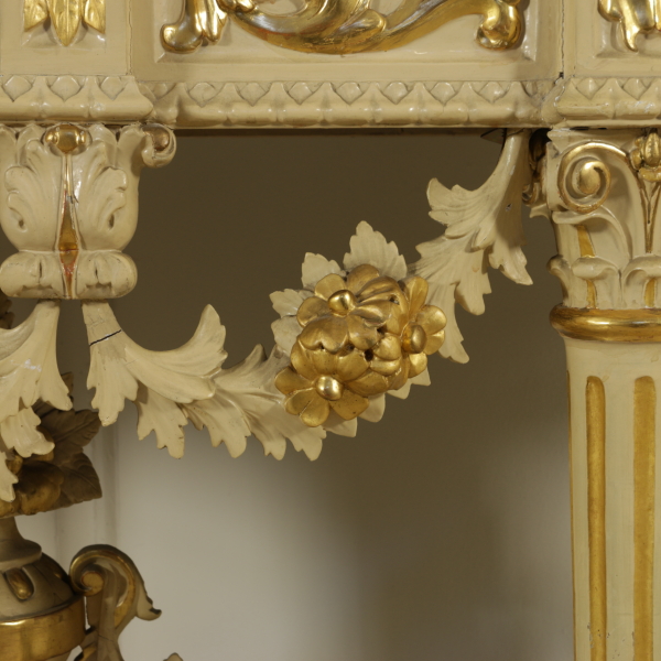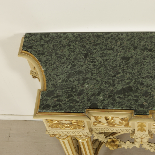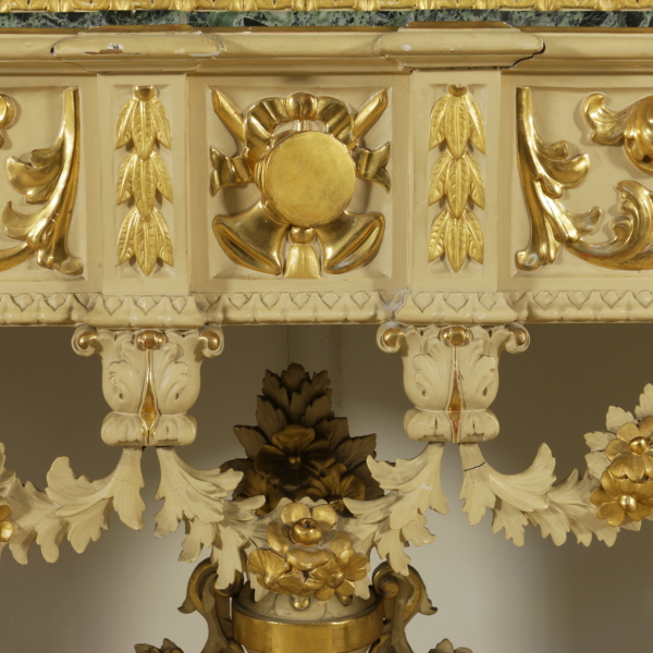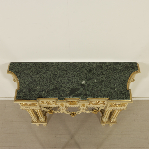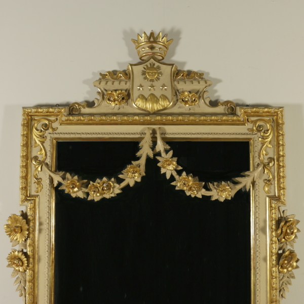 Wichtig der mittelkonsole, unterstützt durch sechs beine gedrehten und kannelierten, mit geschnitzten kapitellen und marmor-arbeitsplatte. Hohe spiegel geformt mit der bewältigung mit wappen. Reich geschnitzt mit girlanden, knoten, liebe, blumen und voluten fogliacee. Lackiert und vergoldet.