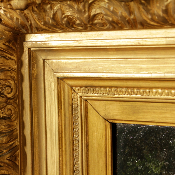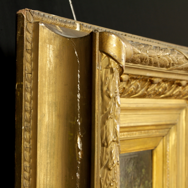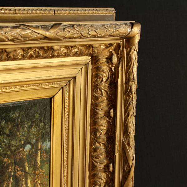 Öl auf tablett. Spur, signatur unten rechts. Auf der rückseite ist dieses label attributiva Pierre Francois Marangé, französisch landschaftsmaler (geboren 1836). In rahmen im stil von ende '800 bis anfang '900.