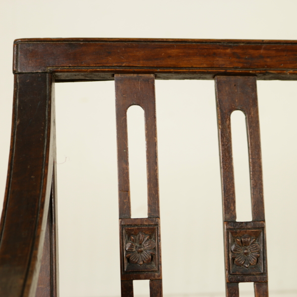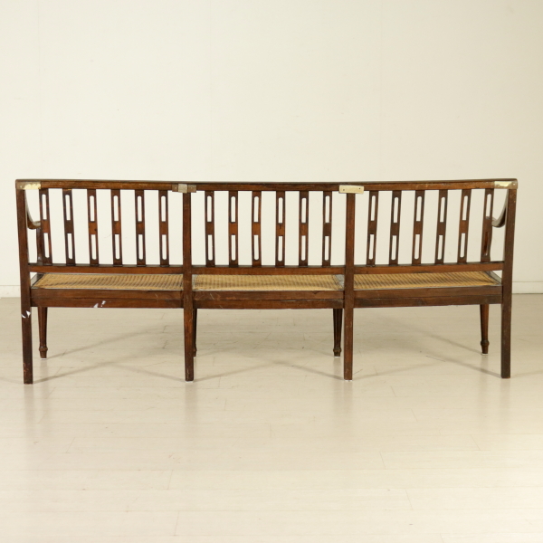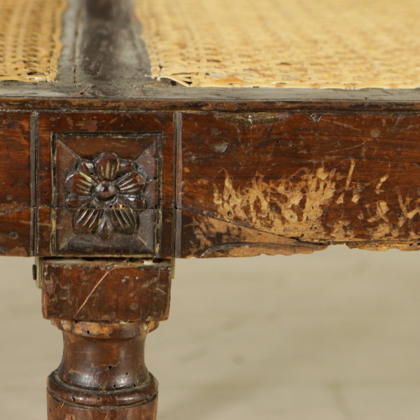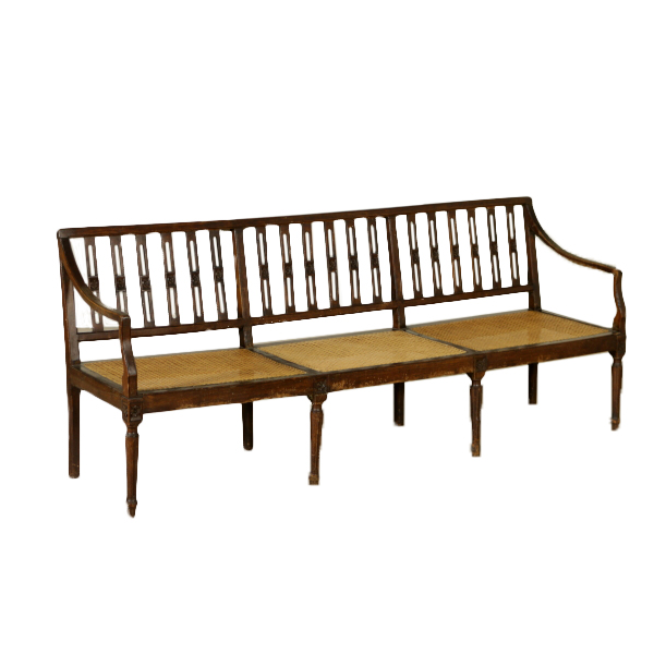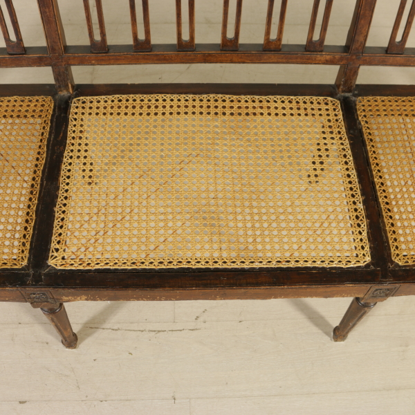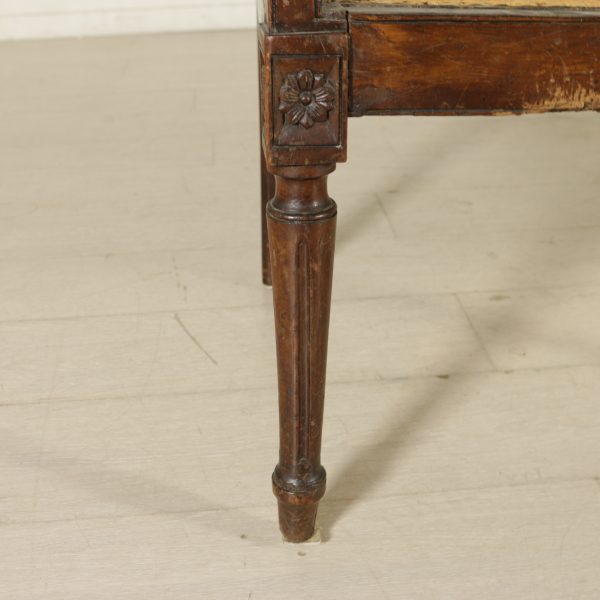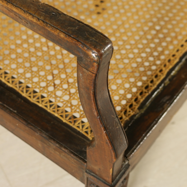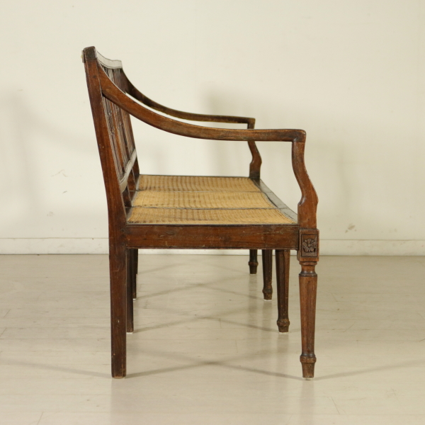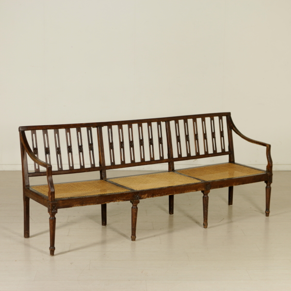 Sofa neo vorderen beine stamm-konische, armlehnen, pro tag und sitzung tripartite incannucciata. Rückenlehne tag mit ordner geschnitzt. Armlehnen beschädigt. In der kirsche. Antiquitäten, Italien, Jahrhundert.