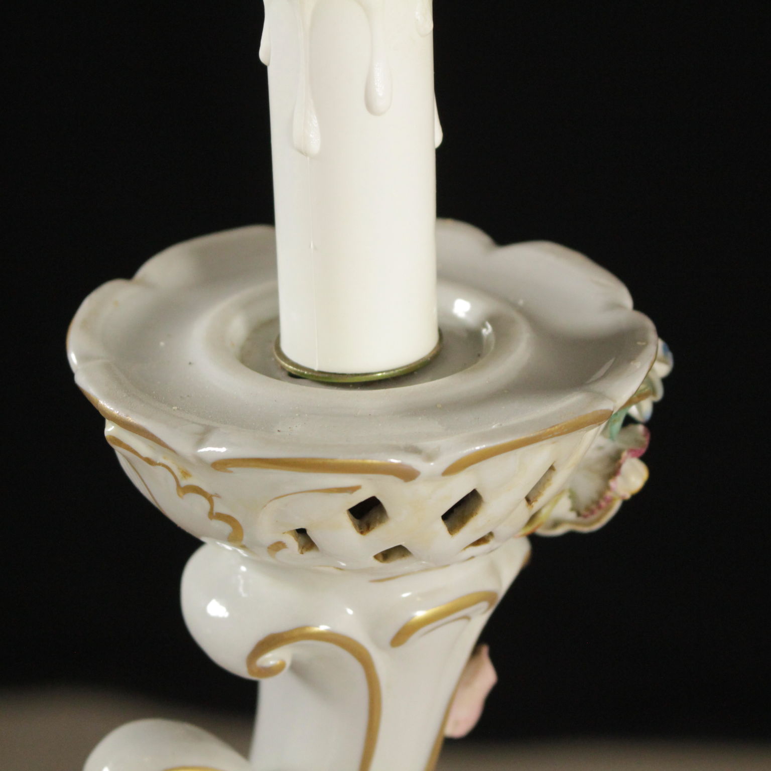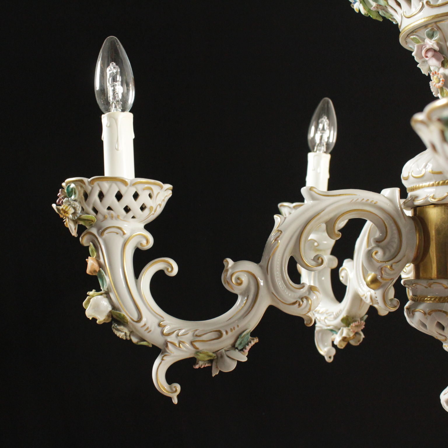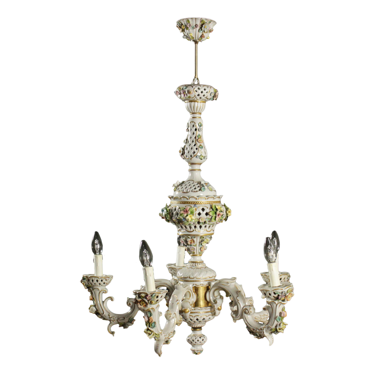 Kronleuchter mit vier armen gearbeitet und geärgert, mit dekorationen, die polychromie und vergoldung.