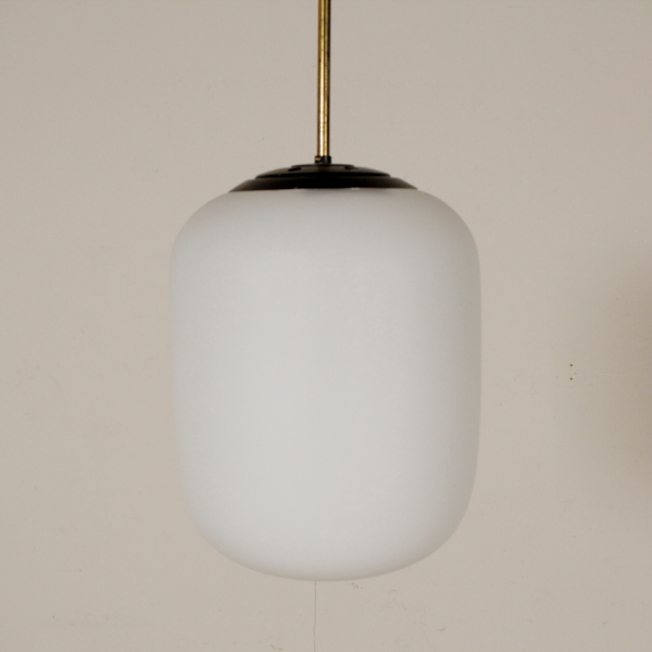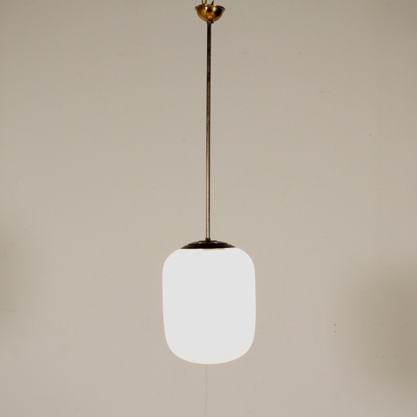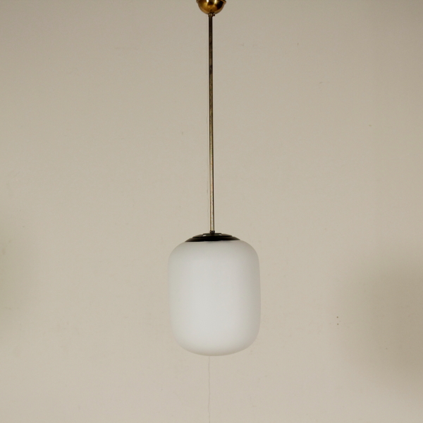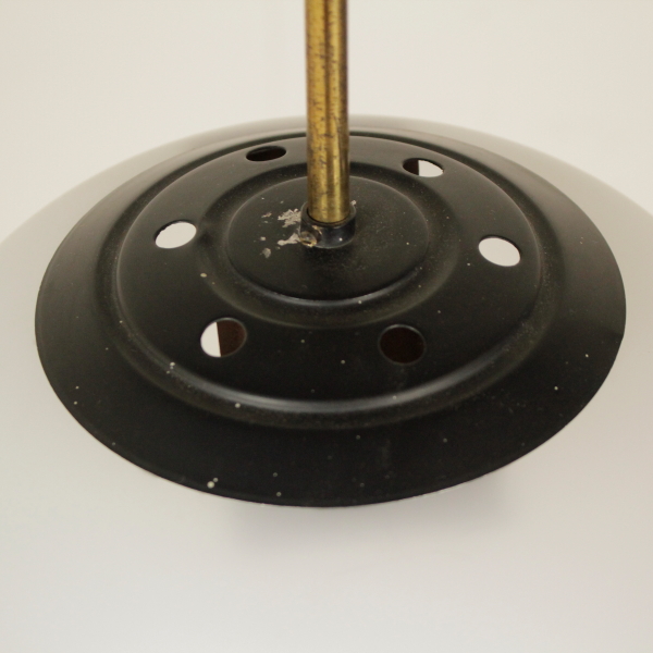 Lampada anni 60 a soffitto; ottone, vetro opalino.
