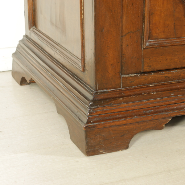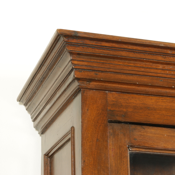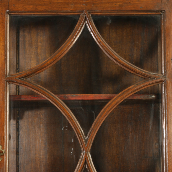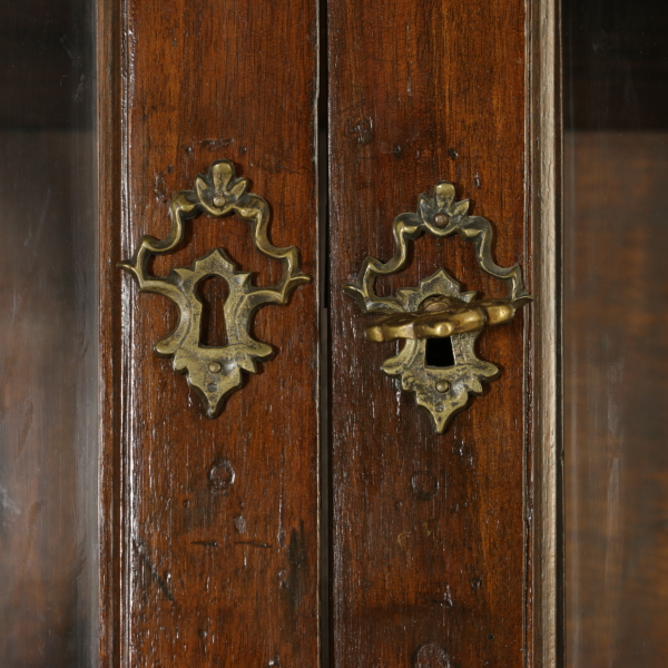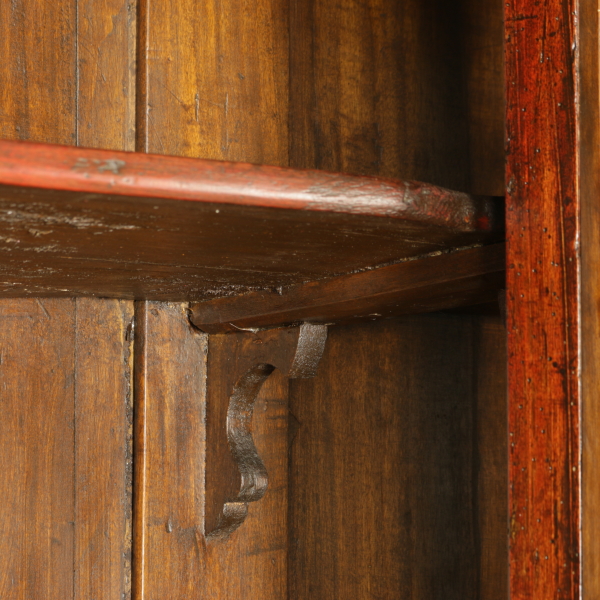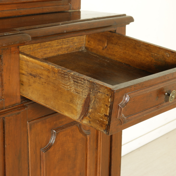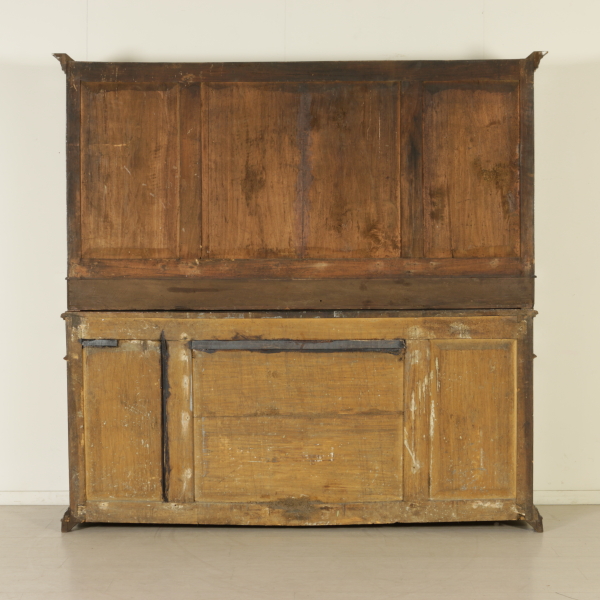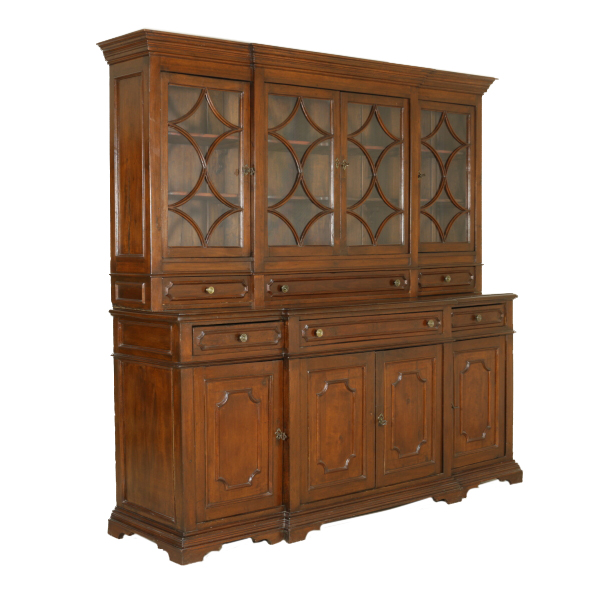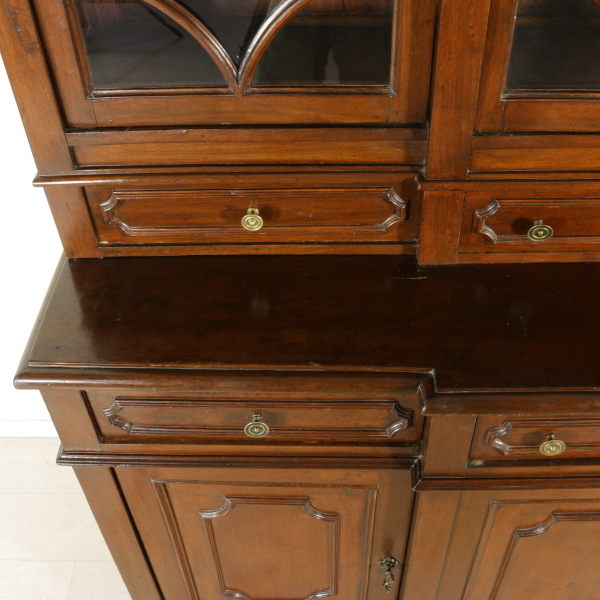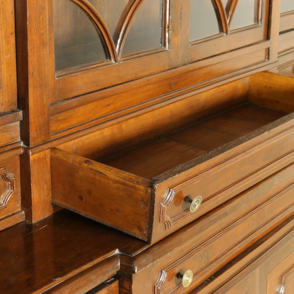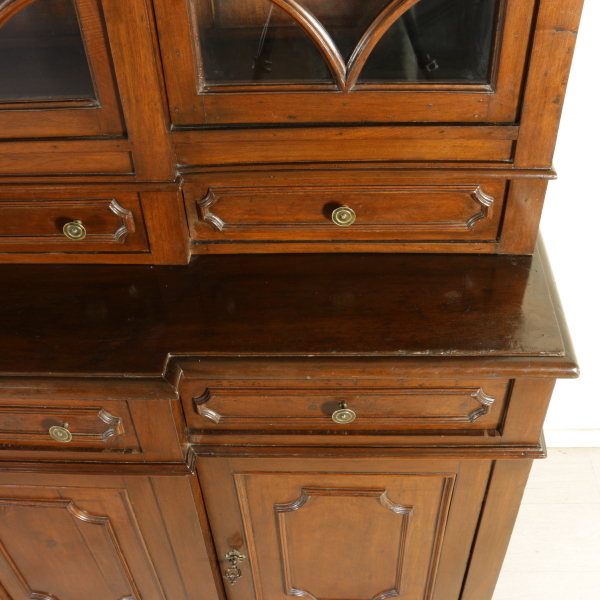 Zusammengestellt mit materialien und antikem holz, hat vier türen und drei schubladen. Tortenständer mit drei schubladen ausgerichtet und vier türen mit glas und gitter aus holz. Gerade zu fuß auf dem regal.