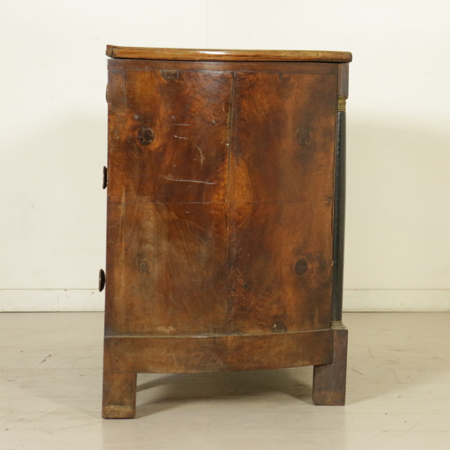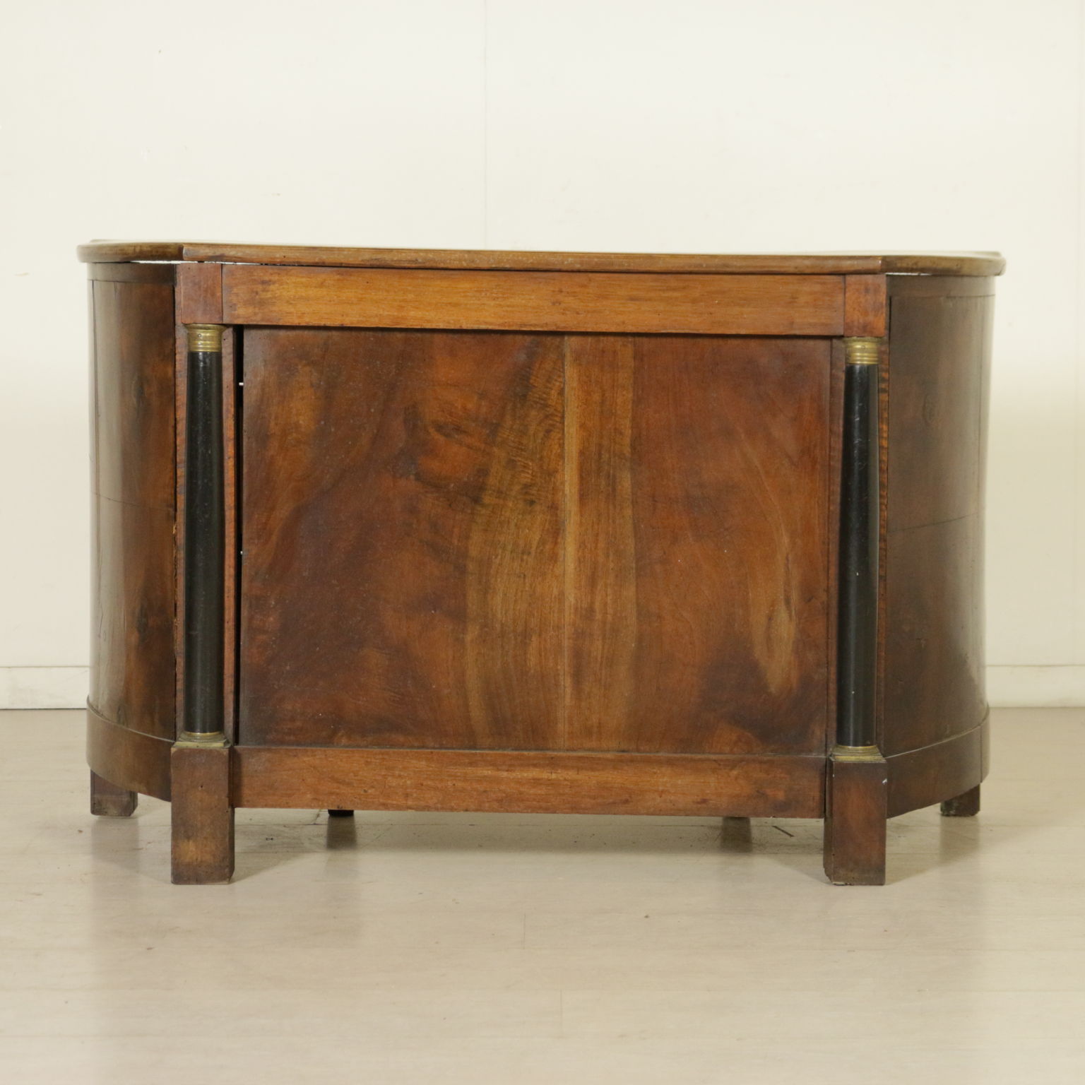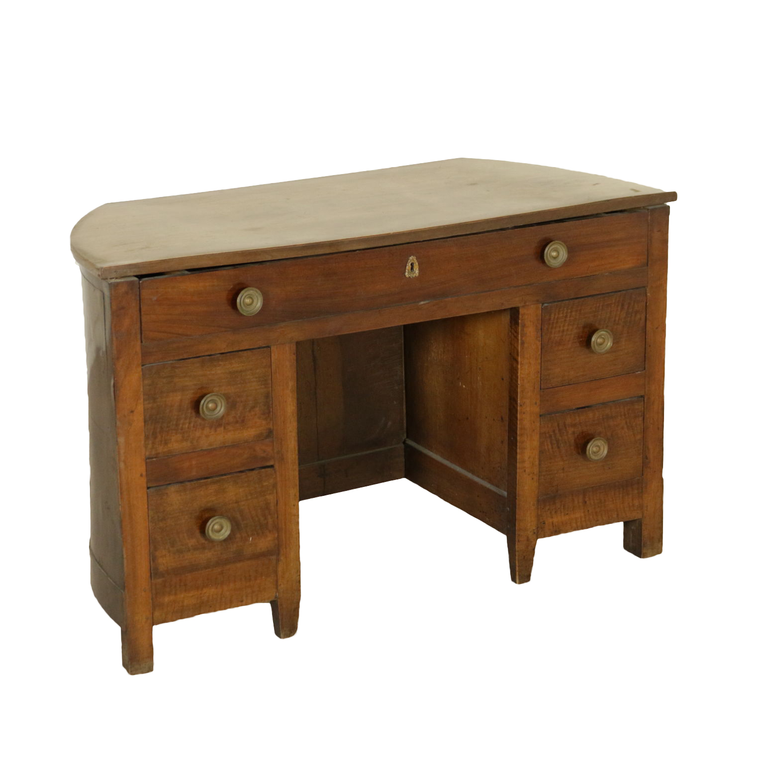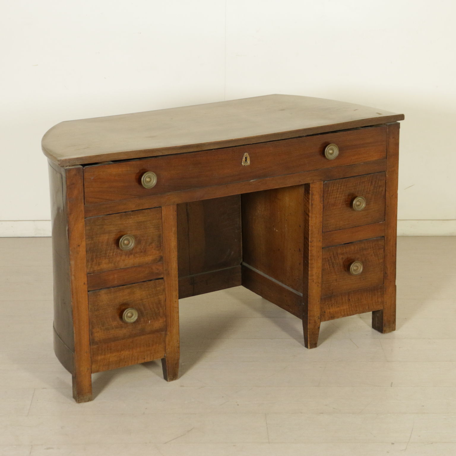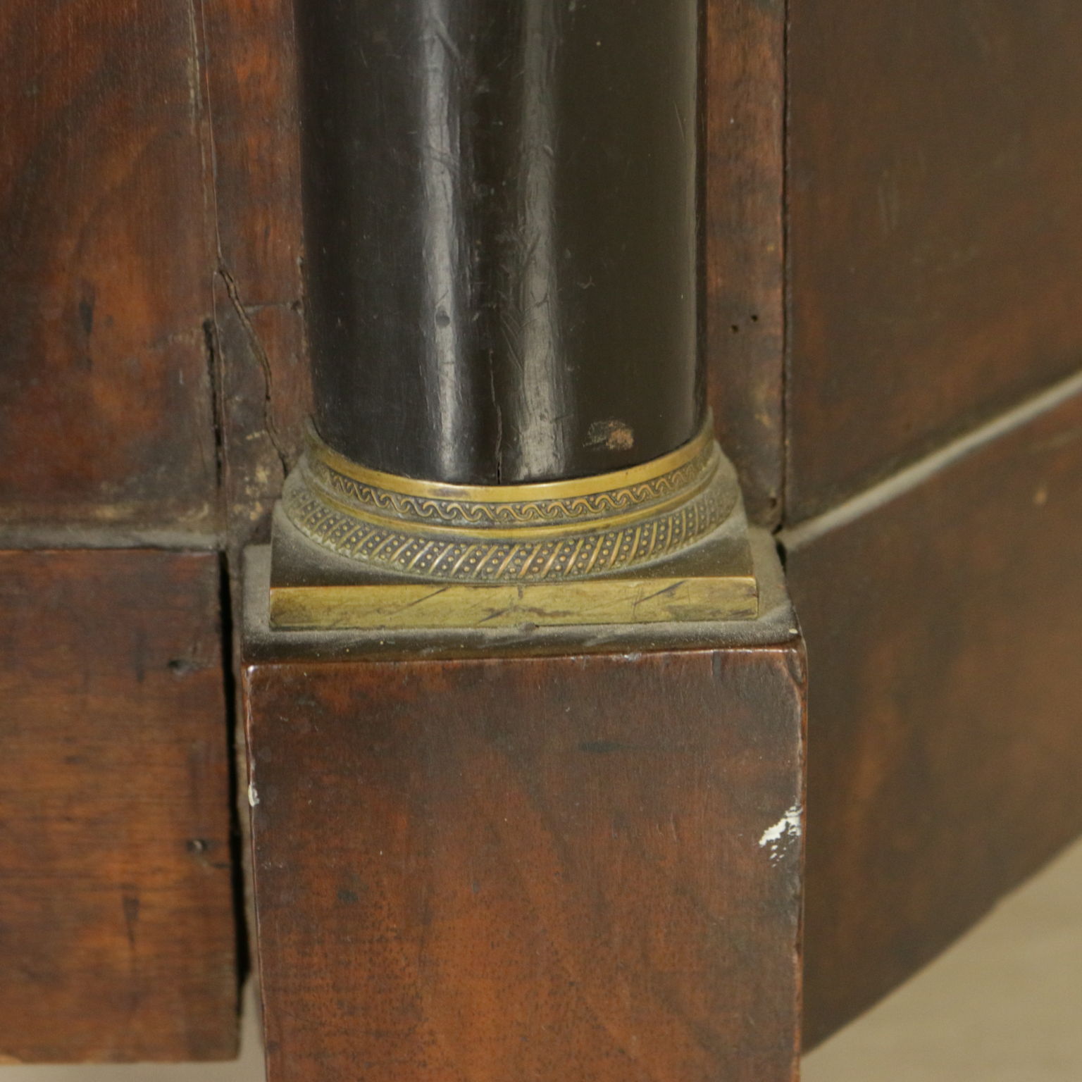 Schreibtisch aus der mitte der flanken abgerundete, präsentiert auf der front fünf schubladen und treppenhaus. Auf der rückseite pfosten mit halben säulen ebanizzate und kapitellen aus bronze gemeißelt. Elegante beschläge original. Plan ersetzt.