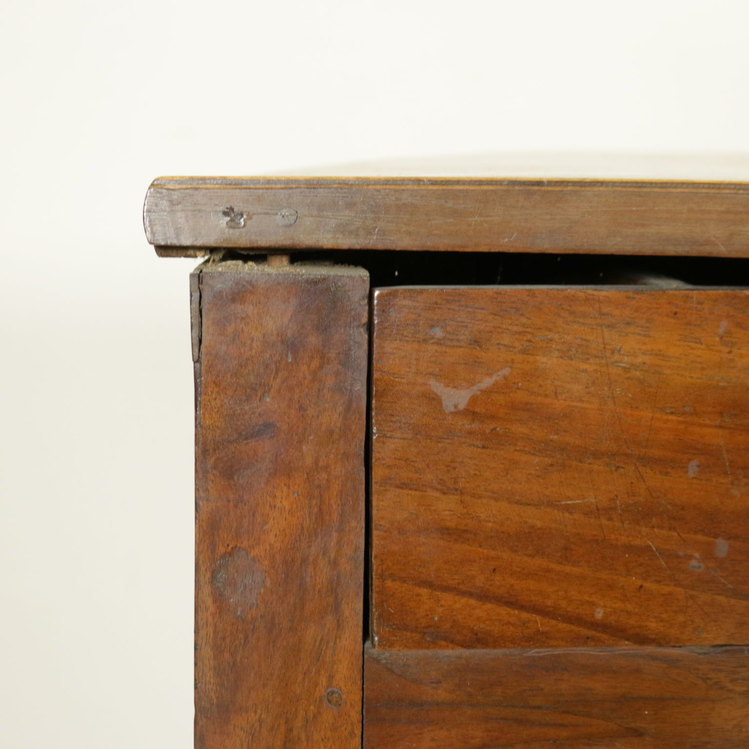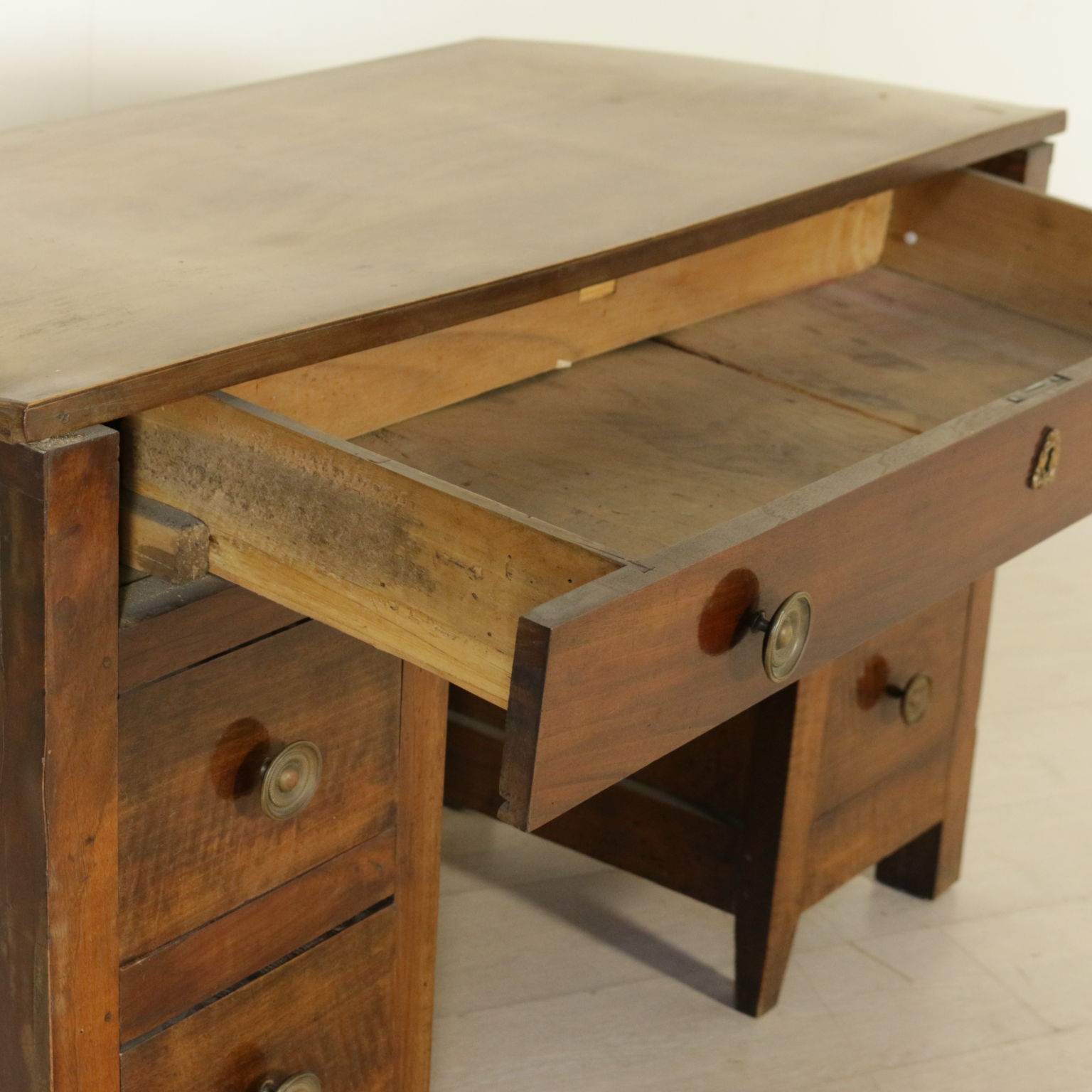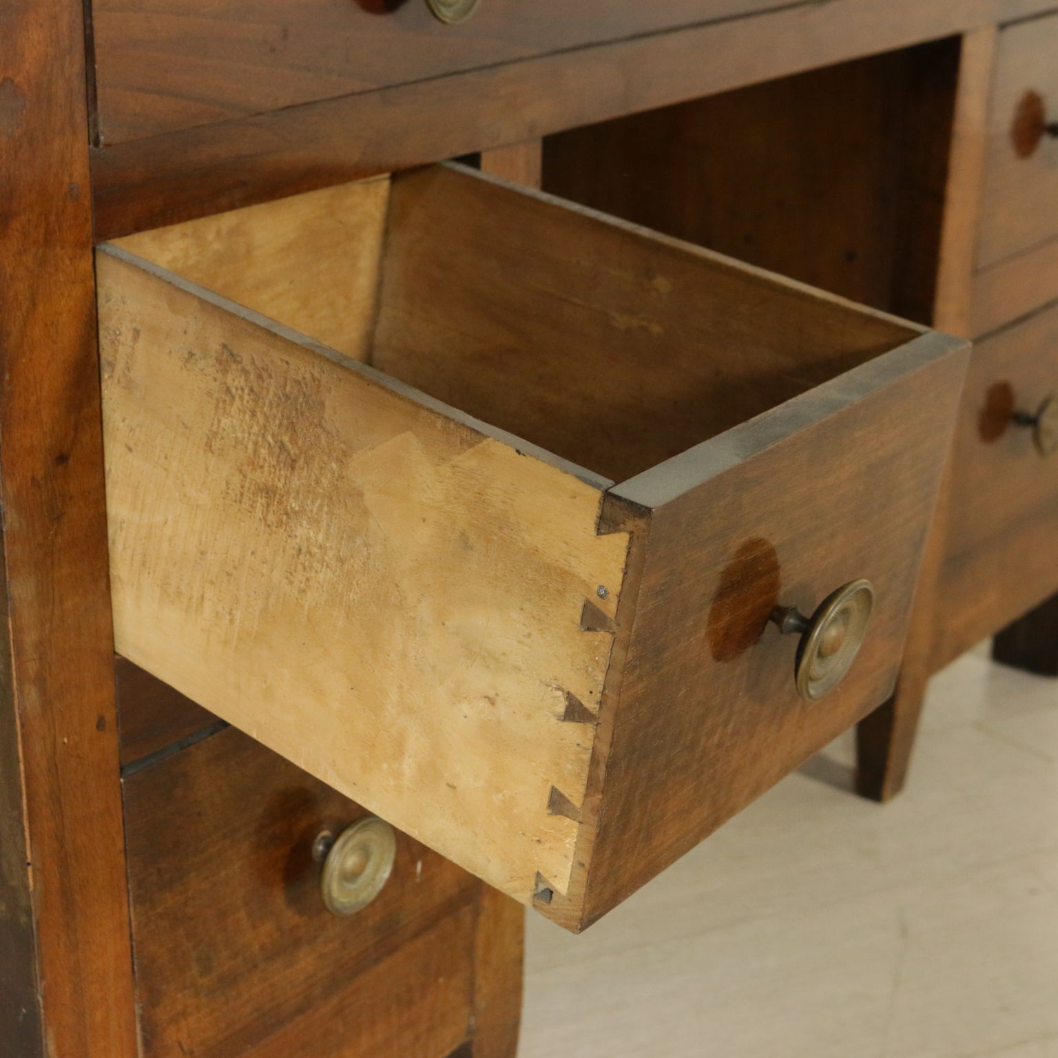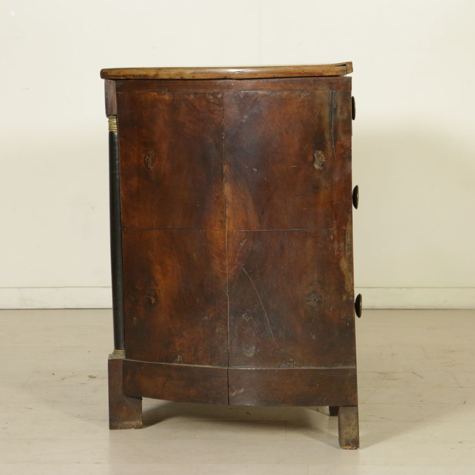 Schreibtisch aus der mitte der flanken abgerundete, präsentiert auf der front fünf schubladen und treppenhaus. Auf der rückseite pfosten mit halben säulen ebanizzate und kapitellen aus bronze gemeißelt. Elegante beschläge original. Plan ersetzt.
