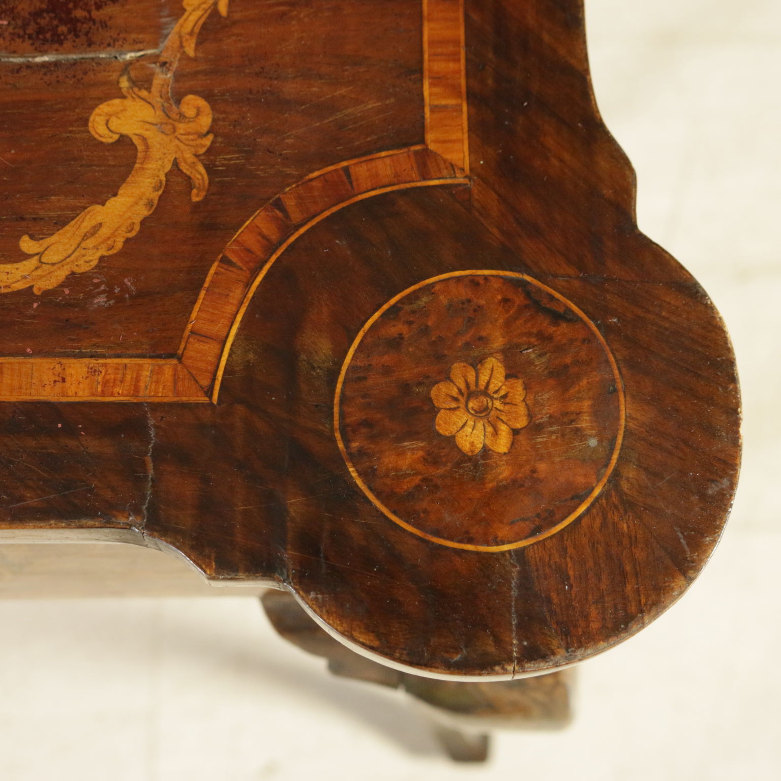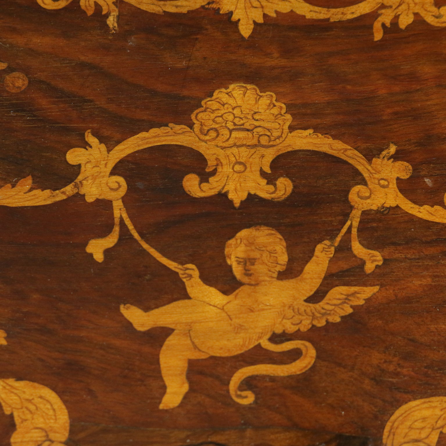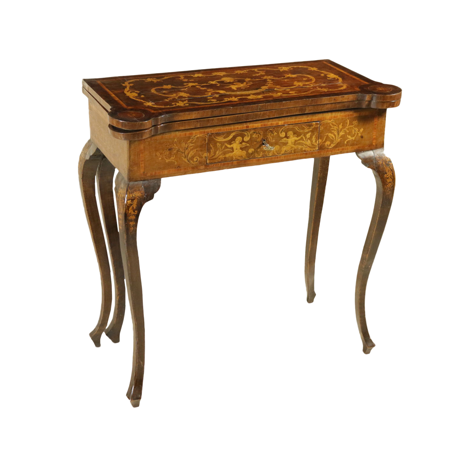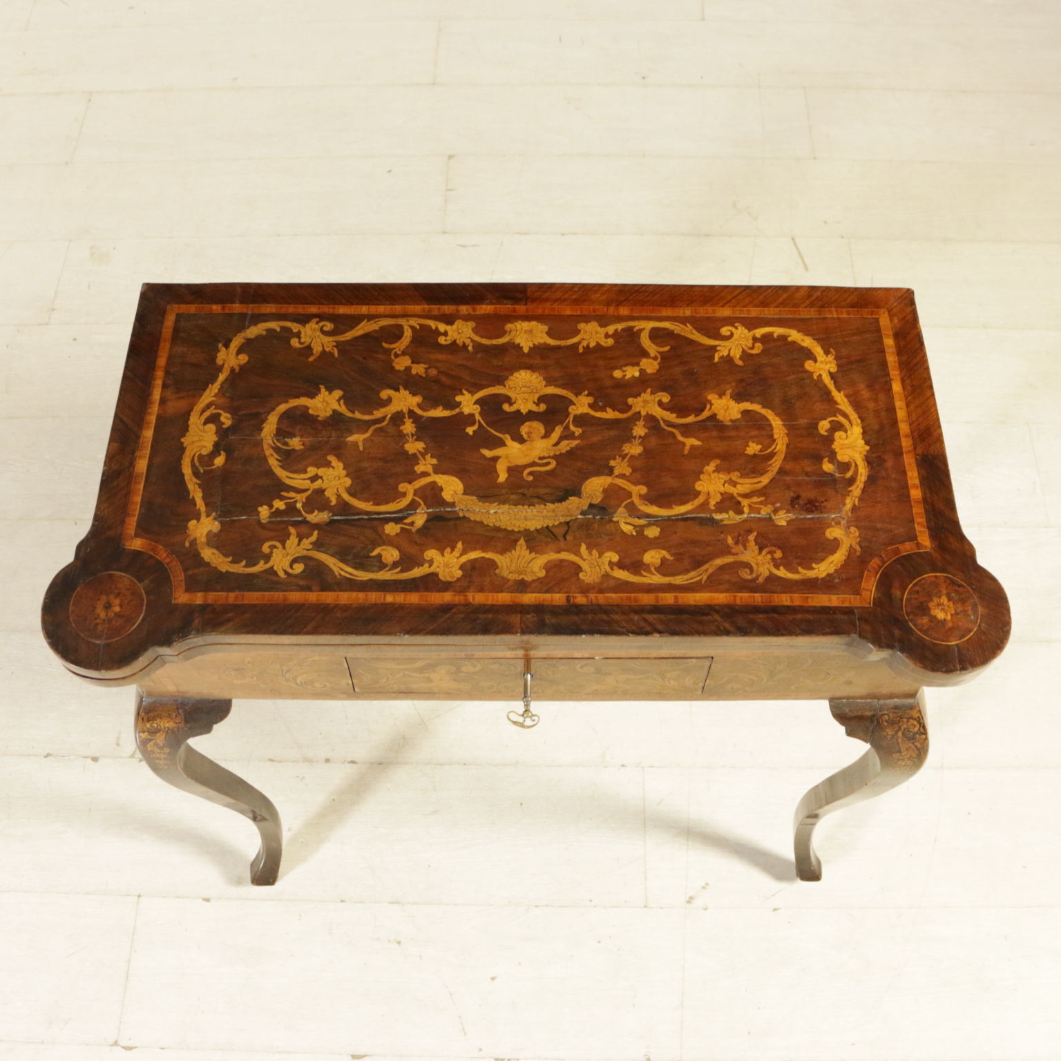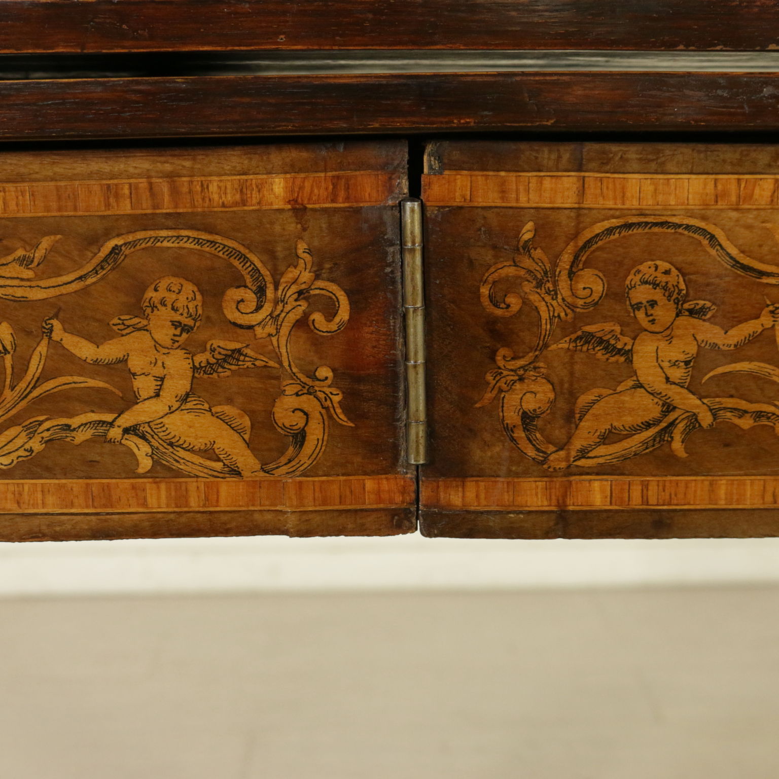 Montiert mit antikem holz, unterstützt durch beine bewegt, weist die schublade in der band. Plan geformten öffnung. Reich verziert mit putten und gründe fogliacei.