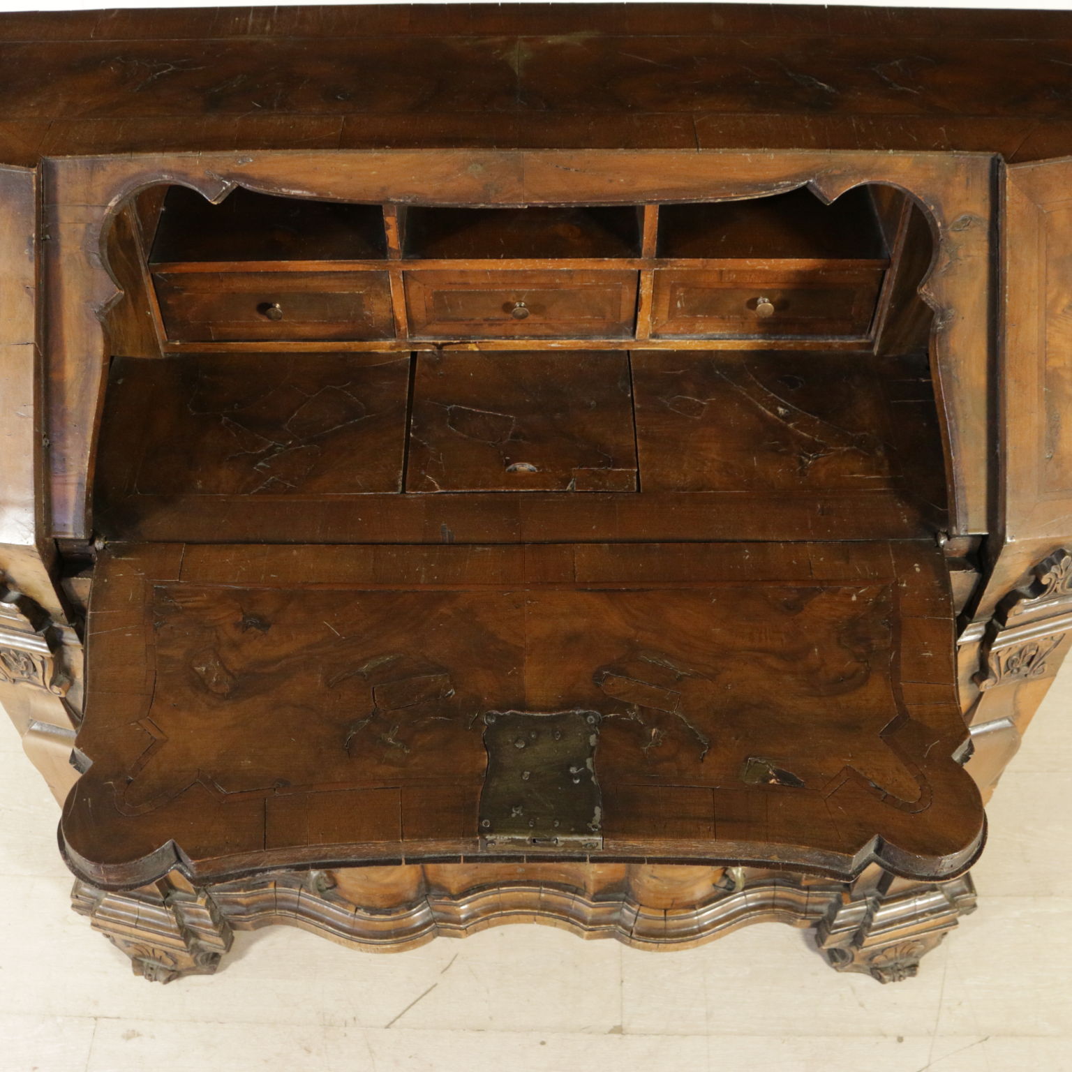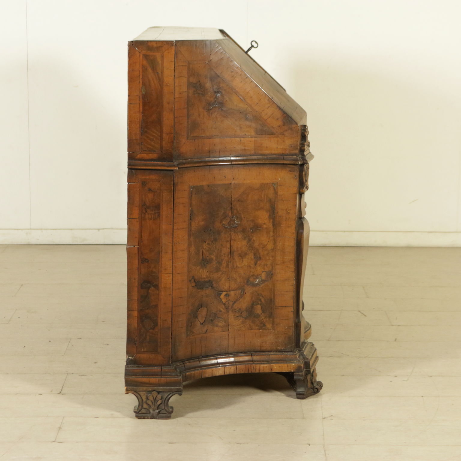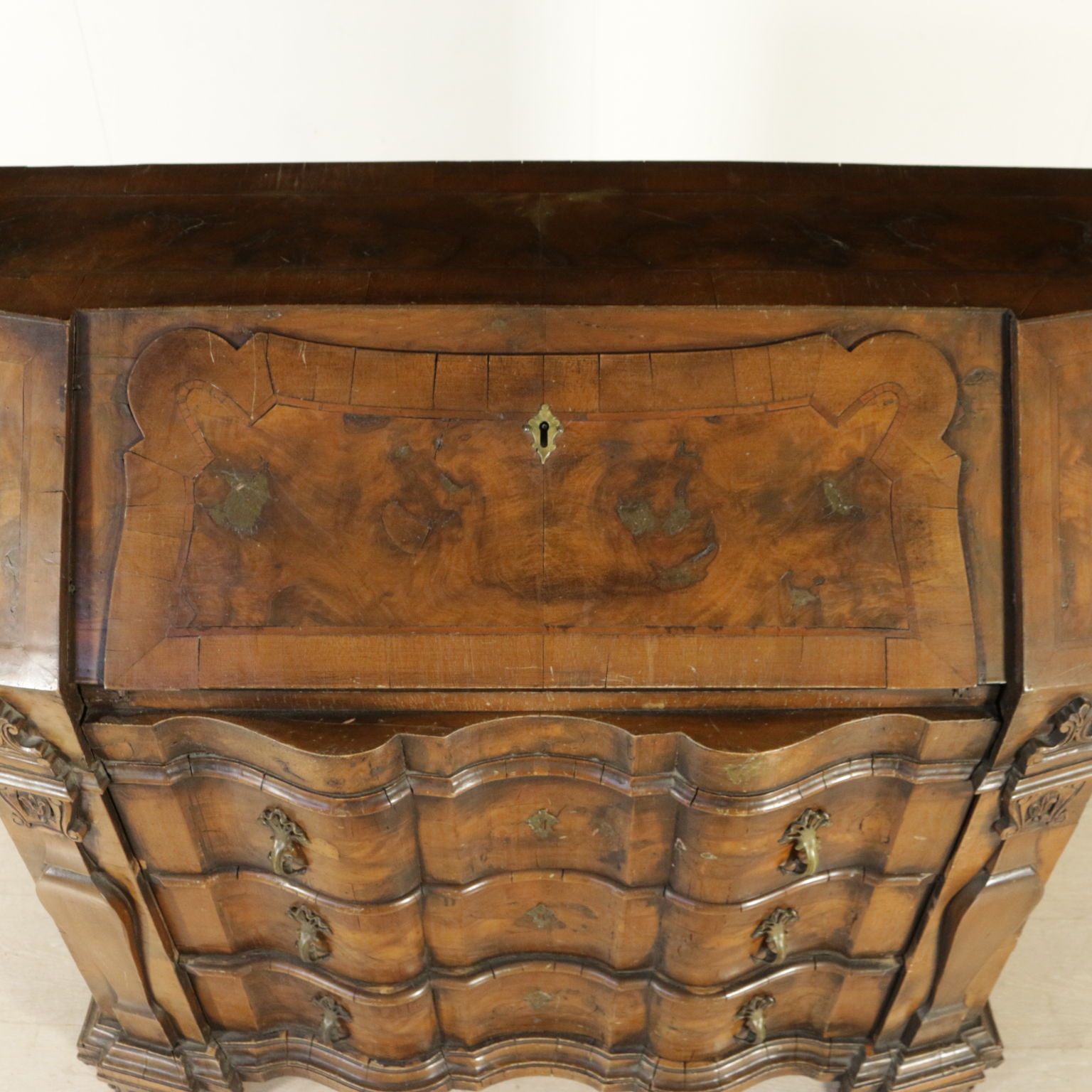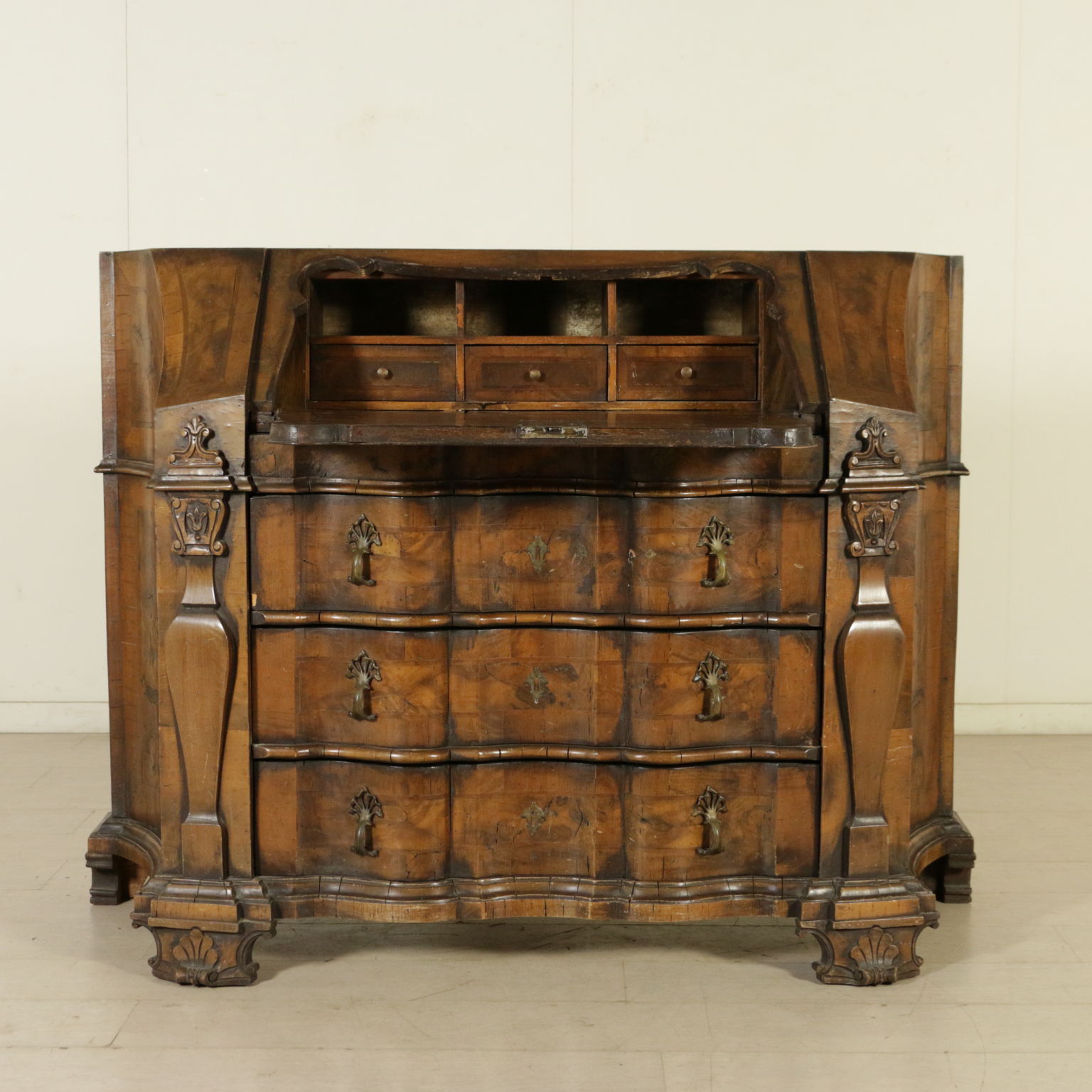 Nun wird sie in stil schritt auf der vorderseite und an den seiten mit drei schubladen und klappe, innen drei schubladen und fach. Schiebeplatte geheimnis. Platte nussbaum und wurzelholz nussbaum.