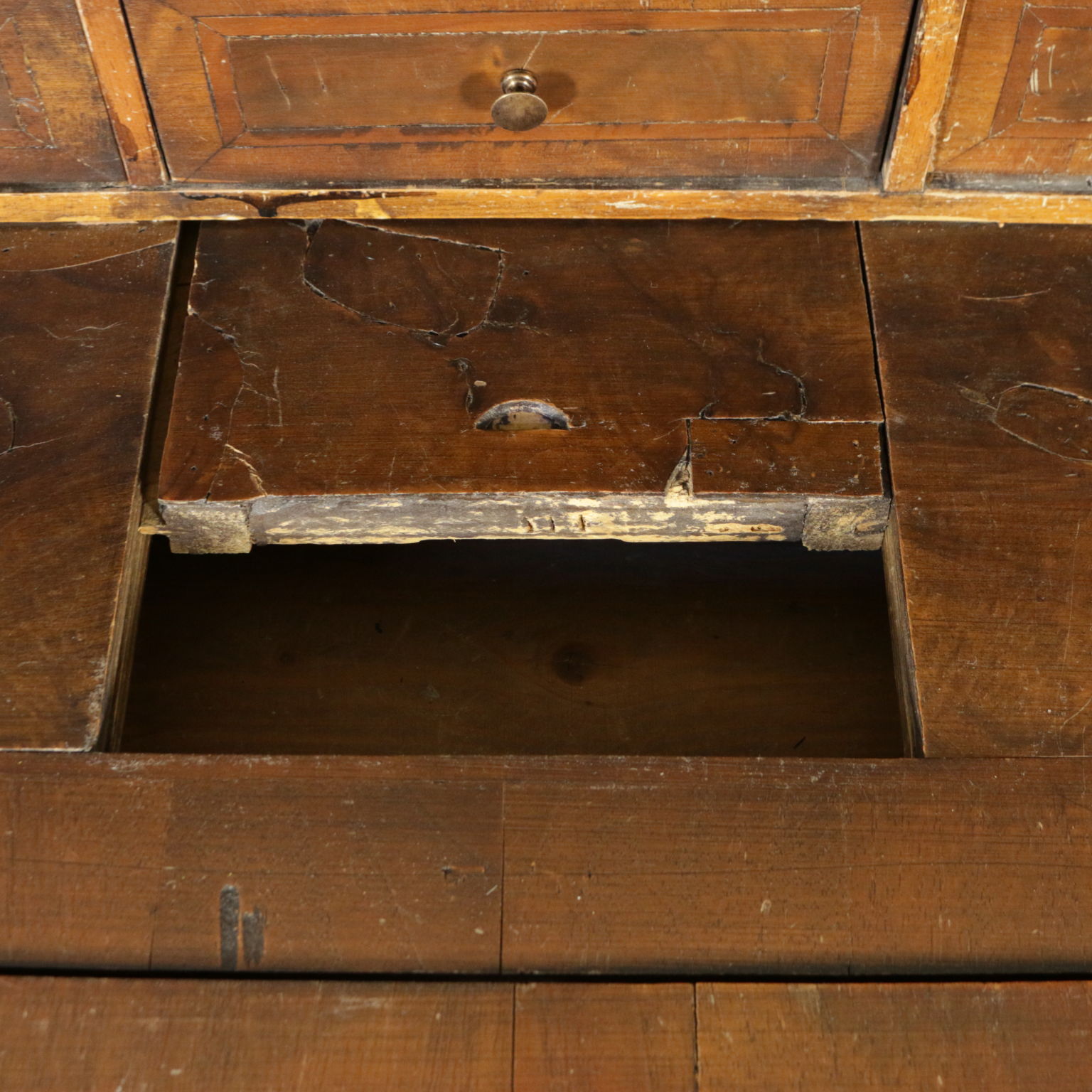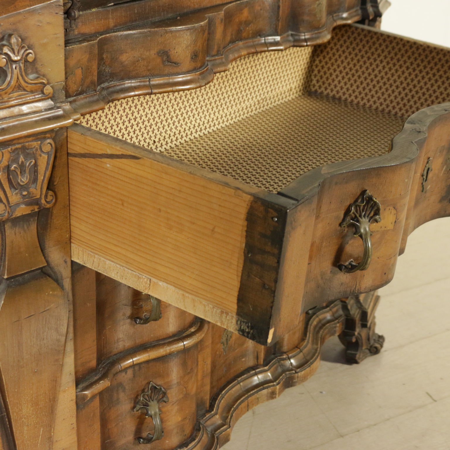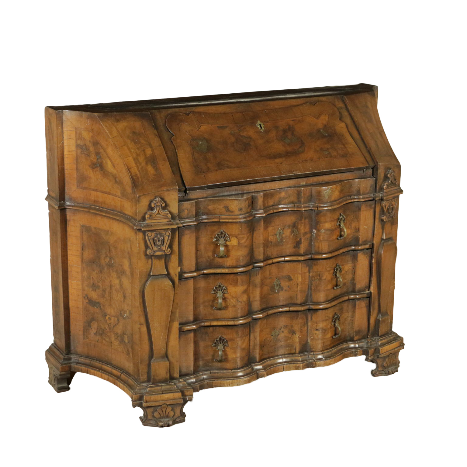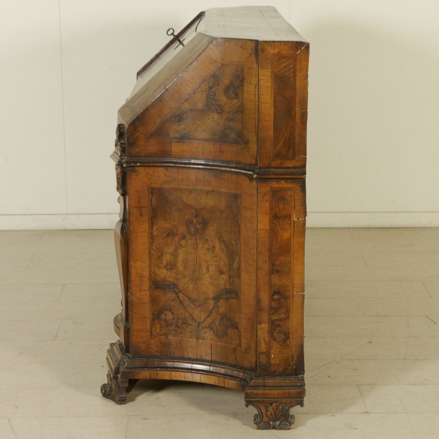 Nun wird sie in stil schritt auf der vorderseite und an den seiten mit drei schubladen und klappe, innen drei schubladen und fach. Schiebeplatte geheimnis. Platte nussbaum und wurzelholz nussbaum.