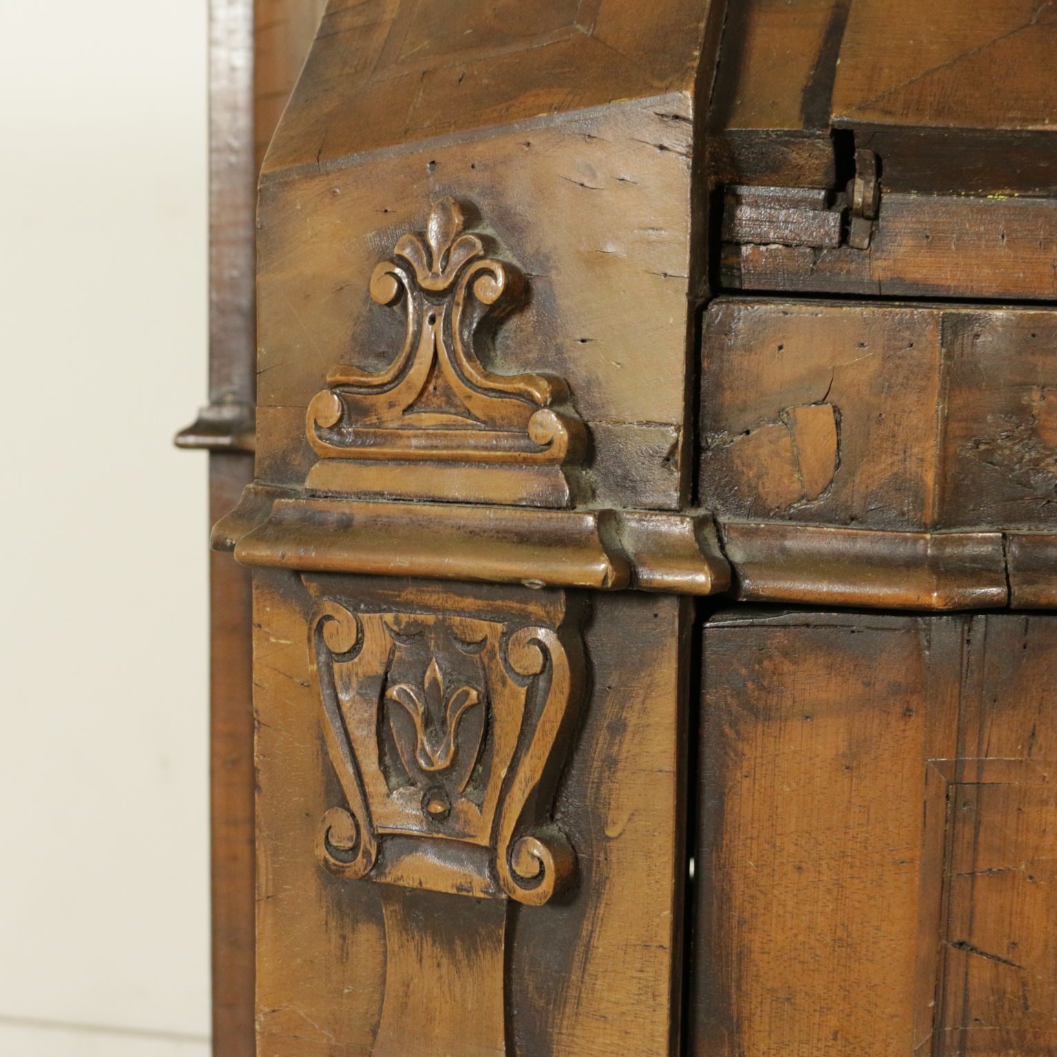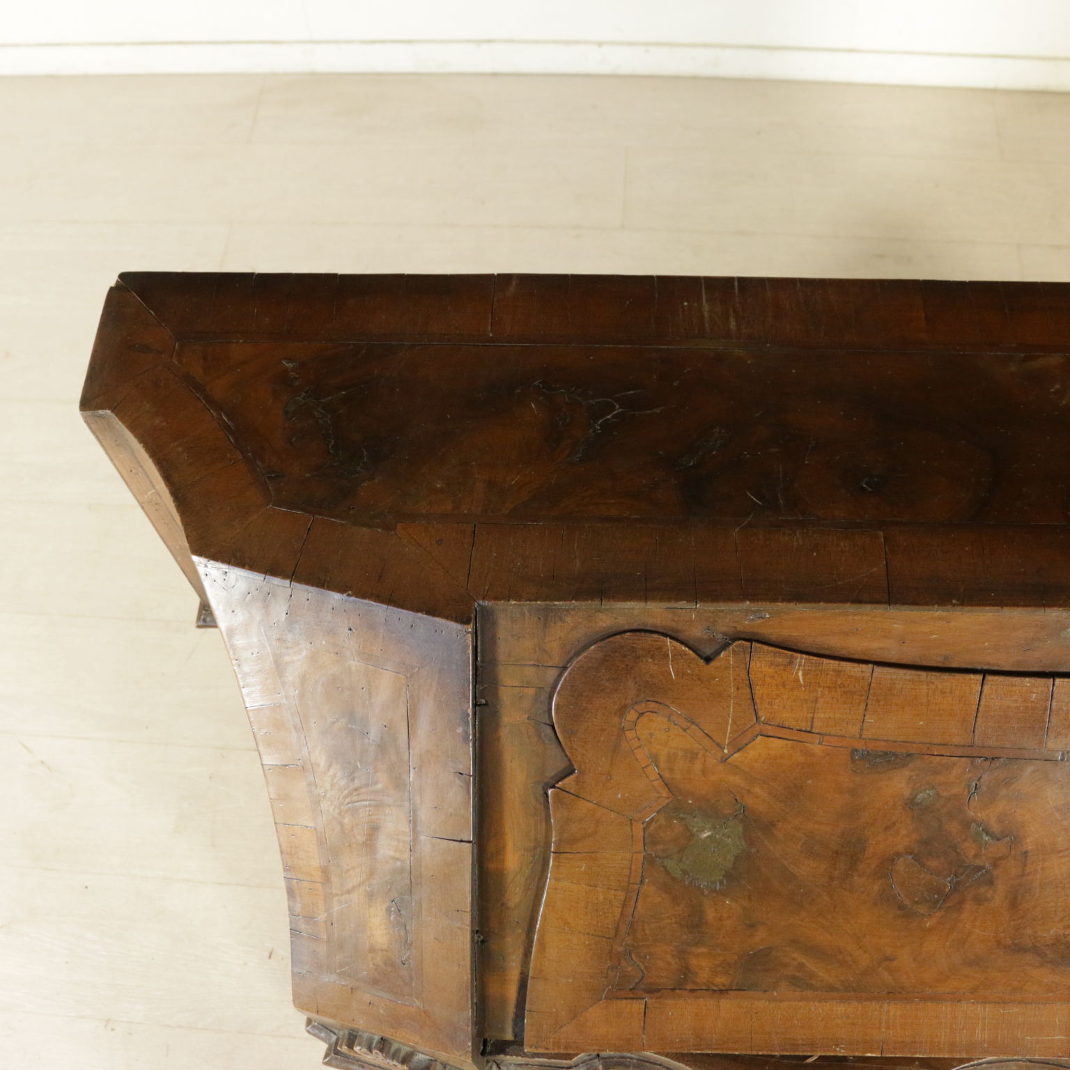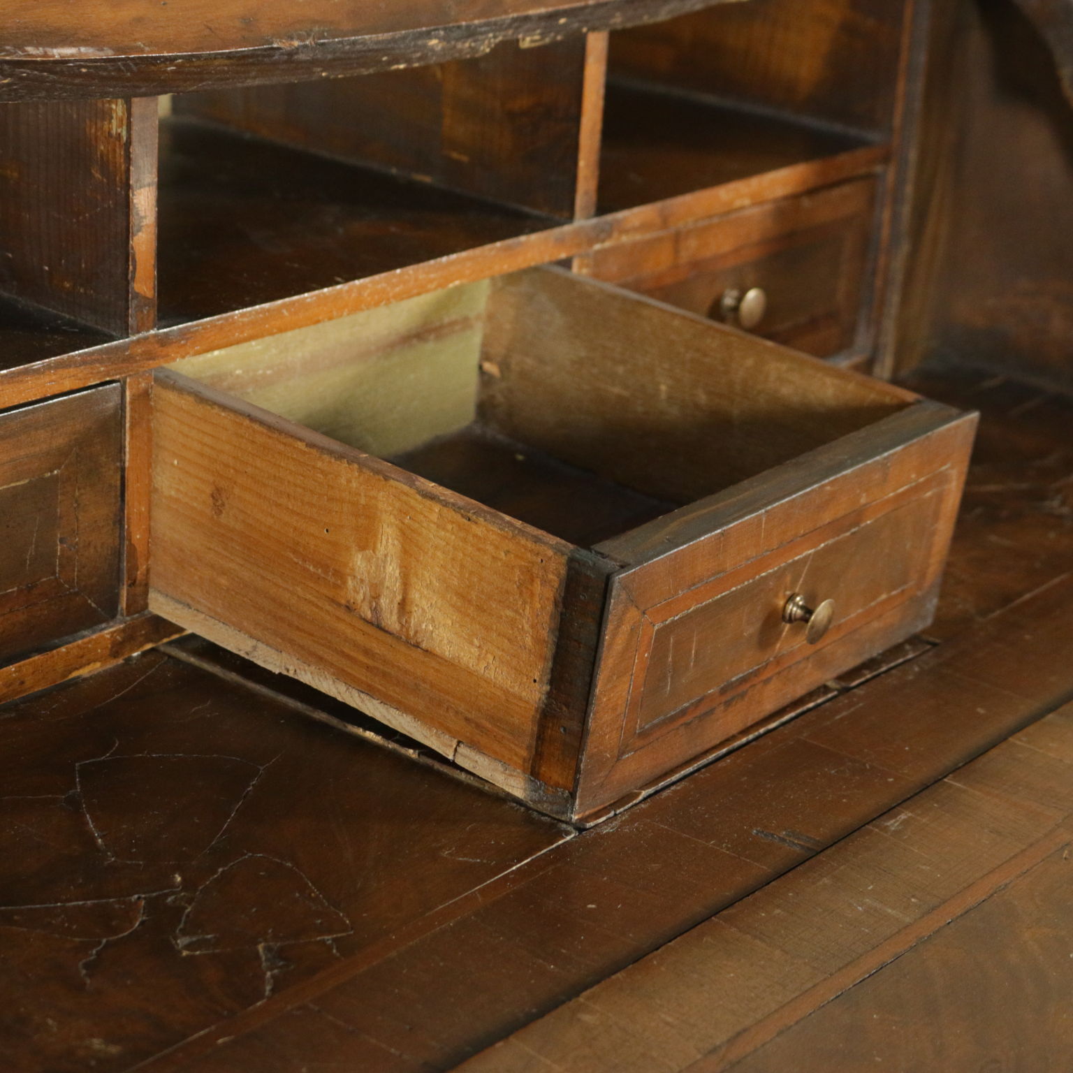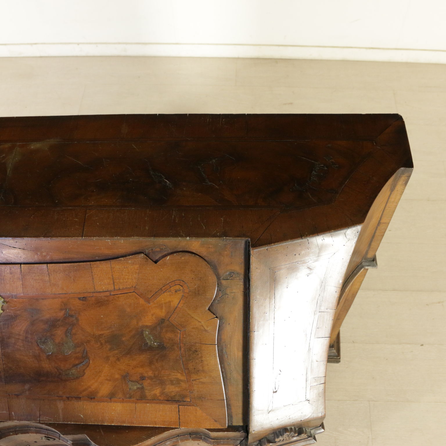 Nun wird sie in stil schritt auf der vorderseite und an den seiten mit drei schubladen und klappe, innen drei schubladen und fach. Schiebeplatte geheimnis. Platte nussbaum und wurzelholz nussbaum.