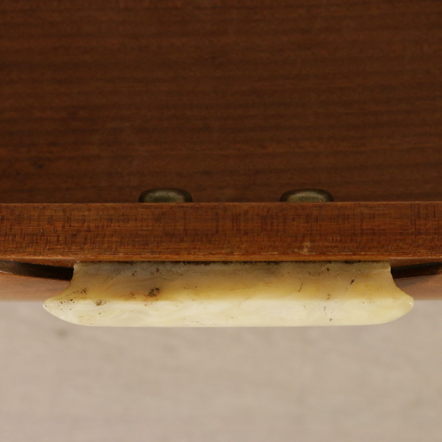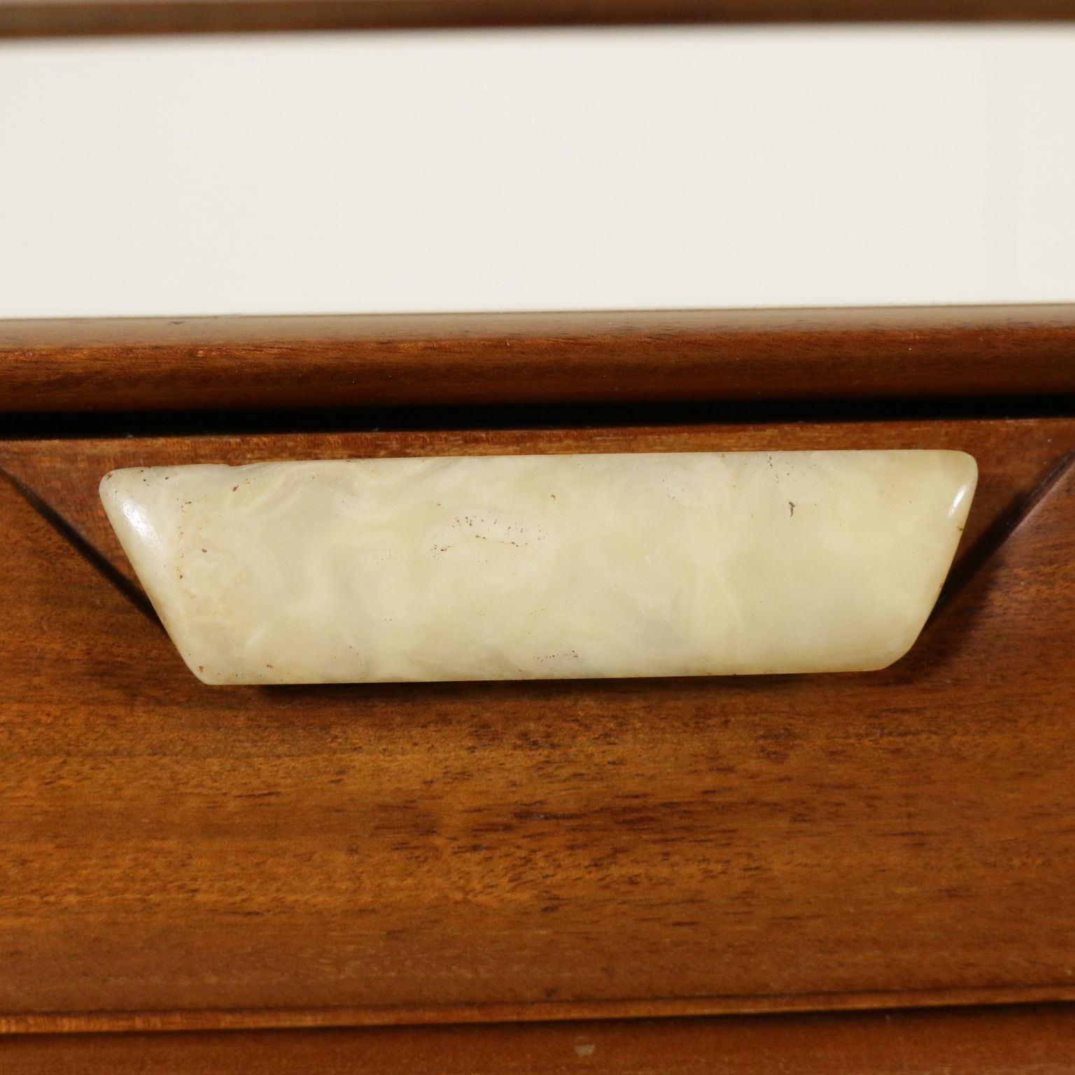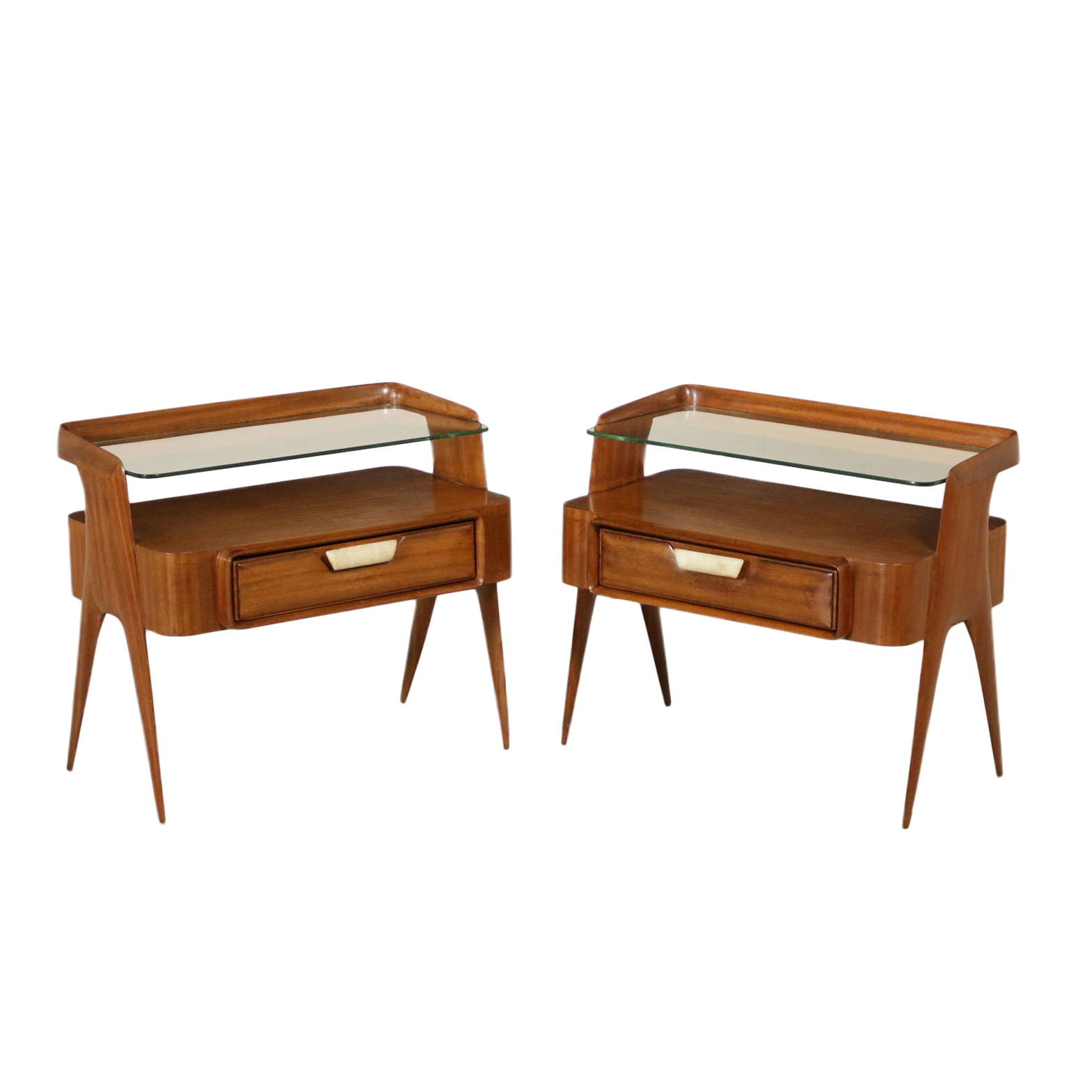 Coppia di comodini; legno impiallacciato mogano, vetro, maniglia in onice.