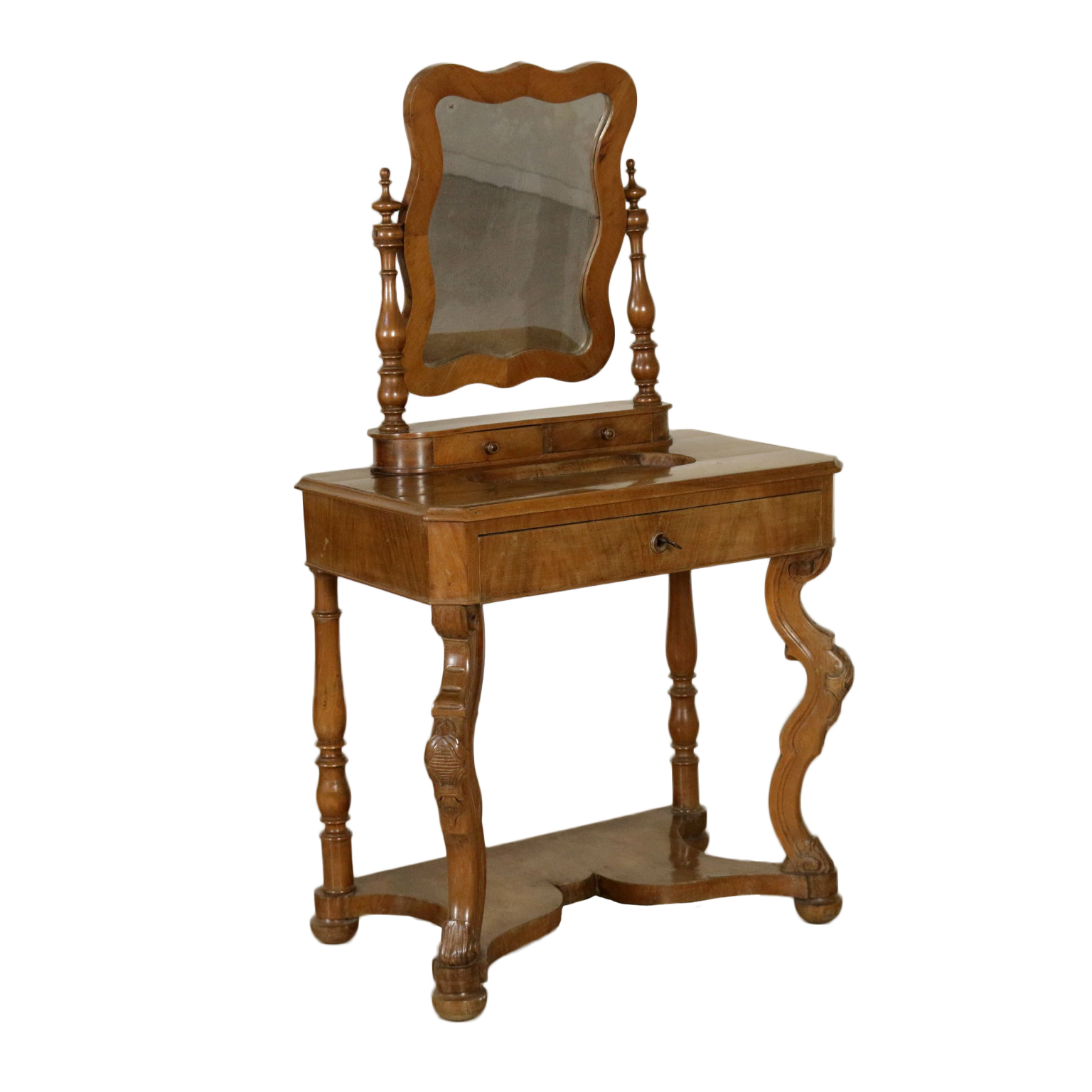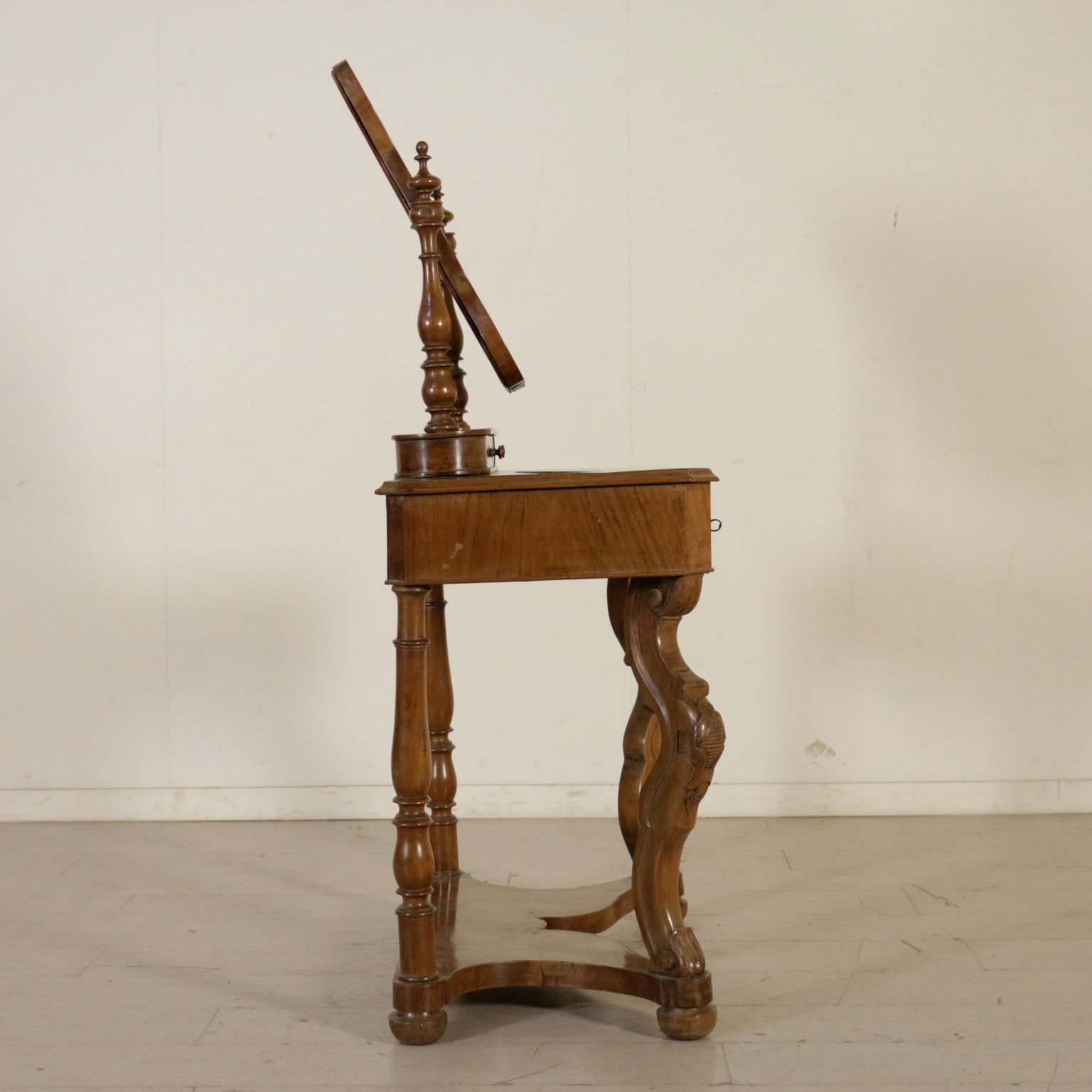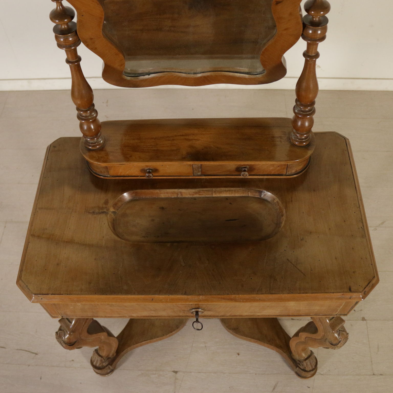 Unterstützt durch beine bewegt und geschnitzt und weist eine schublade und eine piano-fach. Hochbeet mit spiegel und zwei cassettini.