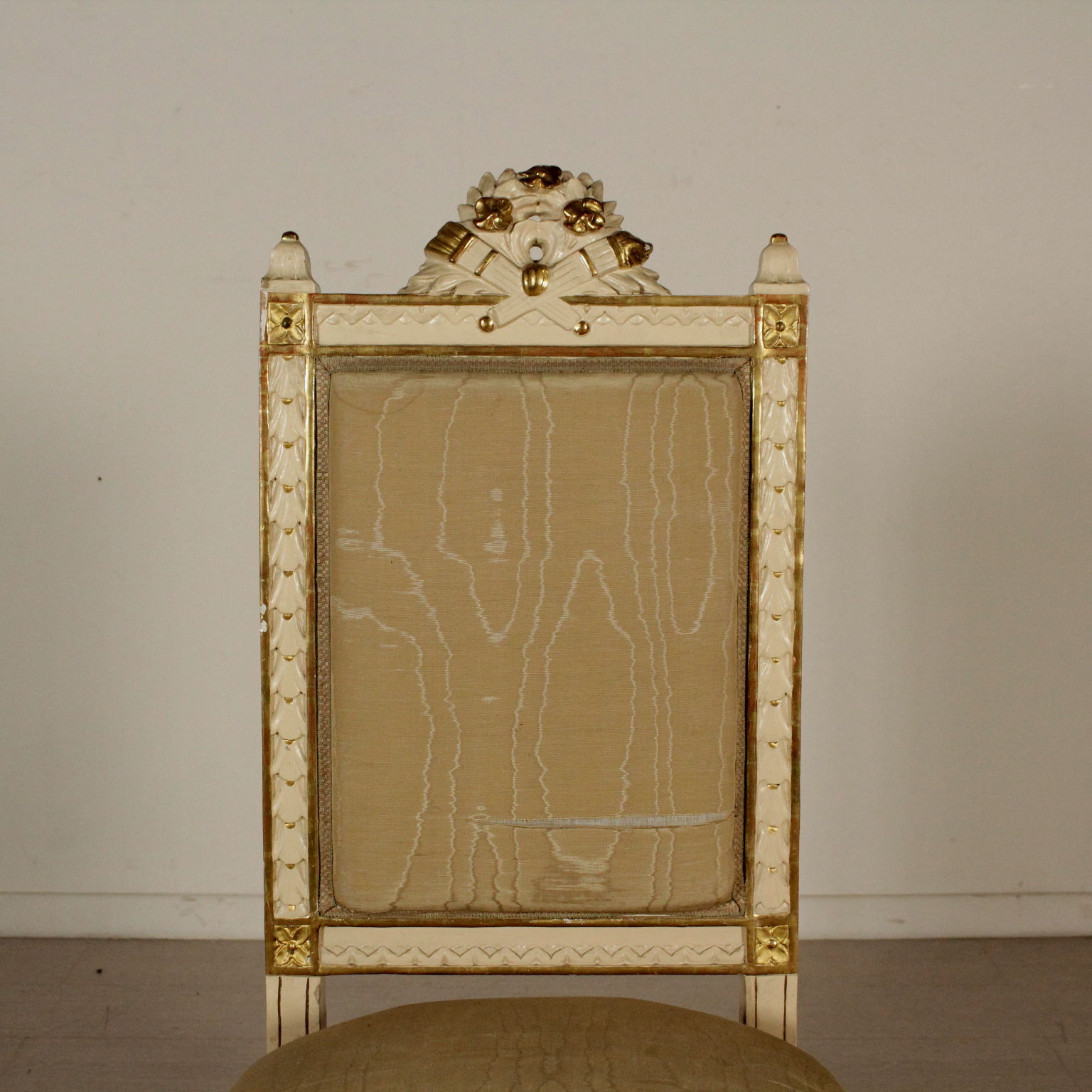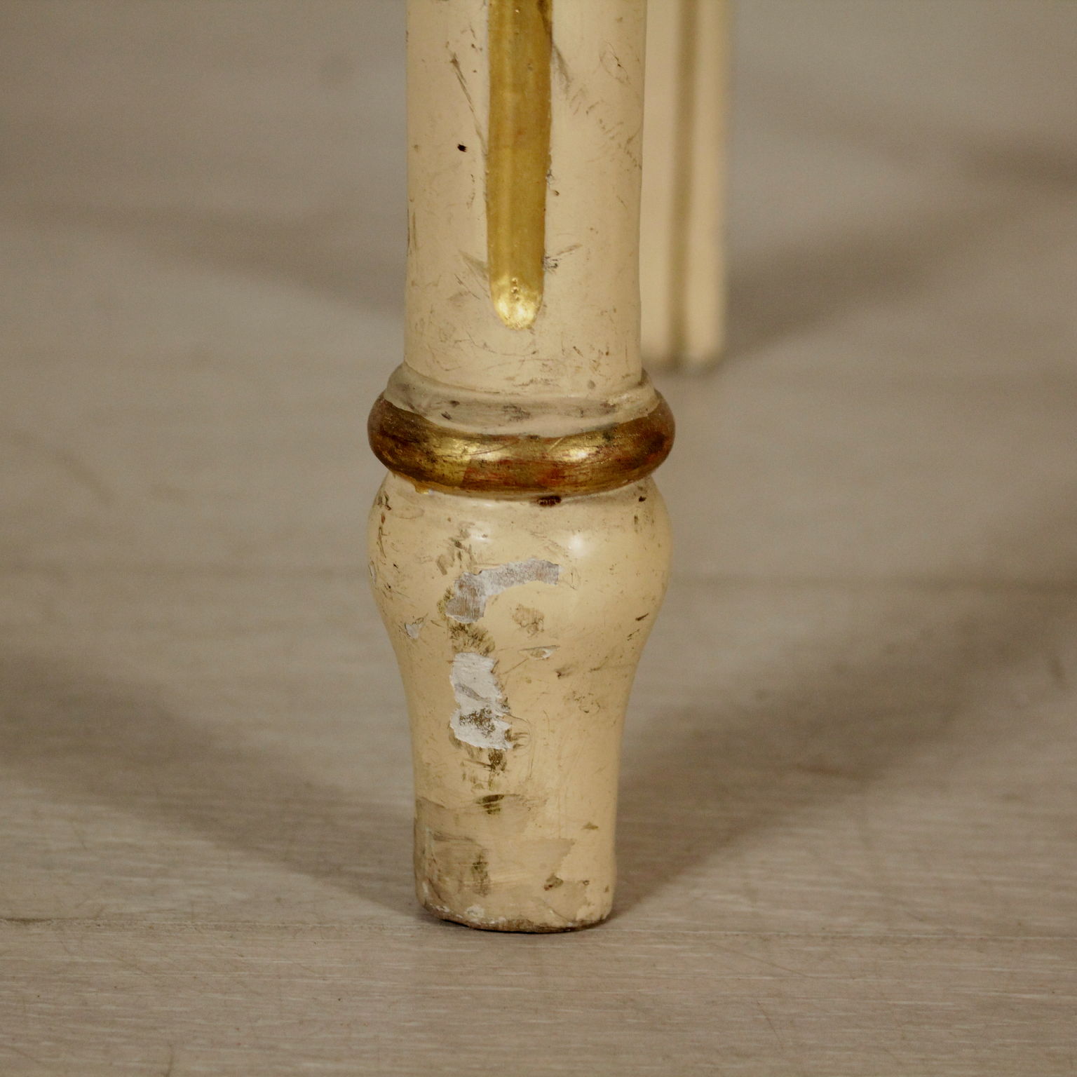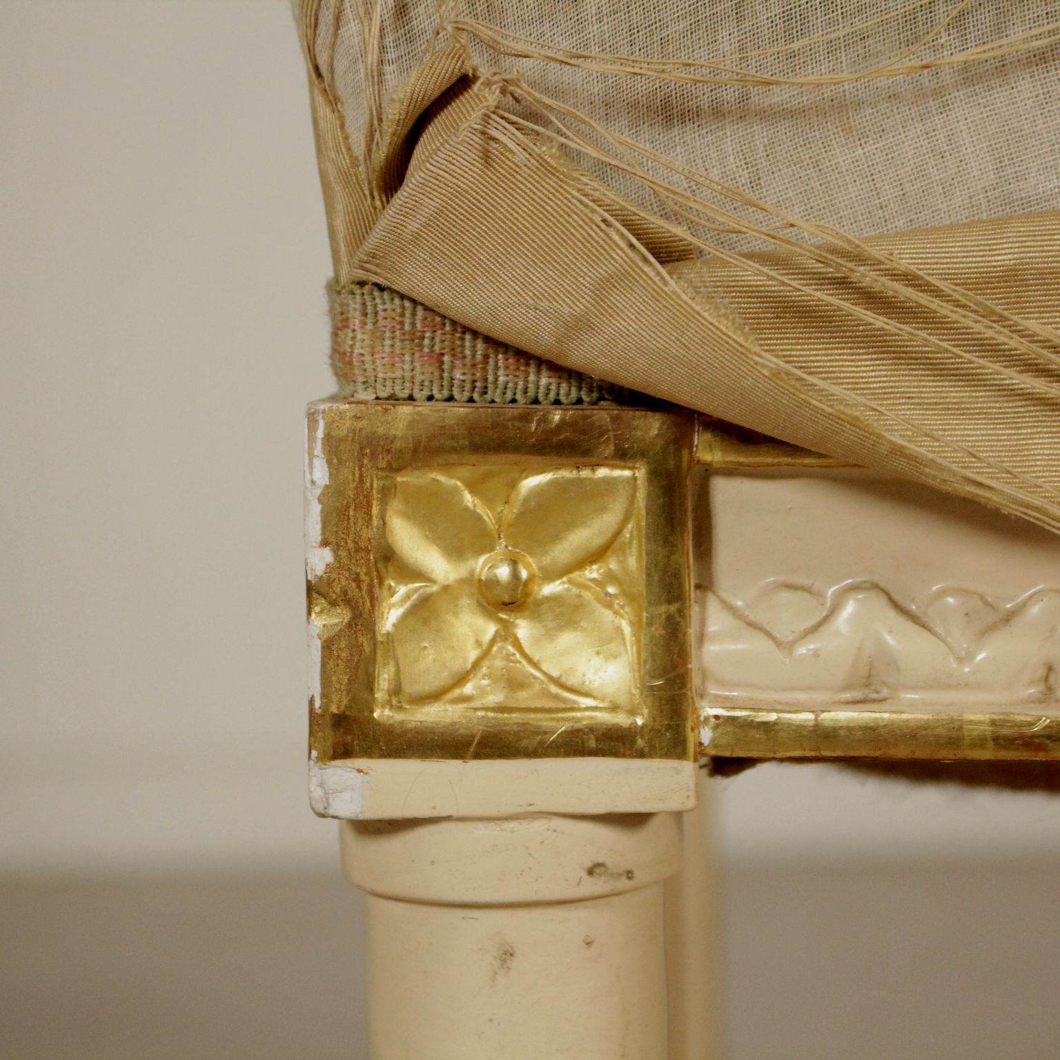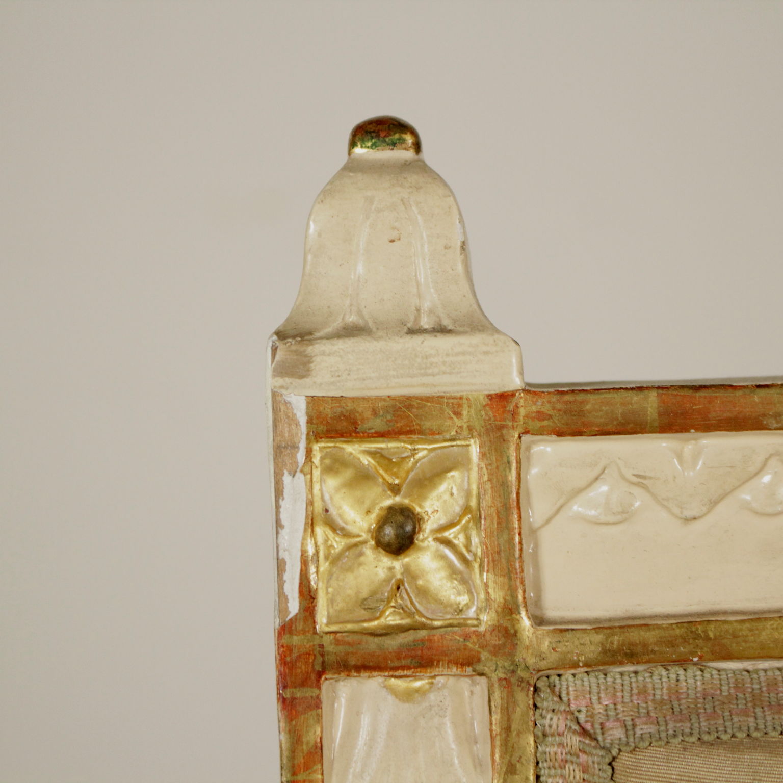 Beine gedreht, rückenlehne geschnitzt. Sitz und rückenlehne gepolstert. Lackiert und vergoldet.