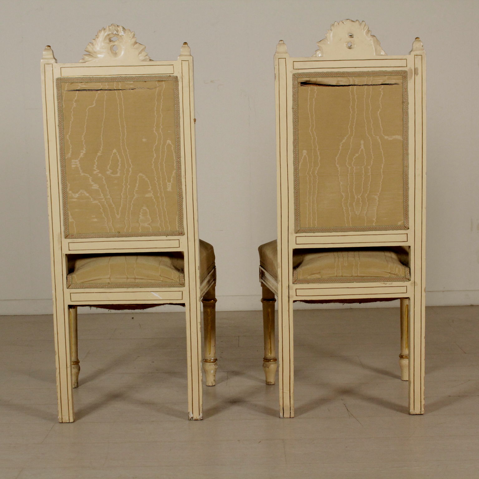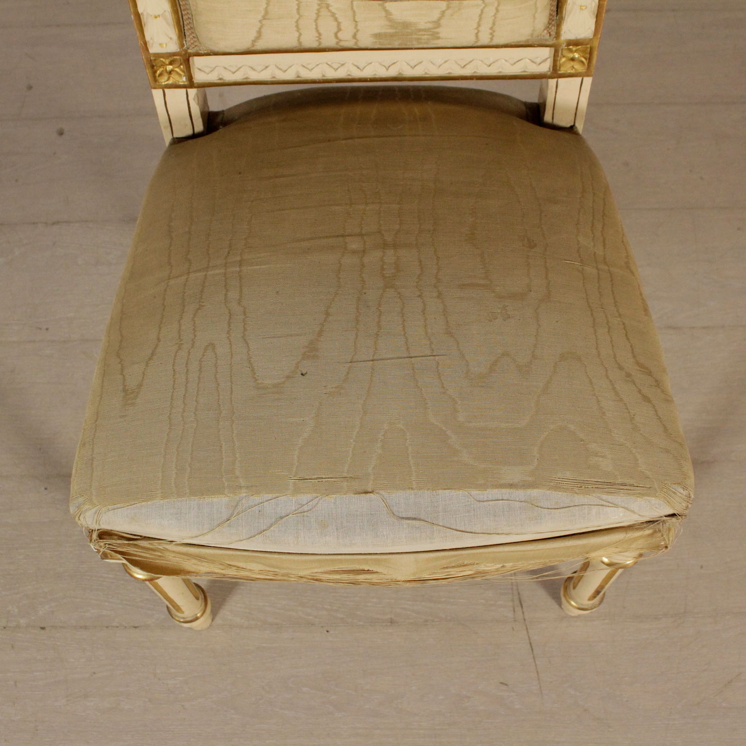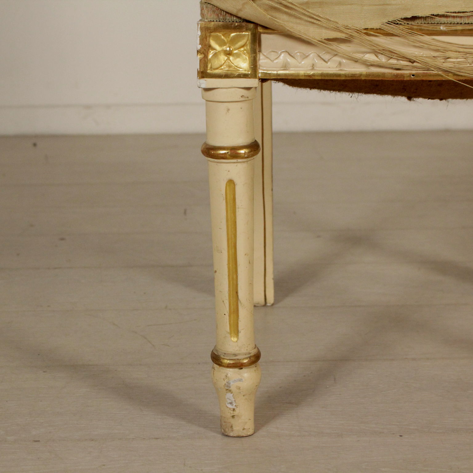 Beine gedreht, rückenlehne geschnitzt. Sitz und rückenlehne gepolstert. Lackiert und vergoldet.