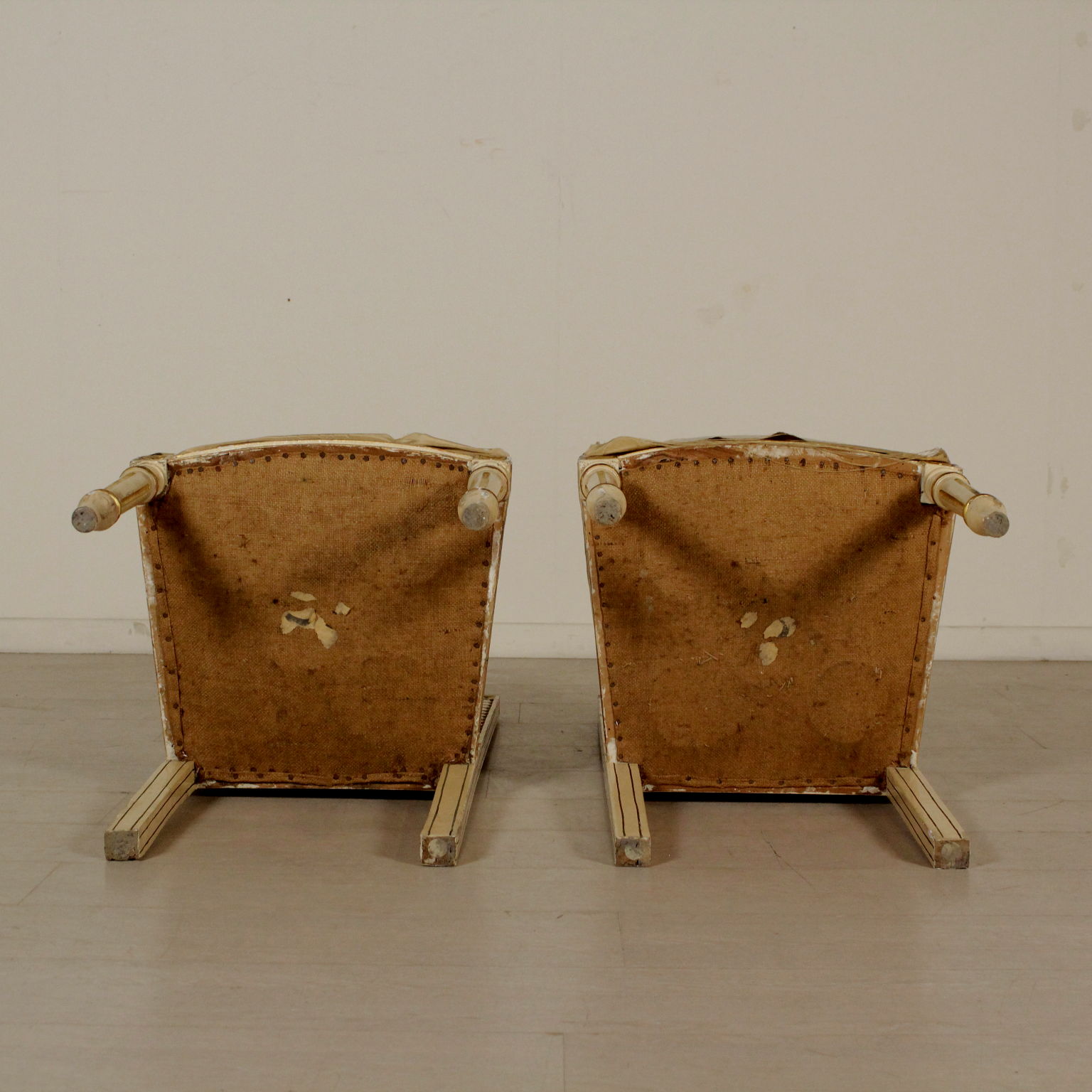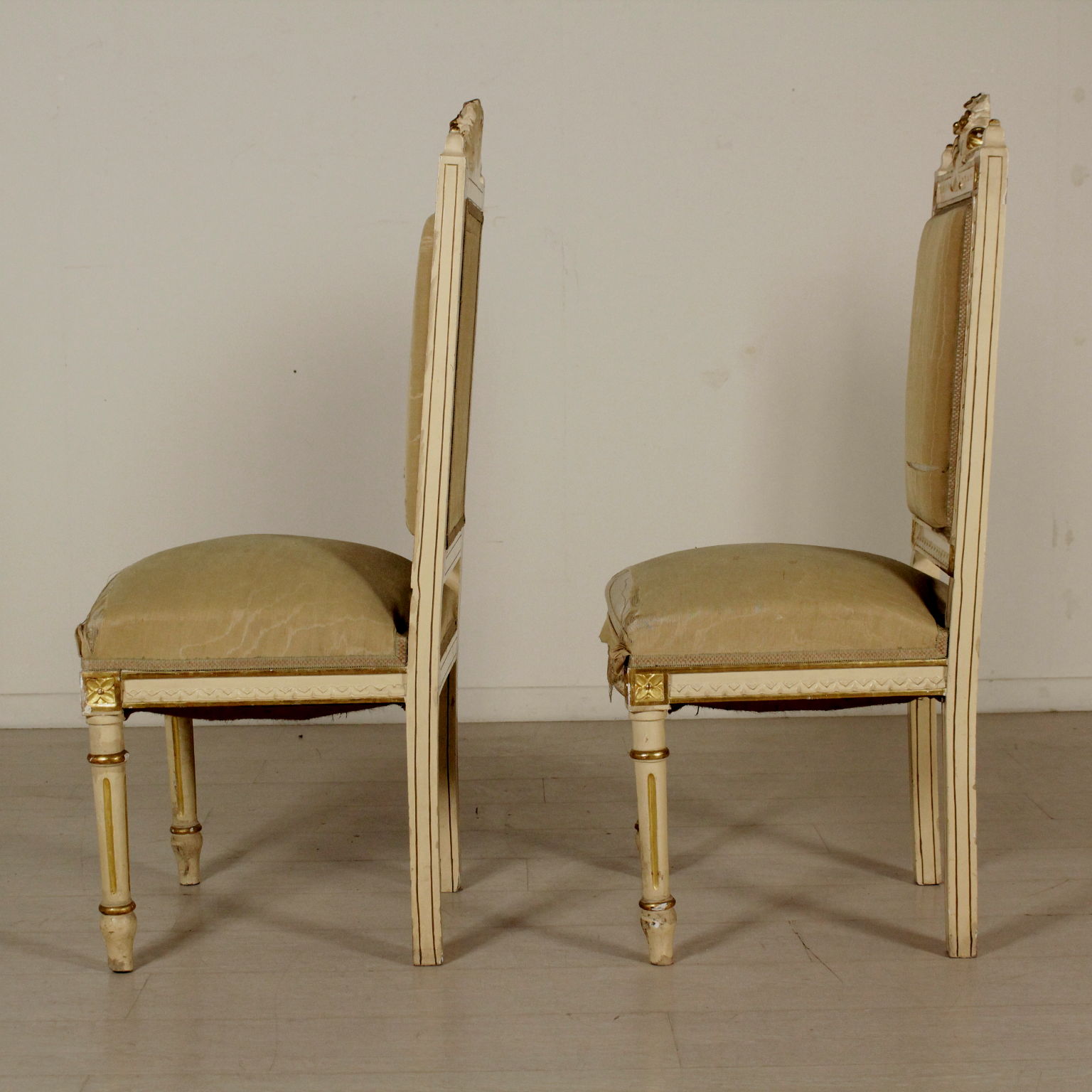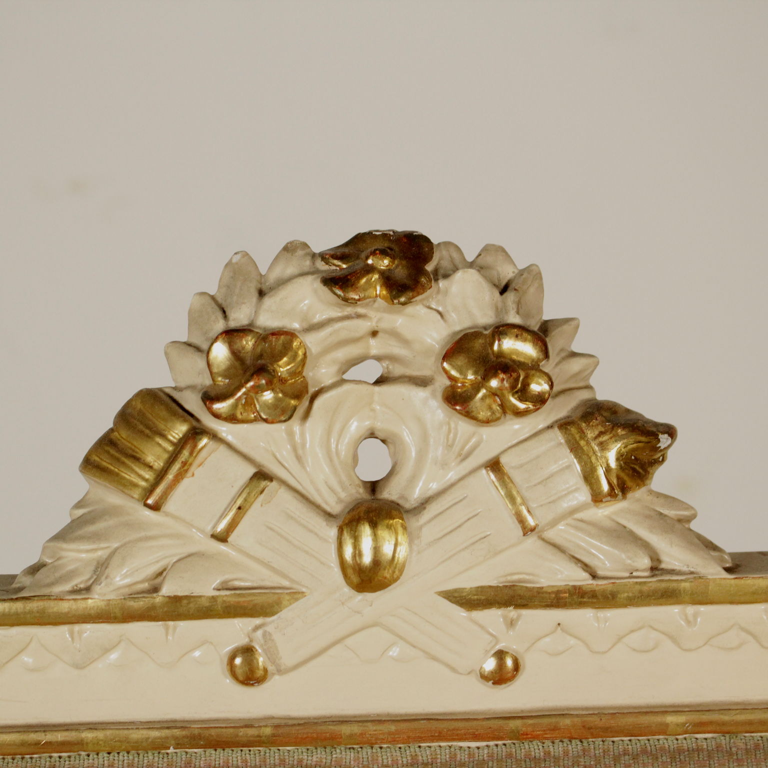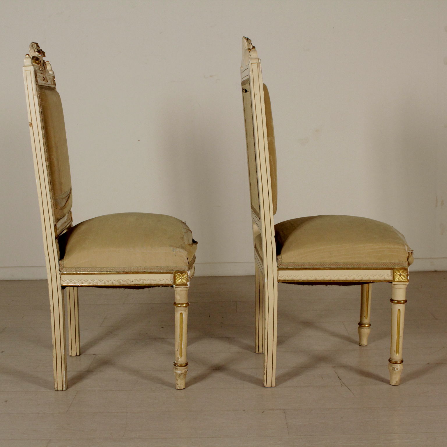 Beine gedreht, rückenlehne geschnitzt. Sitz und rückenlehne gepolstert. Lackiert und vergoldet.