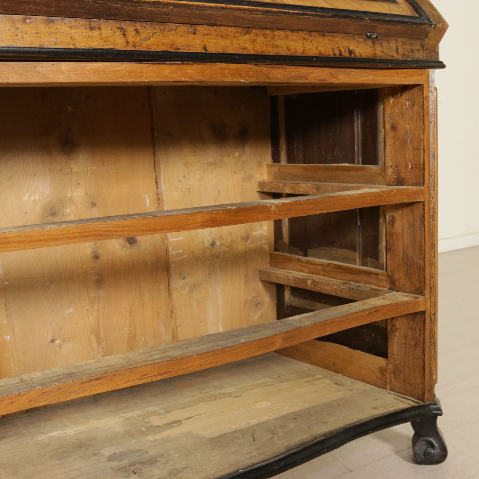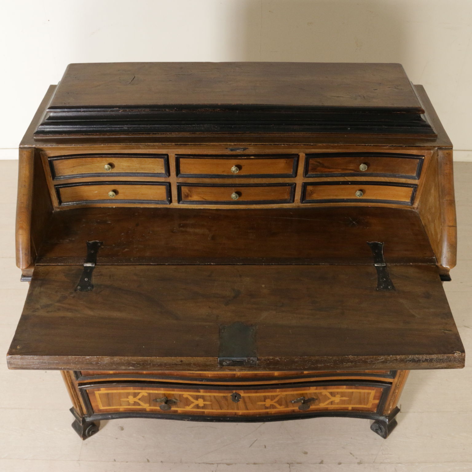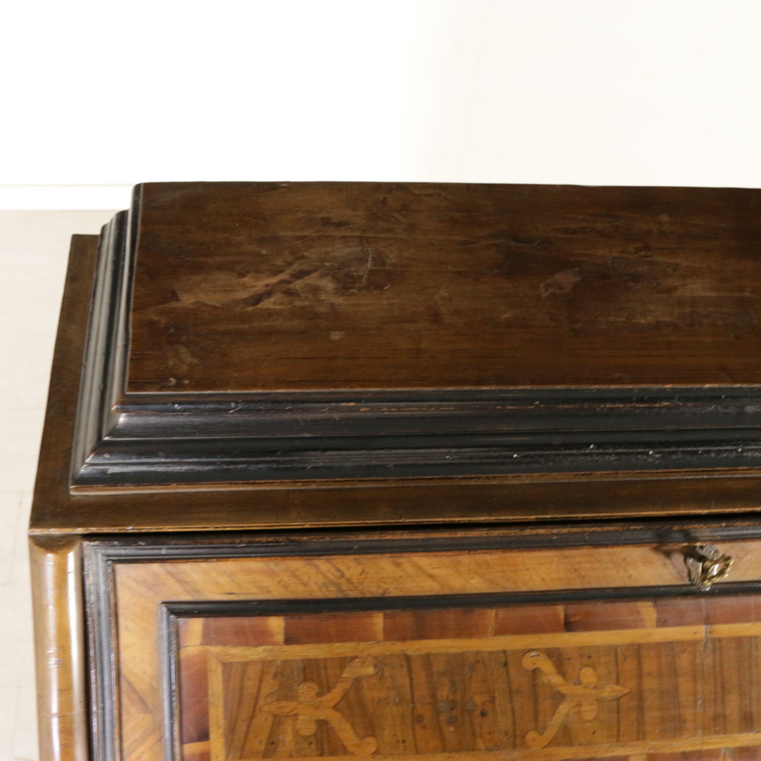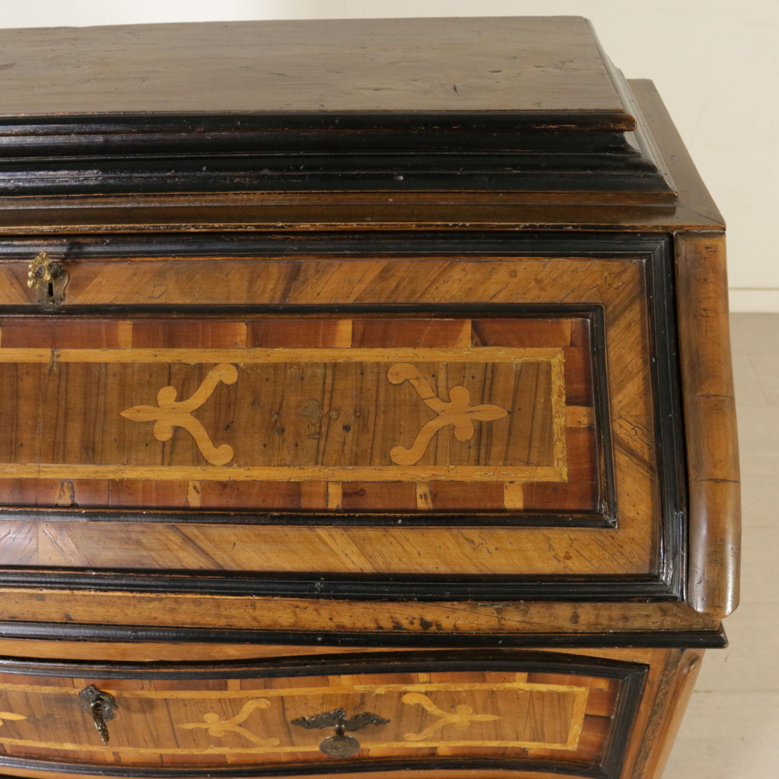 Bewegung auf der vorderseite, hat drei schubladen und eine klappe. Innerhalb von sechs cassettini. Aufkantung an der urne mit plan aufklappbar, rahmen ebanizzate und intarsien in ahorn. Aufrichtig fuß zu locken ebanizzati. Zusammengebaut mit altem material.