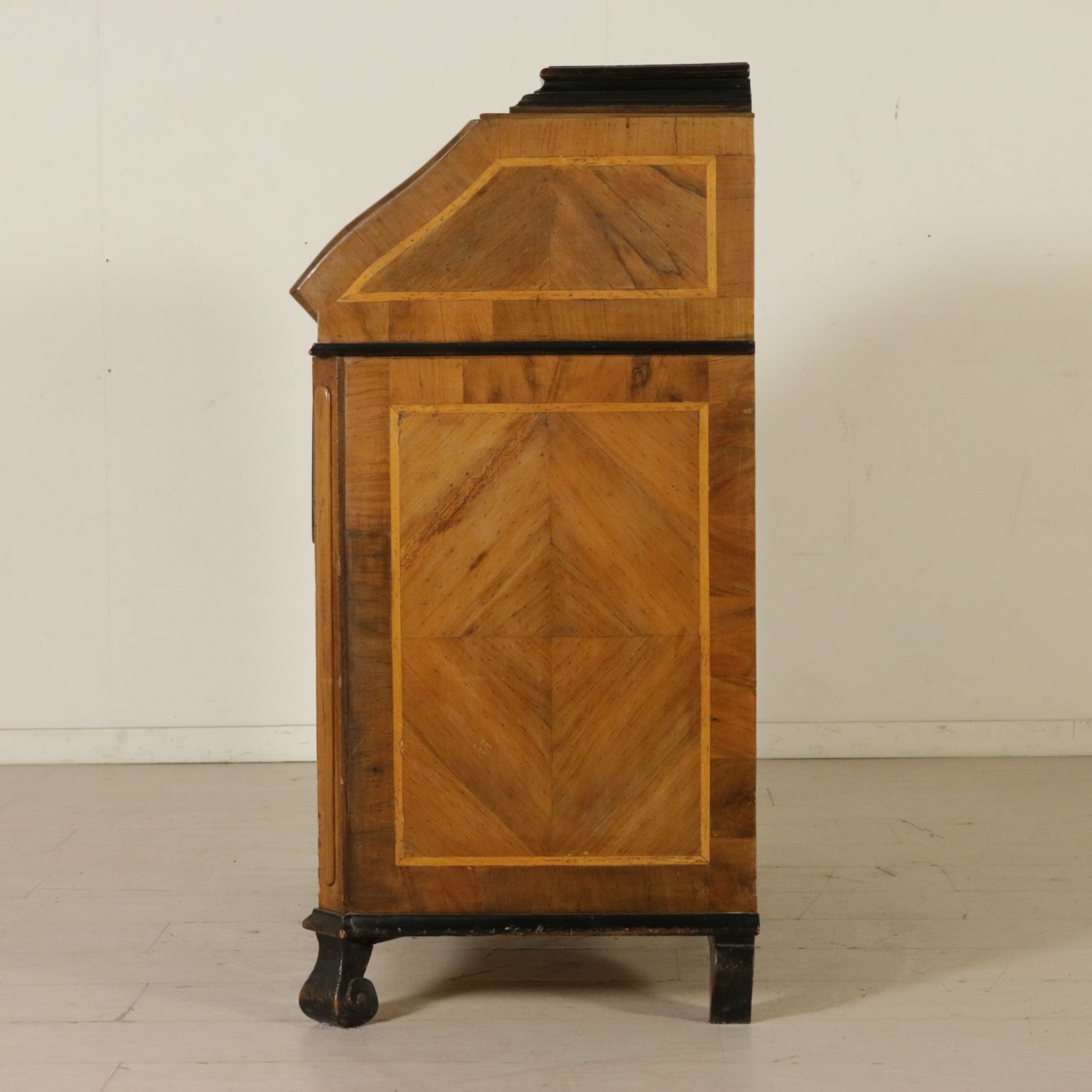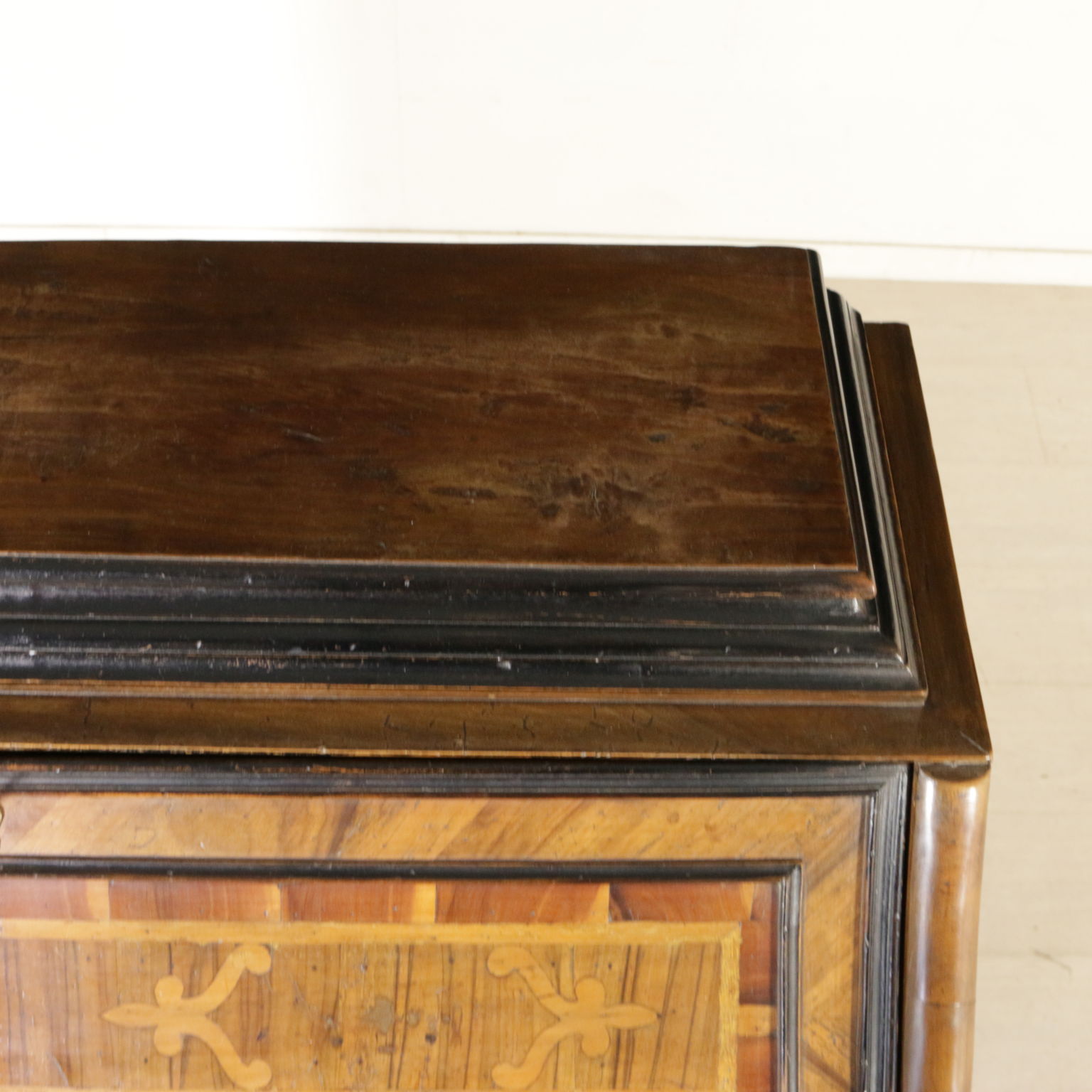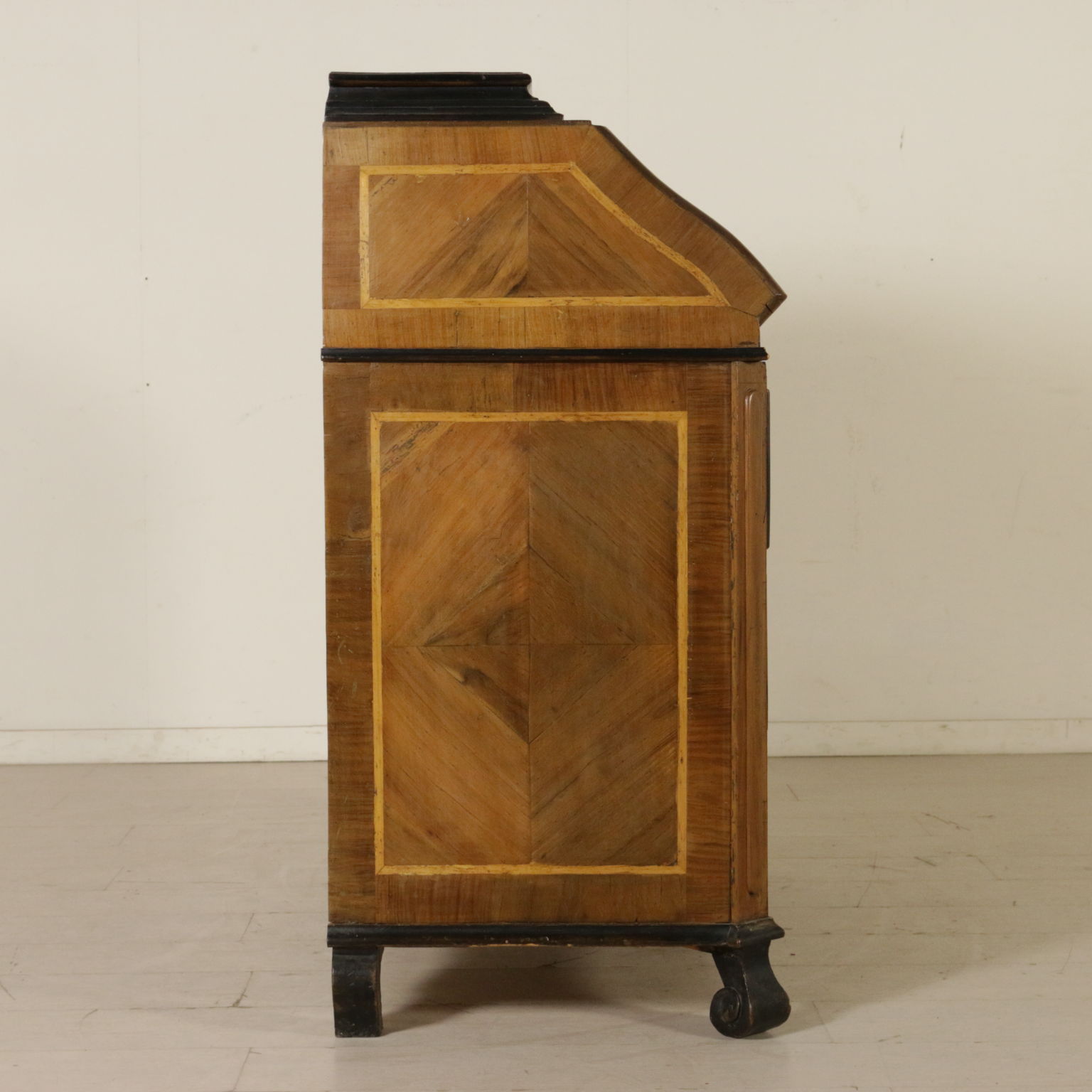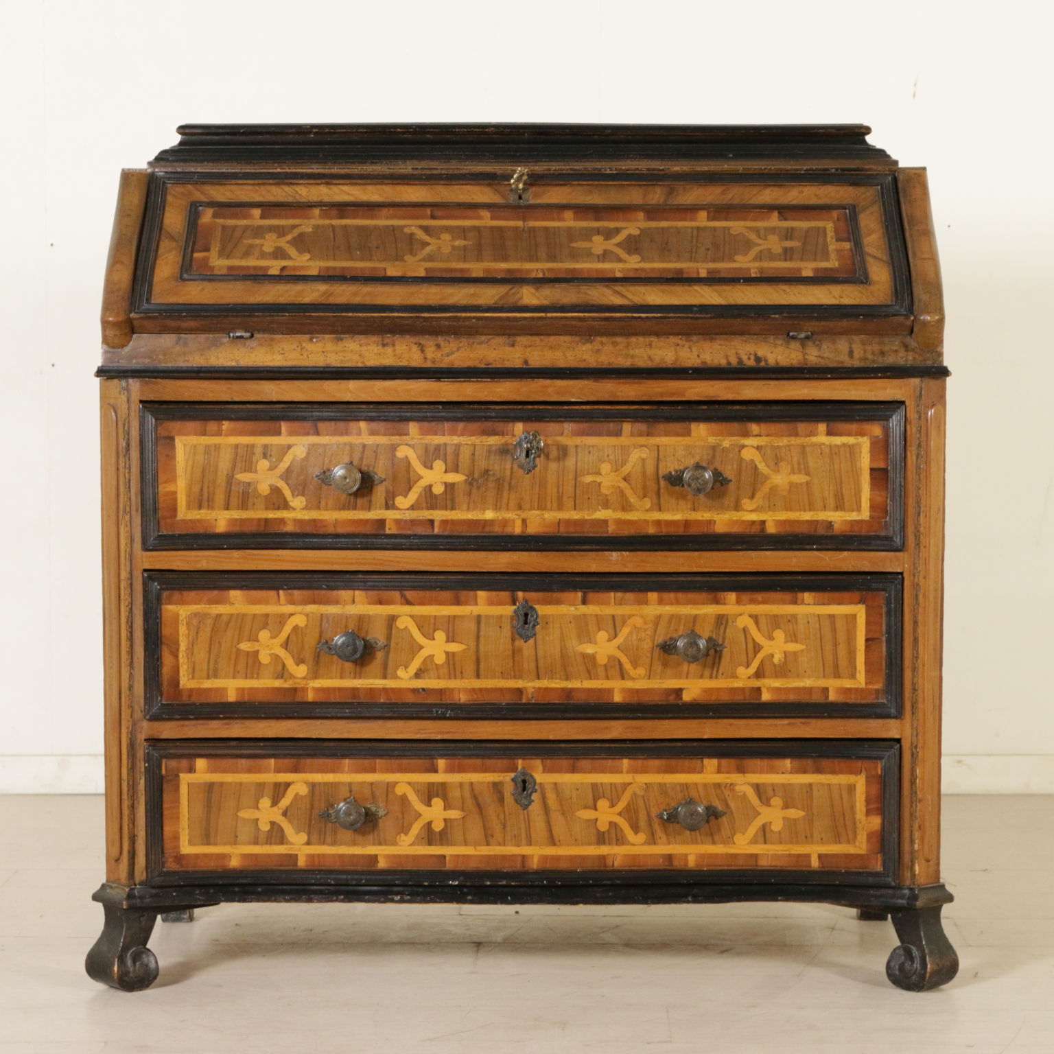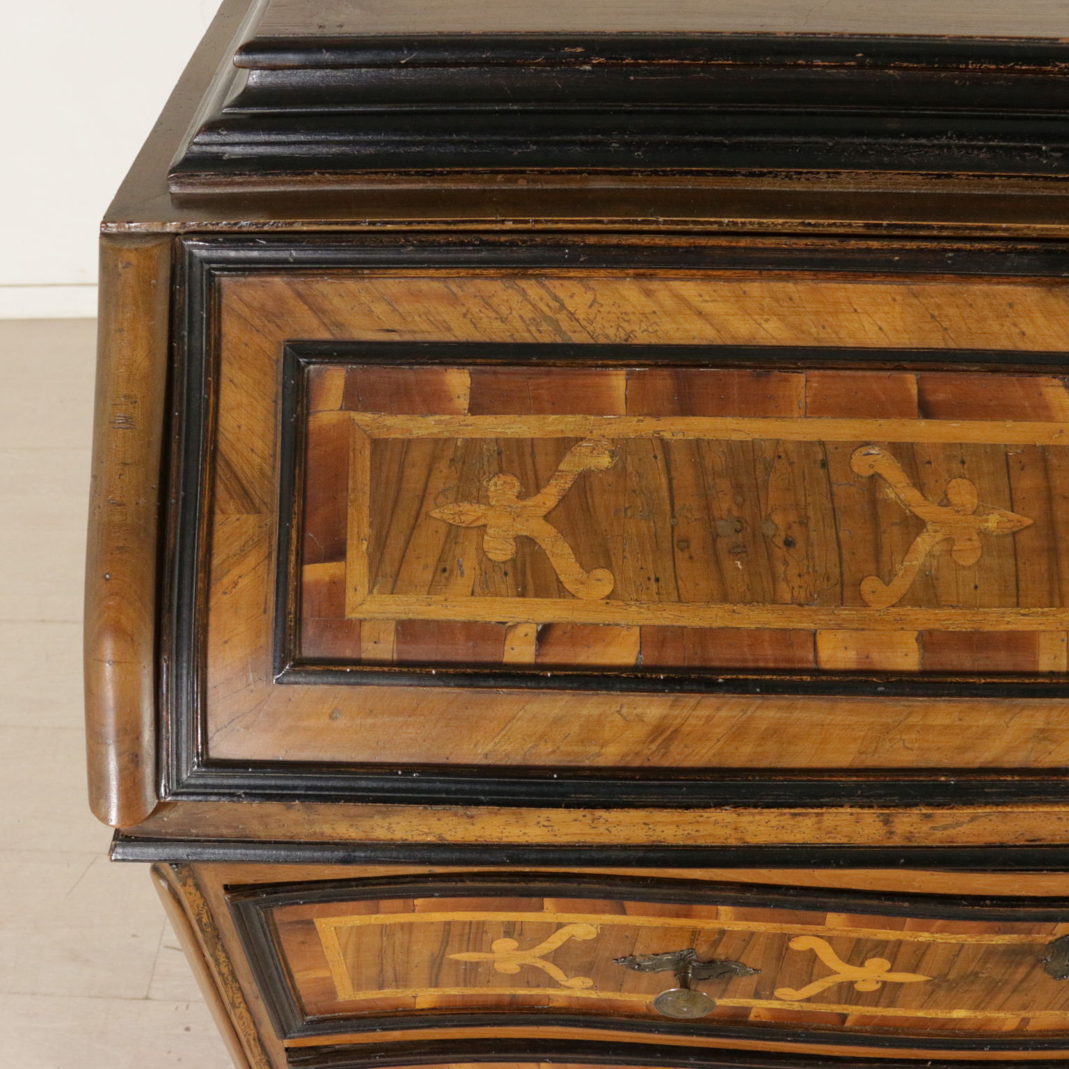 Bewegung auf der vorderseite, hat drei schubladen und eine klappe. Innerhalb von sechs cassettini. Aufkantung an der urne mit plan aufklappbar, rahmen ebanizzate und intarsien in ahorn. Aufrichtig fuß zu locken ebanizzati. Zusammengebaut mit altem material.