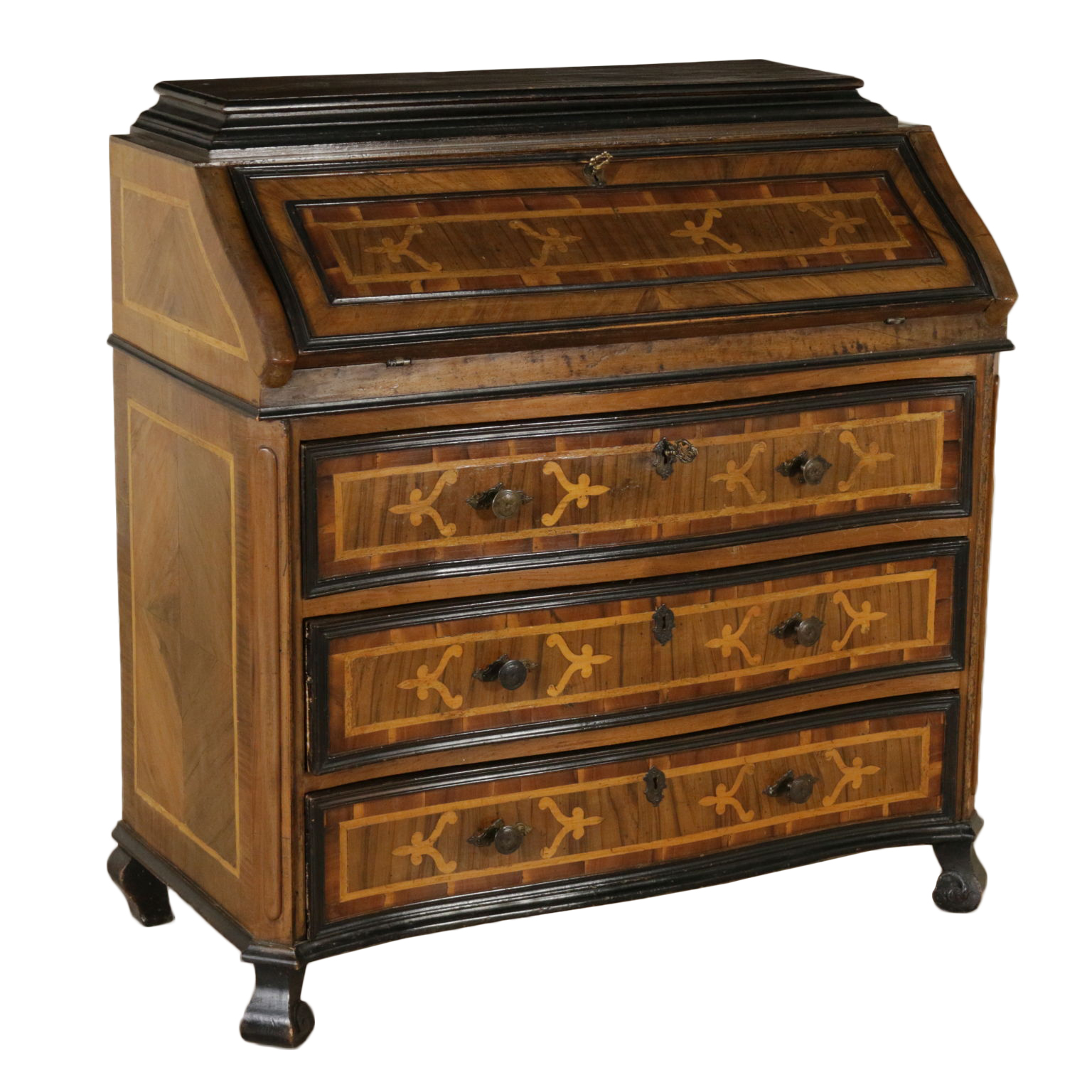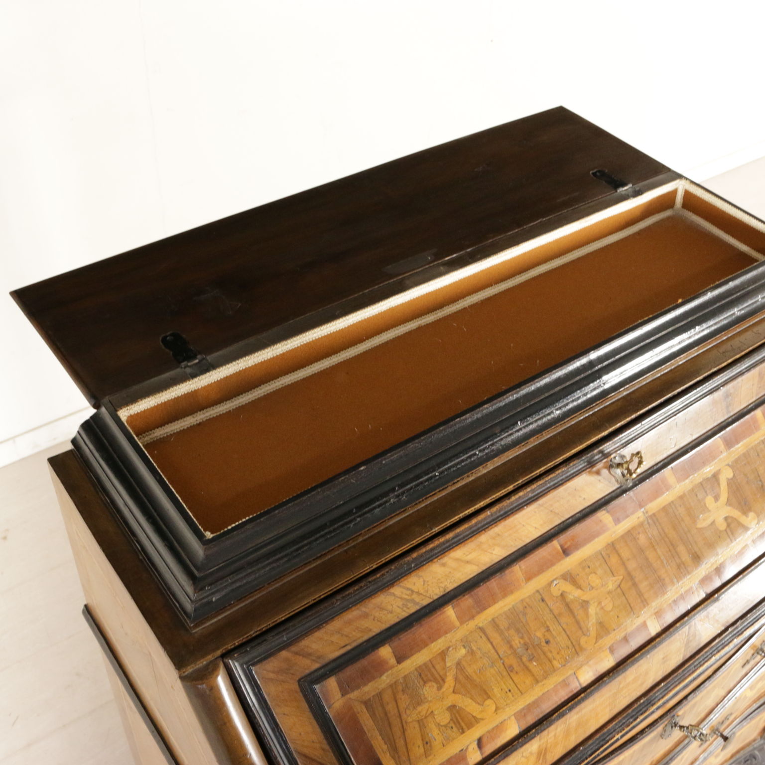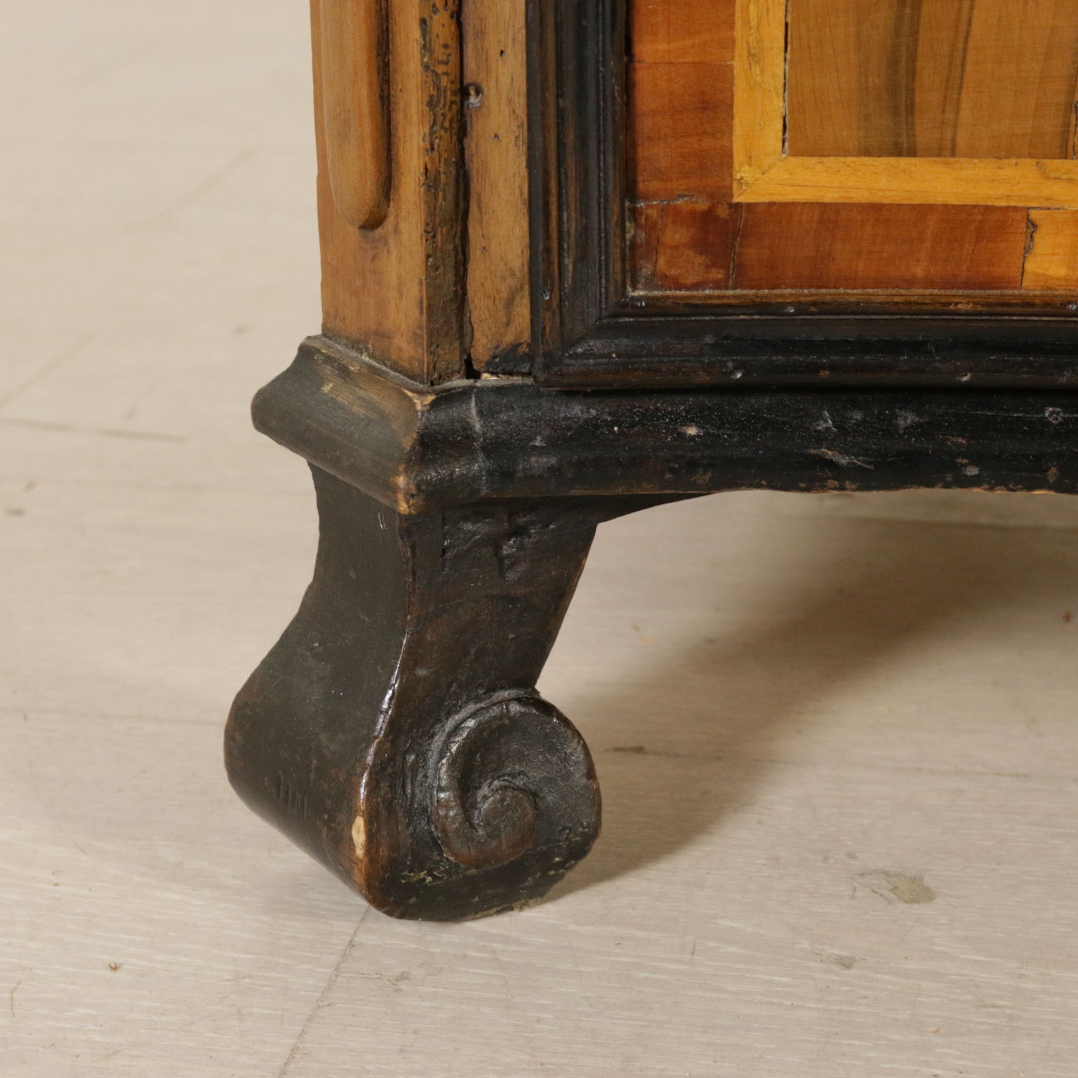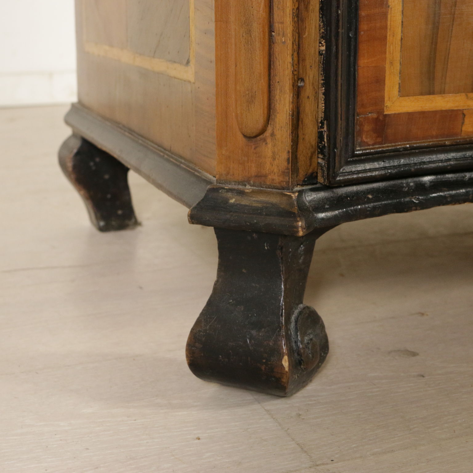 Bewegung auf der vorderseite, hat drei schubladen und eine klappe. Innerhalb von sechs cassettini. Aufkantung an der urne mit plan aufklappbar, rahmen ebanizzate und intarsien in ahorn. Aufrichtig fuß zu locken ebanizzati. Zusammengebaut mit altem material.