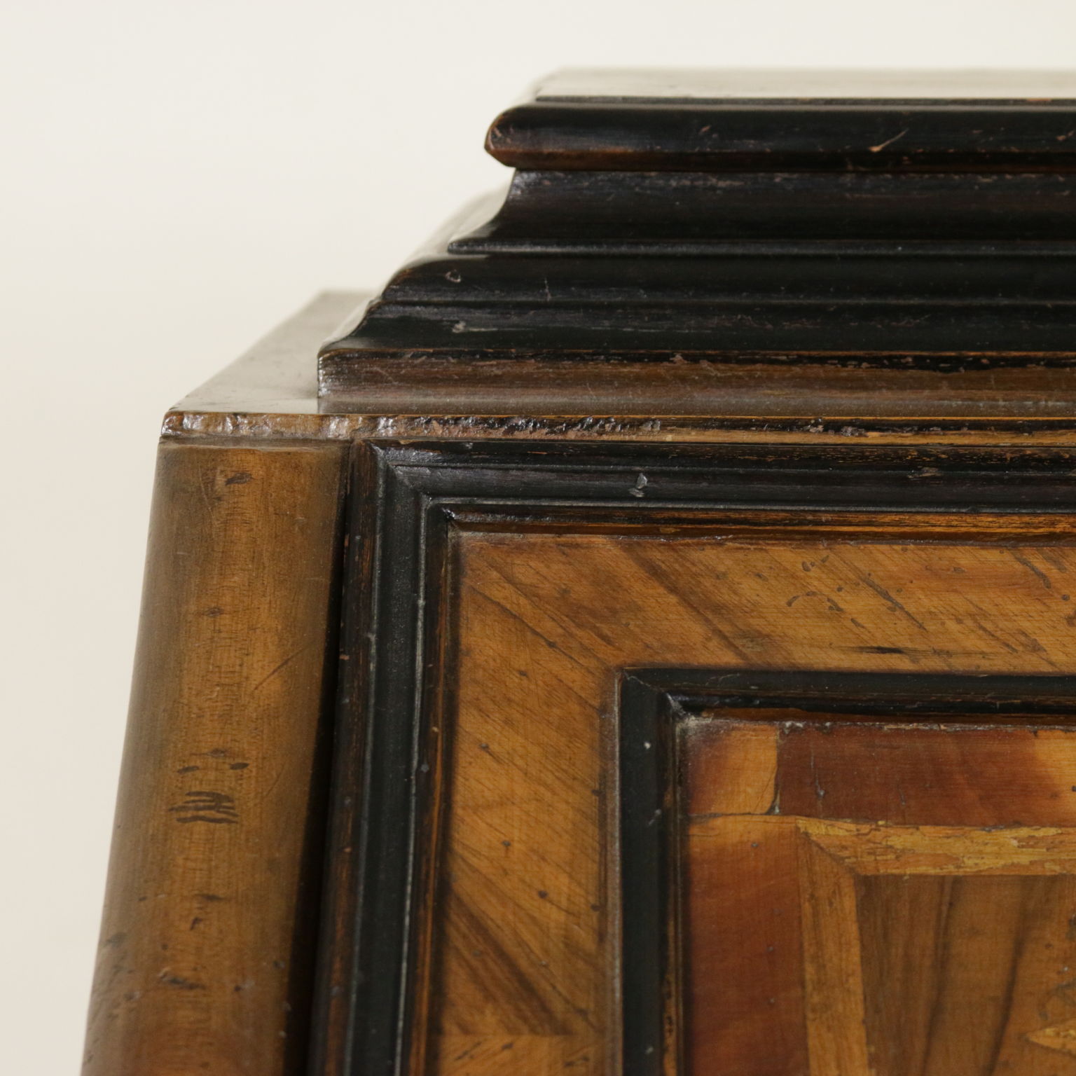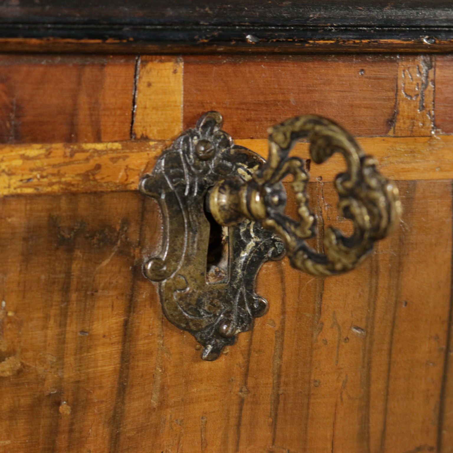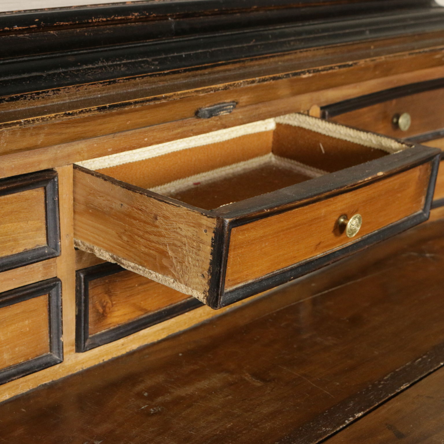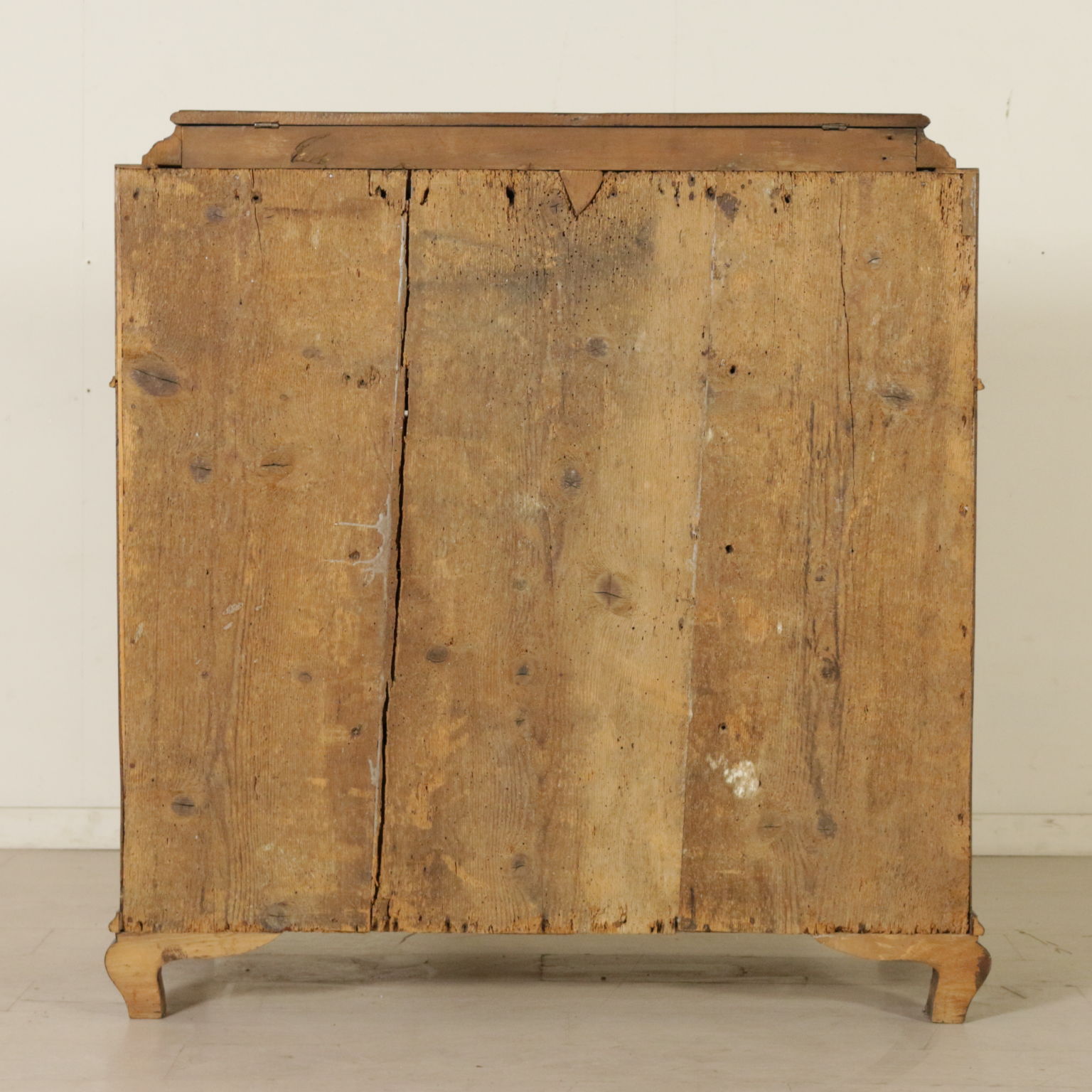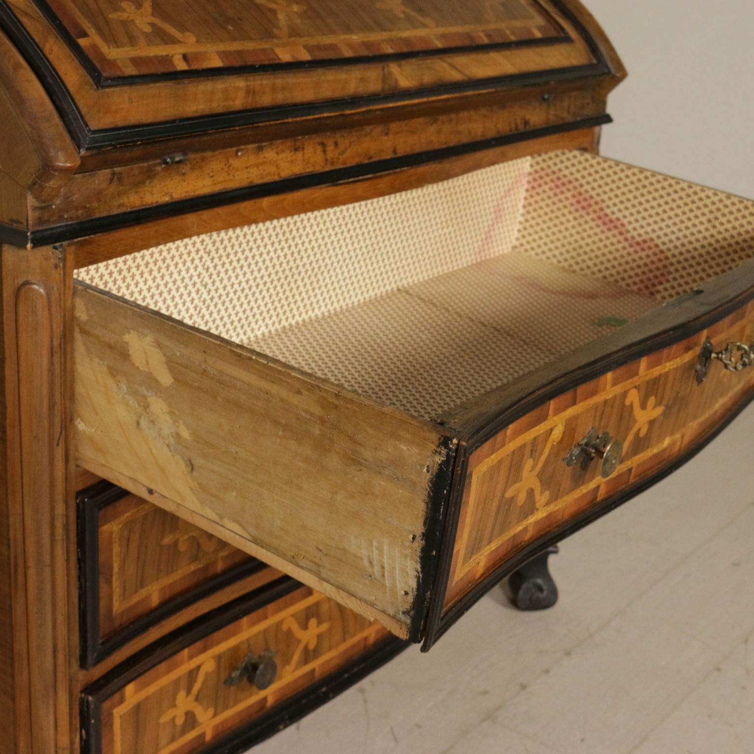 Bewegung auf der vorderseite, hat drei schubladen und eine klappe. Innerhalb von sechs cassettini. Aufkantung an der urne mit plan aufklappbar, rahmen ebanizzate und intarsien in ahorn. Aufrichtig fuß zu locken ebanizzati. Zusammengebaut mit altem material.
