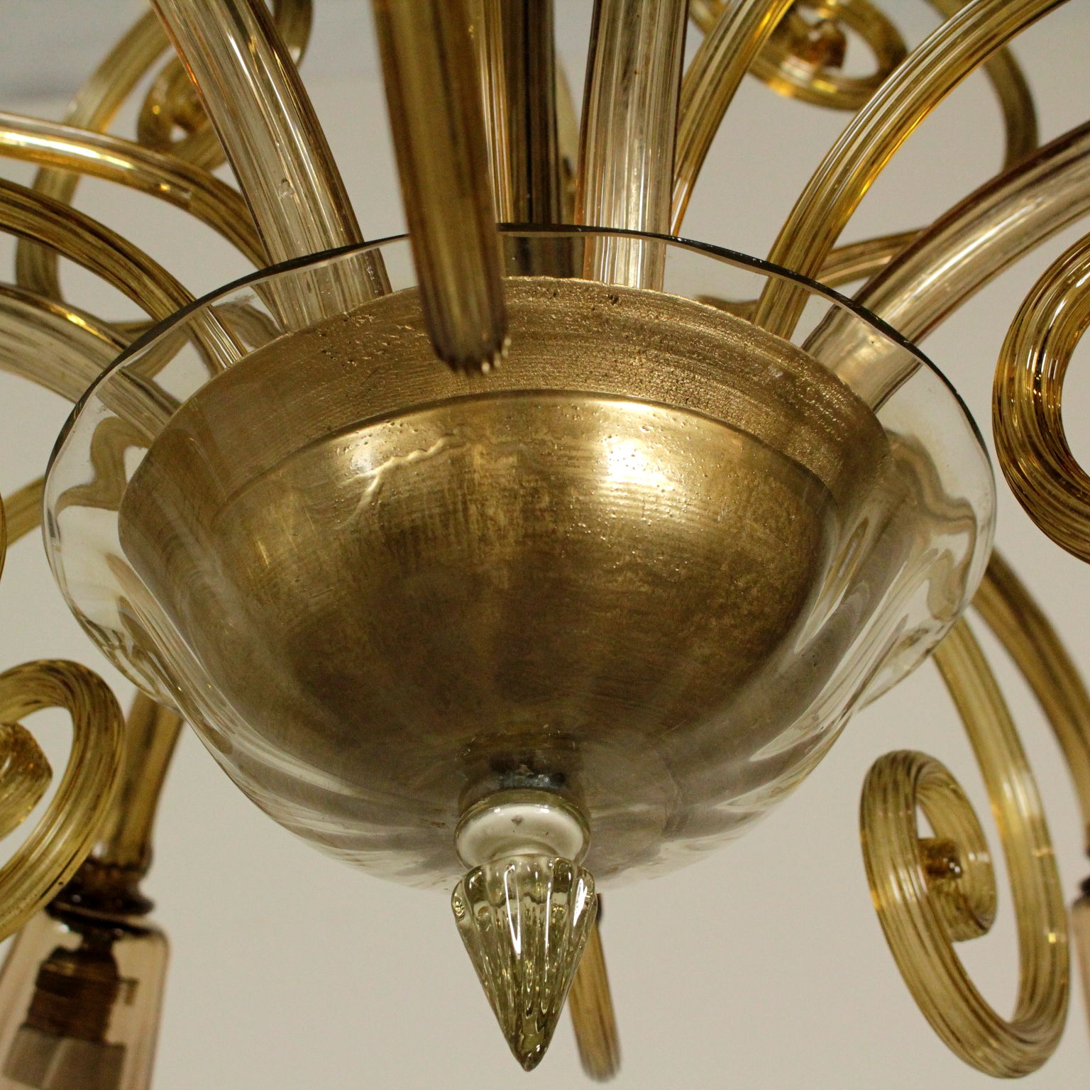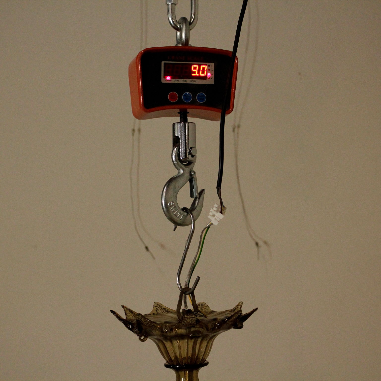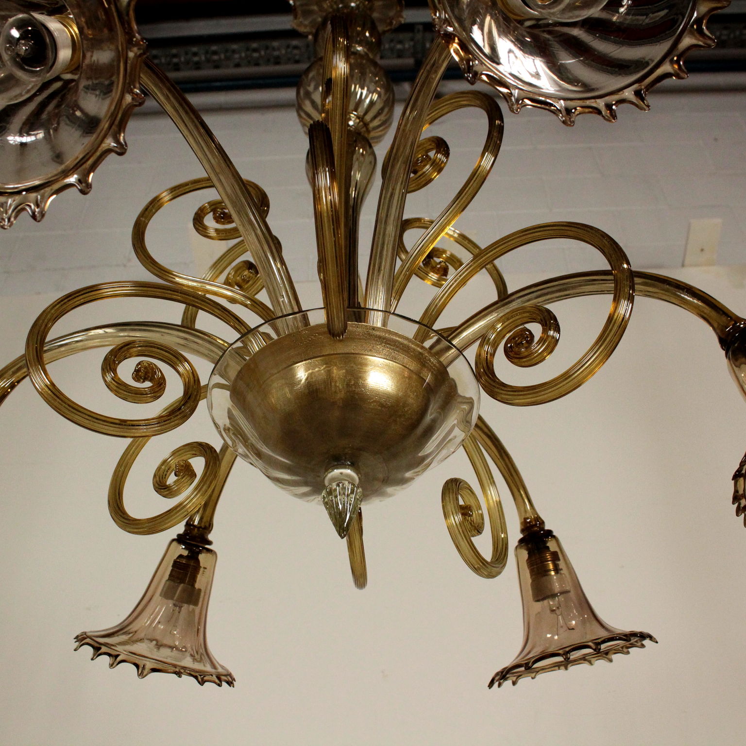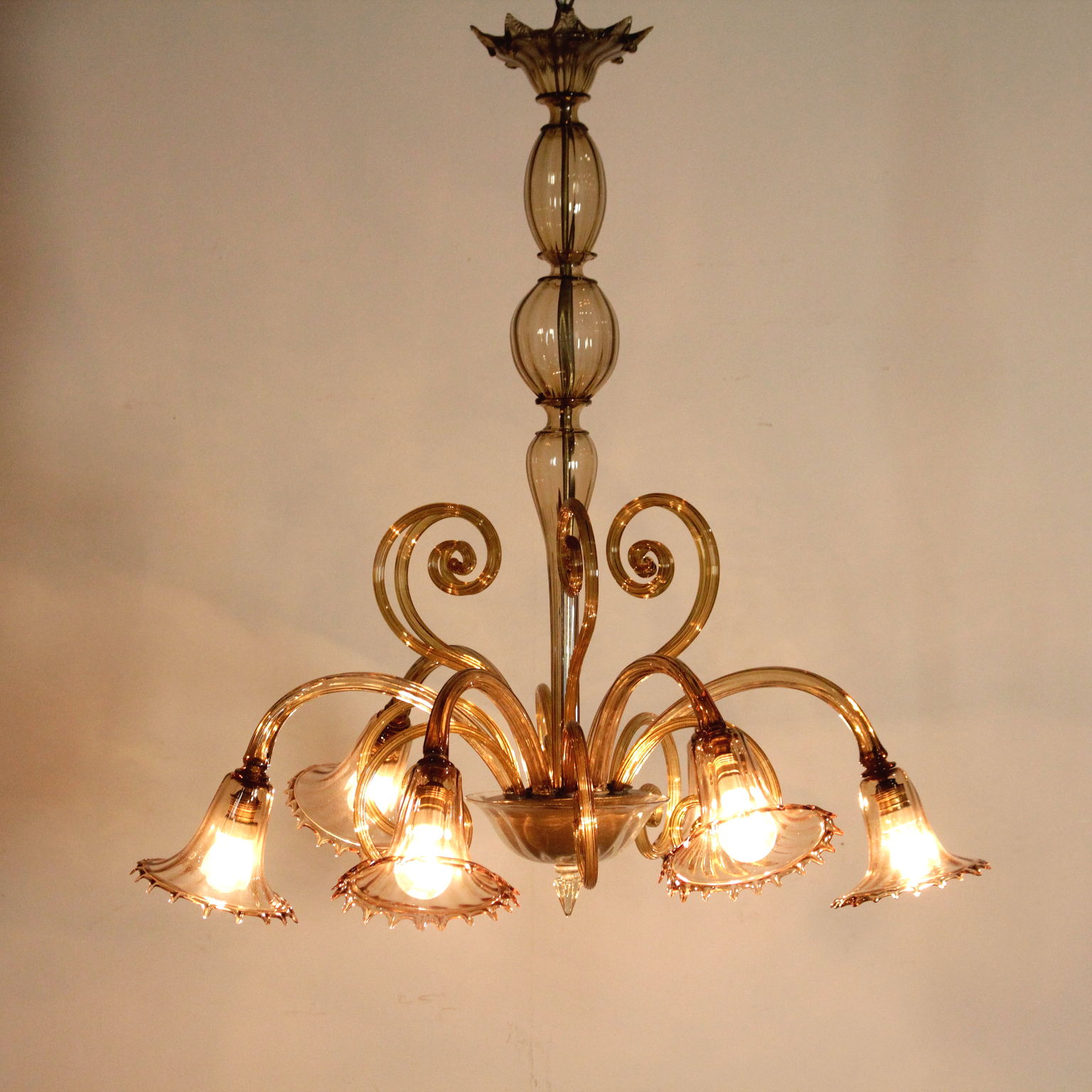 Elegante kronleuchter mit sechs armen, mit schalen aus glas gearbeitet und glas in der seelsorge. Rielettrificato.