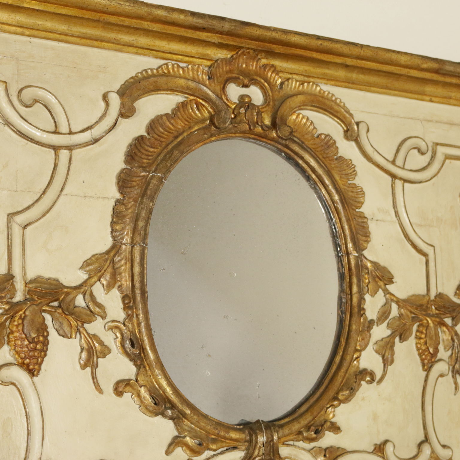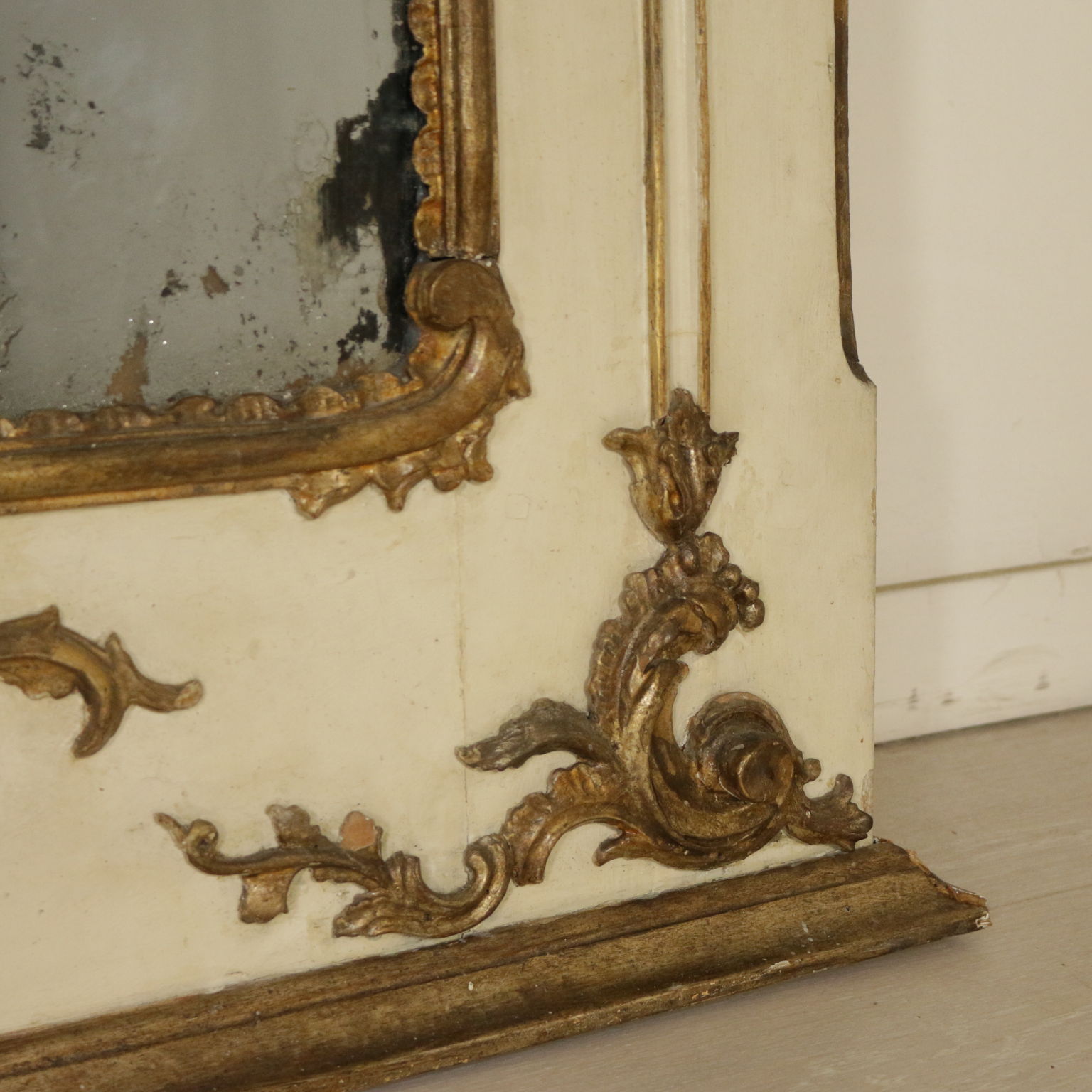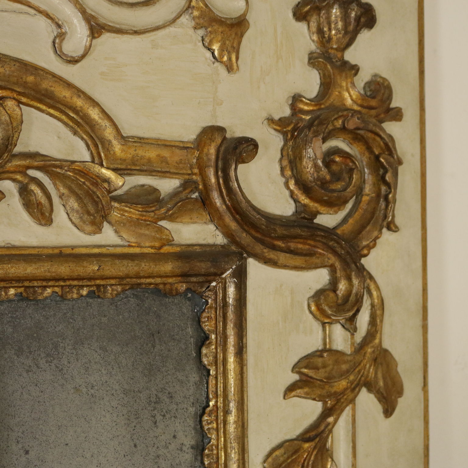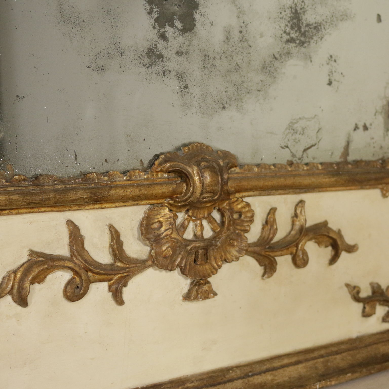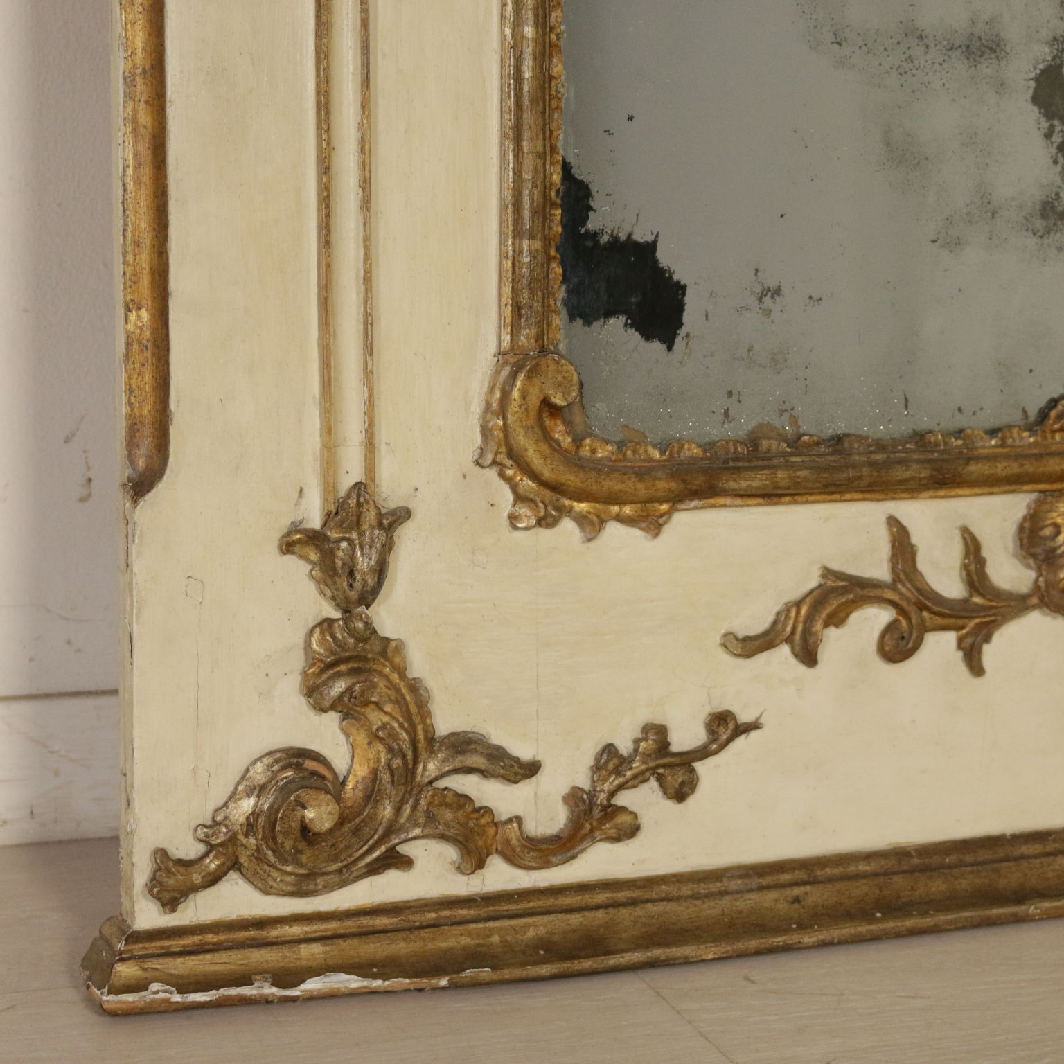 Elegante caminiera von palast komplett lackiert und dekoriert mit edlen fogliacei schnitzereien und mit voluten verzierte mekka. Spiegel, zentral, zweiteiligen und schriftfeld oberen beiden quecksilber.