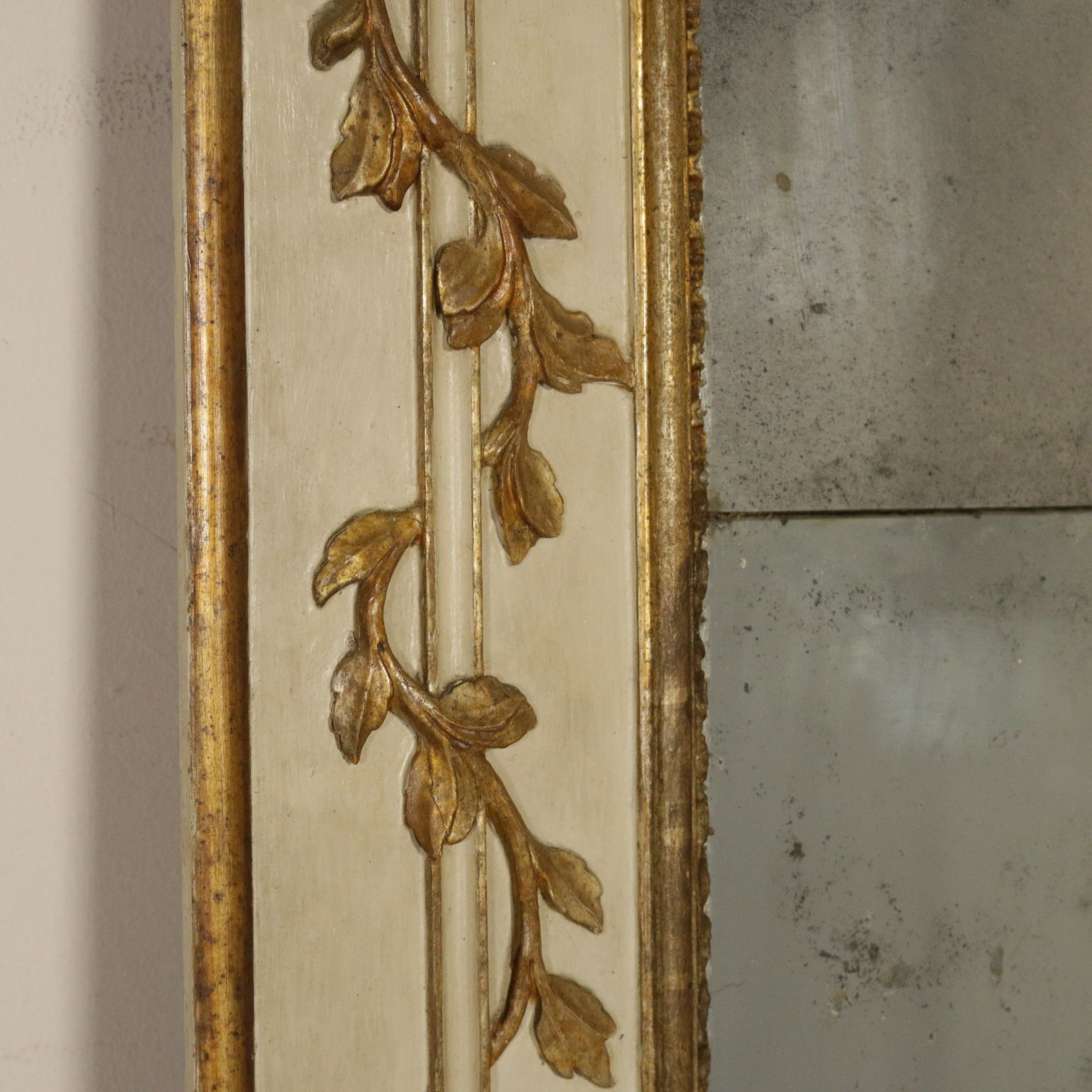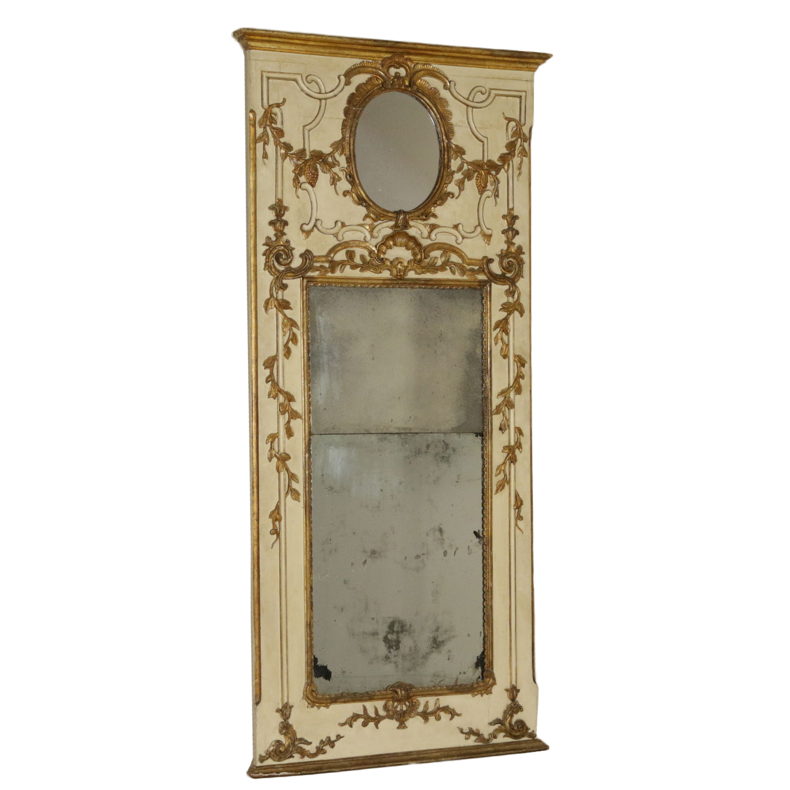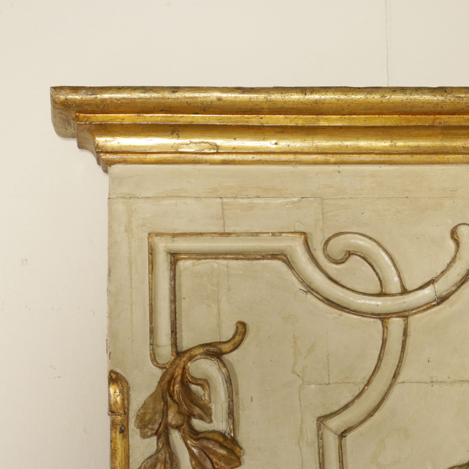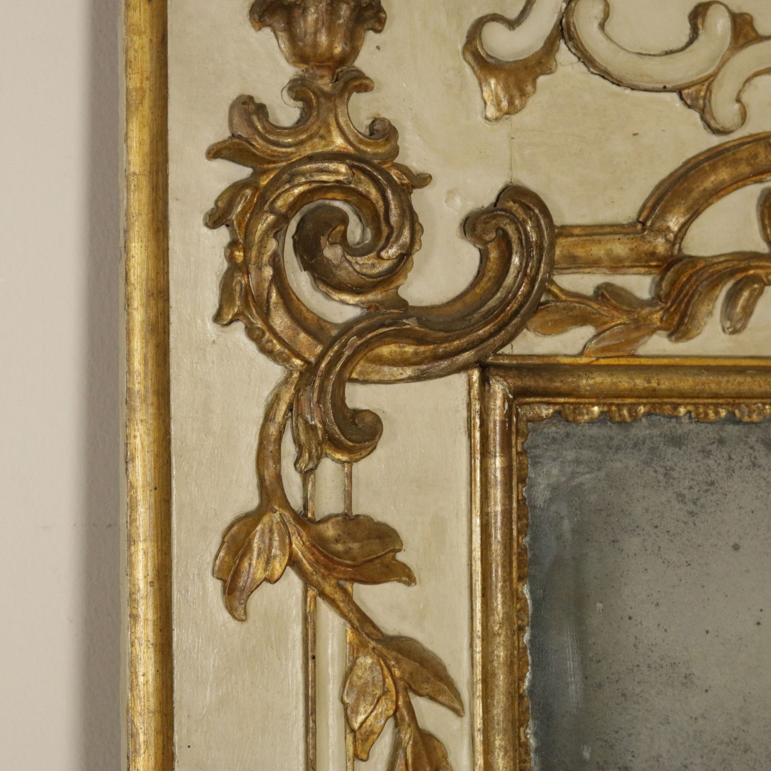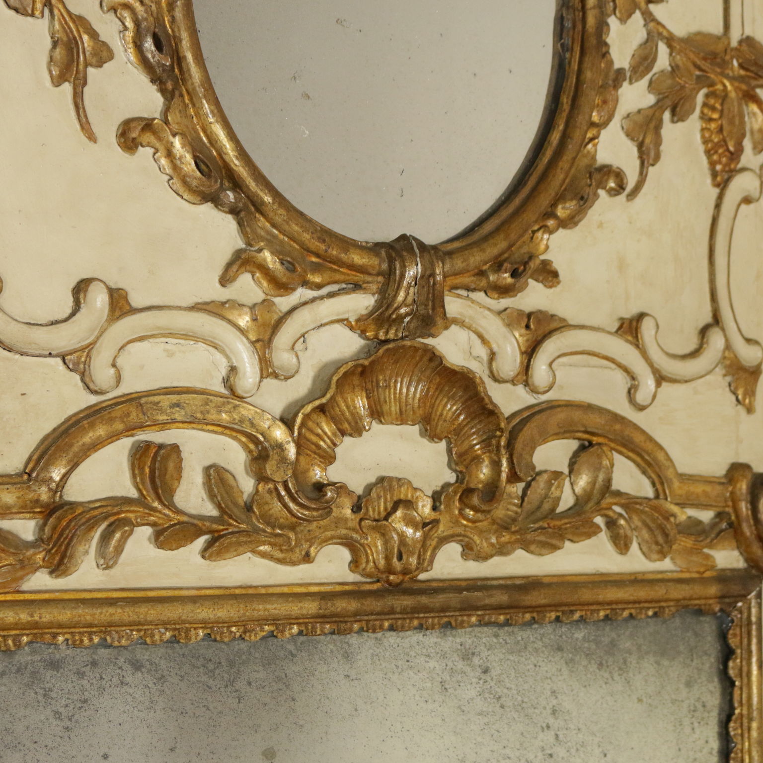 Elegante caminiera von palast komplett lackiert und dekoriert mit edlen fogliacei schnitzereien und mit voluten verzierte mekka. Spiegel, zentral, zweiteiligen und schriftfeld oberen beiden quecksilber.