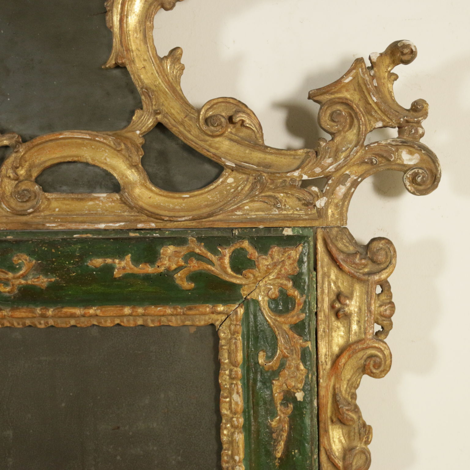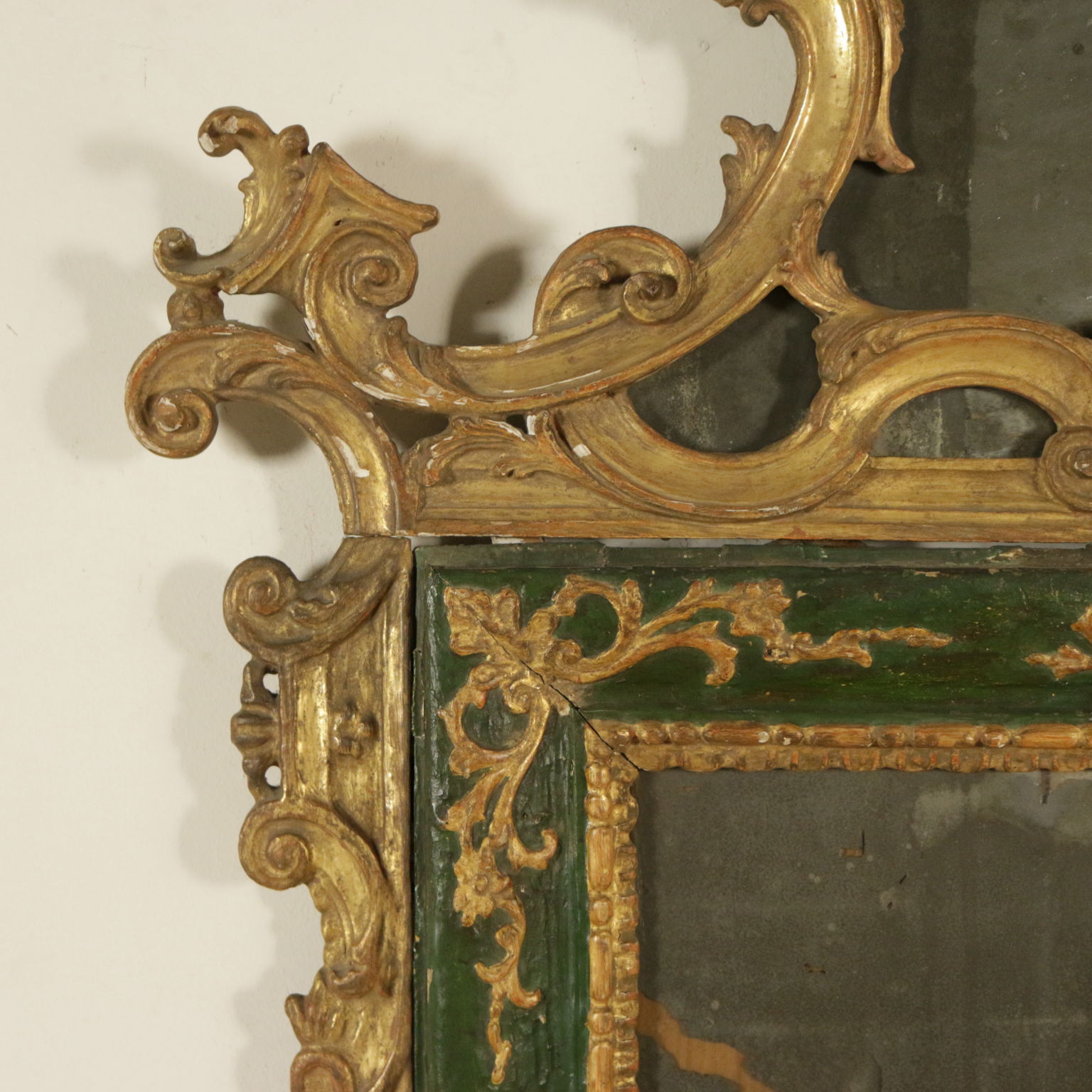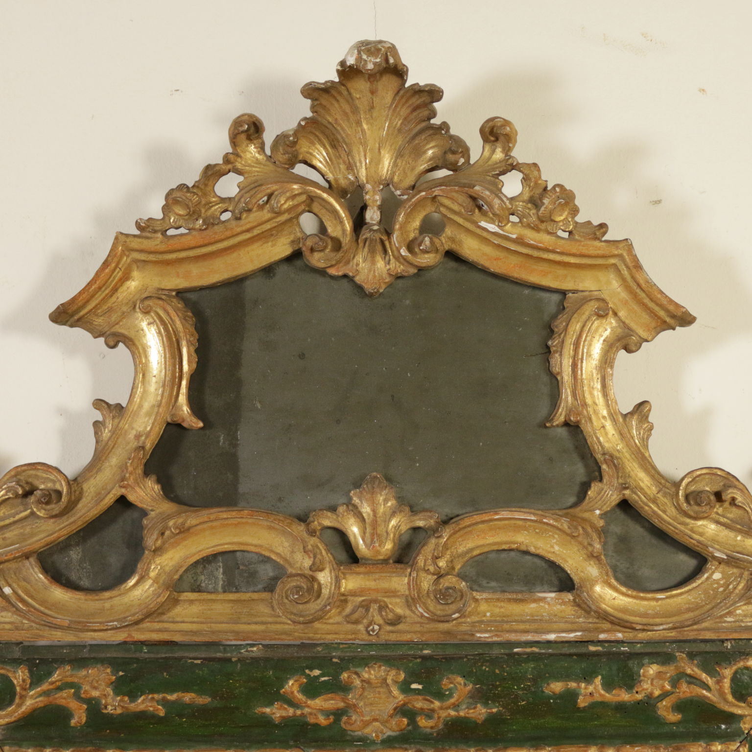 Raffinierte spiegel vom band lackiert. Bewältigung und seitlichen voluten geschnitzt mit voluten und spiegel.
