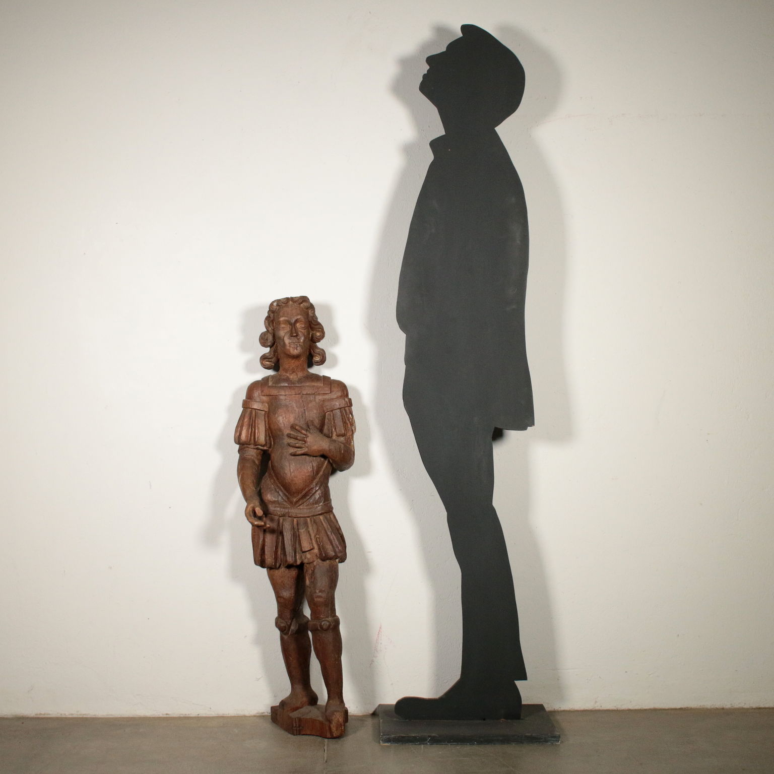 Hölzerne Skulptur, die einen jungen Mann darstellt. Die Statue wurde wahrscheinlich in Polychromie lackiert. Hergestellt in Nordeuropa, 17. Jahrhundert.