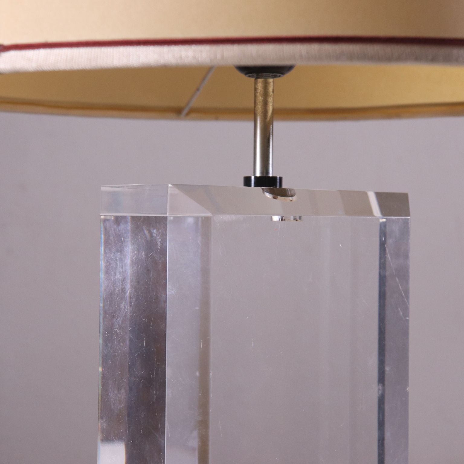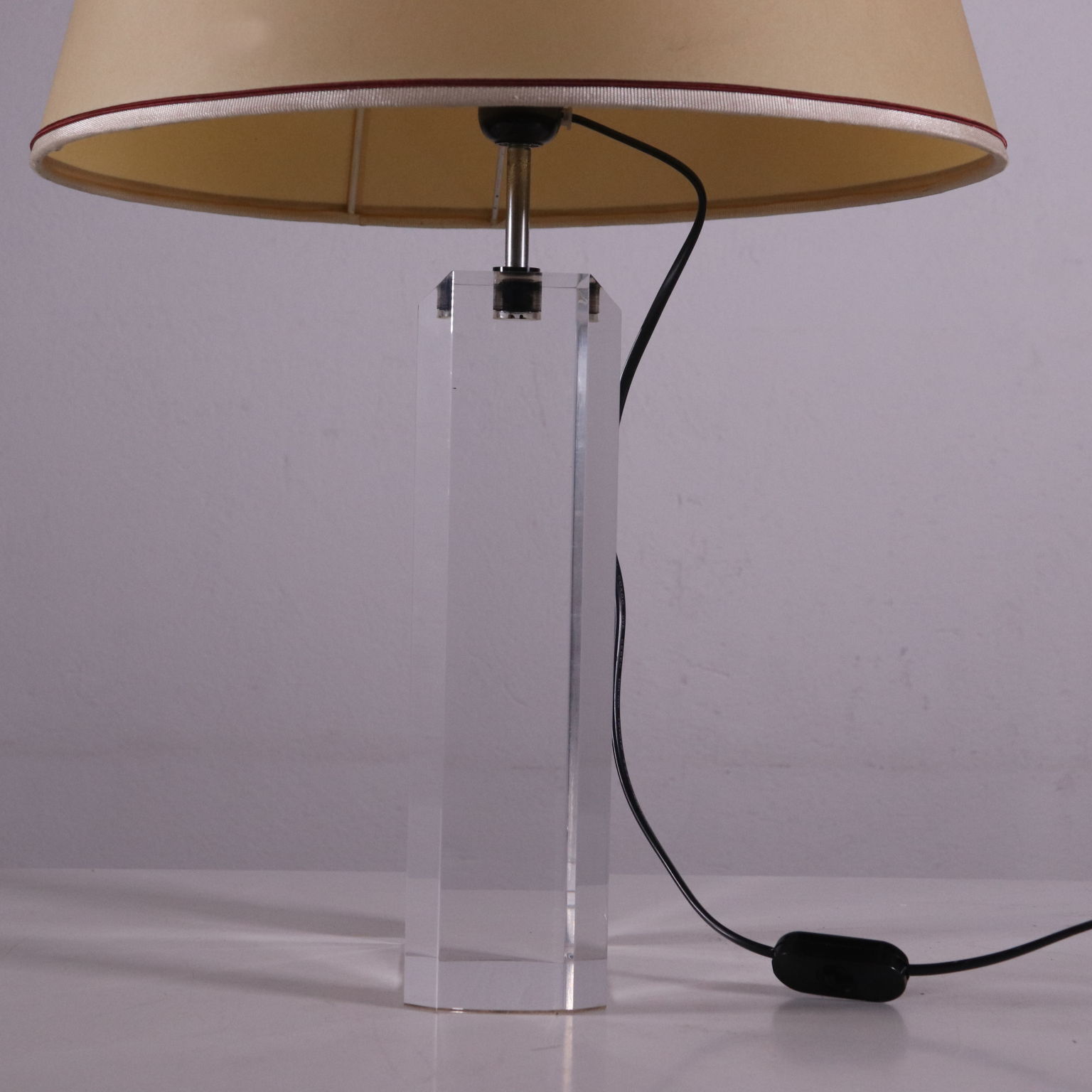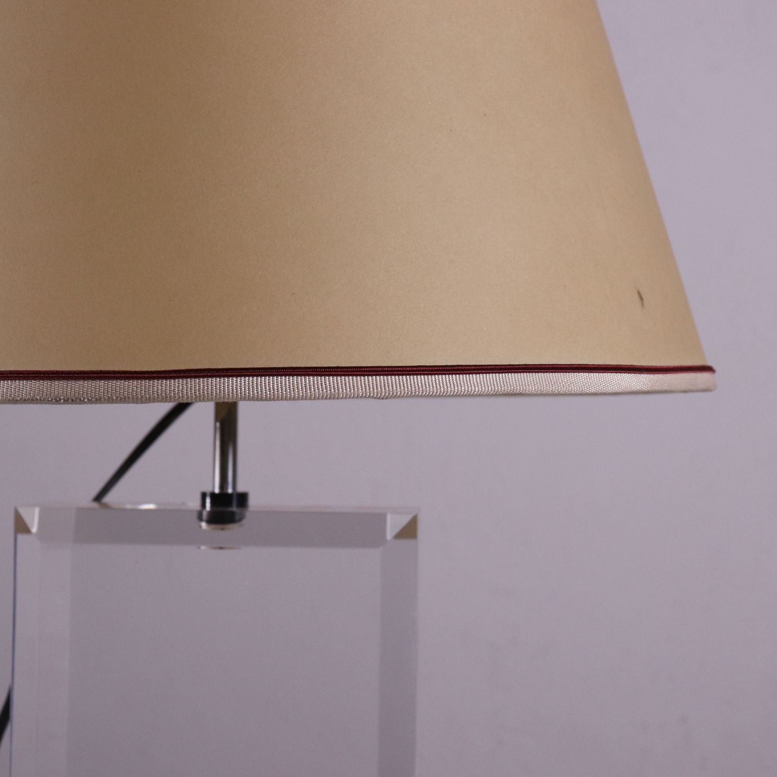 Tischlampe mit Basis aus Plexiglas und Lampenschirm aus plastifizierten Papier. Hergestellt in Italien, 80er Jahre.