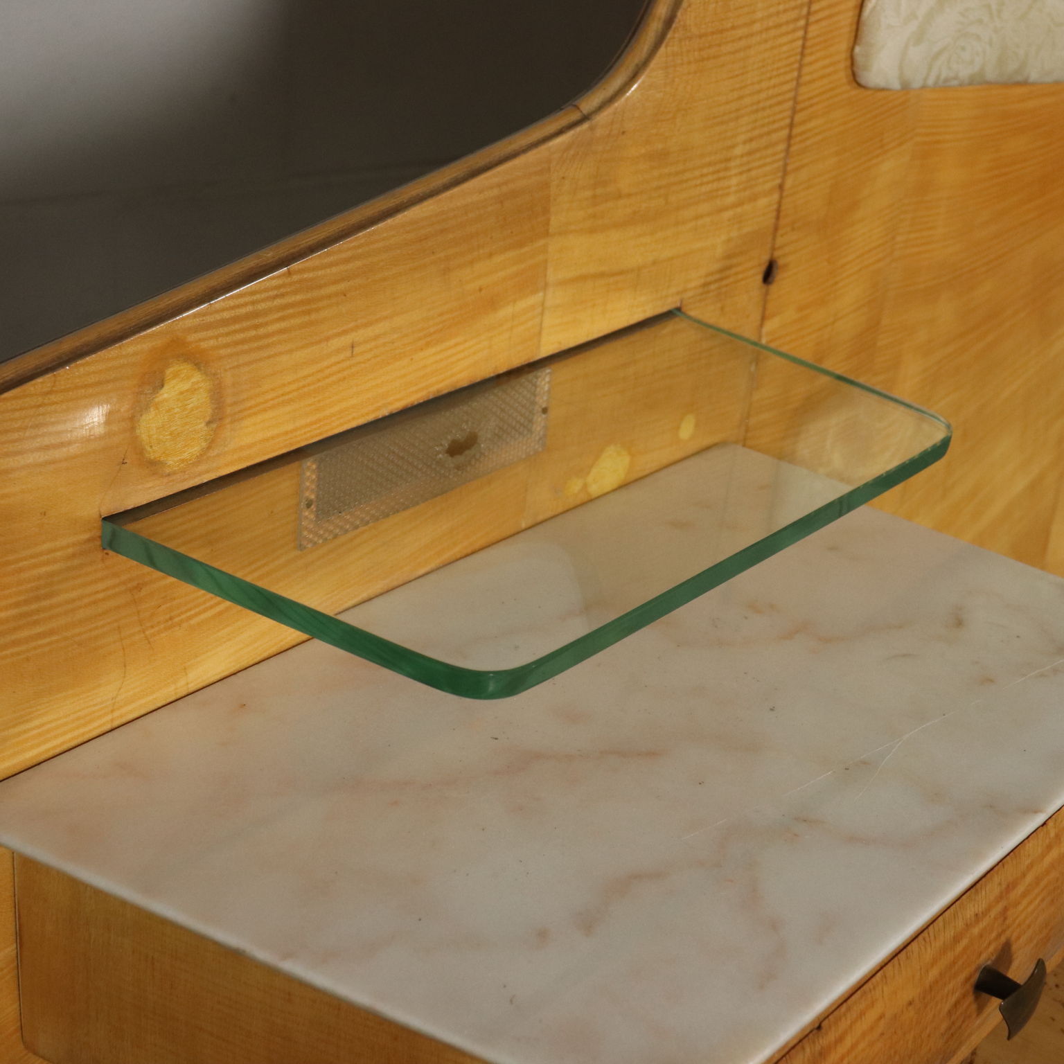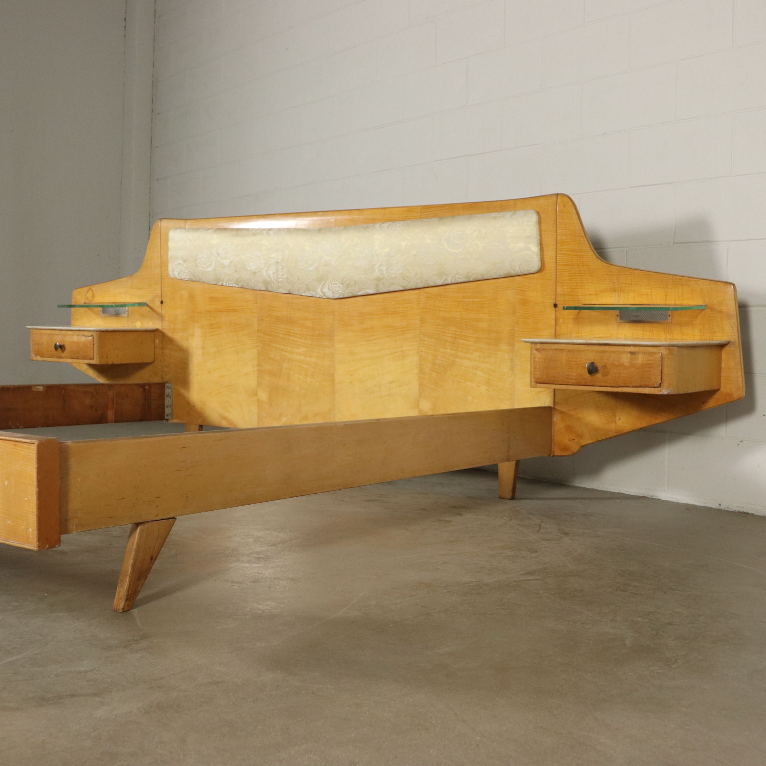 Doppelbett mit Nachttische, Ahorn Furnier, Marmor, Glasregal. Kopfteil mit Polsterung und Stoff. Hergestellt in Italien, 50er-60er Jahre.