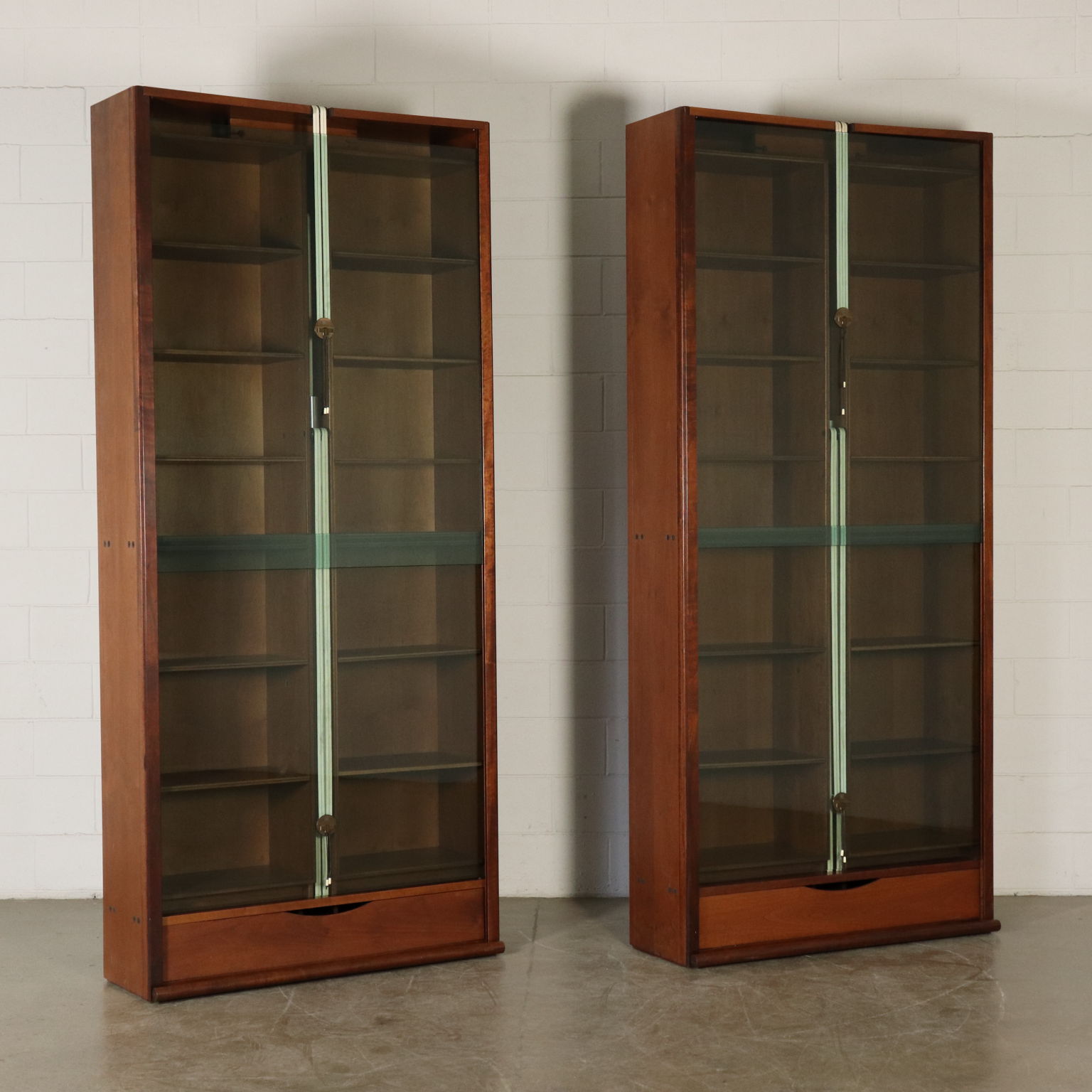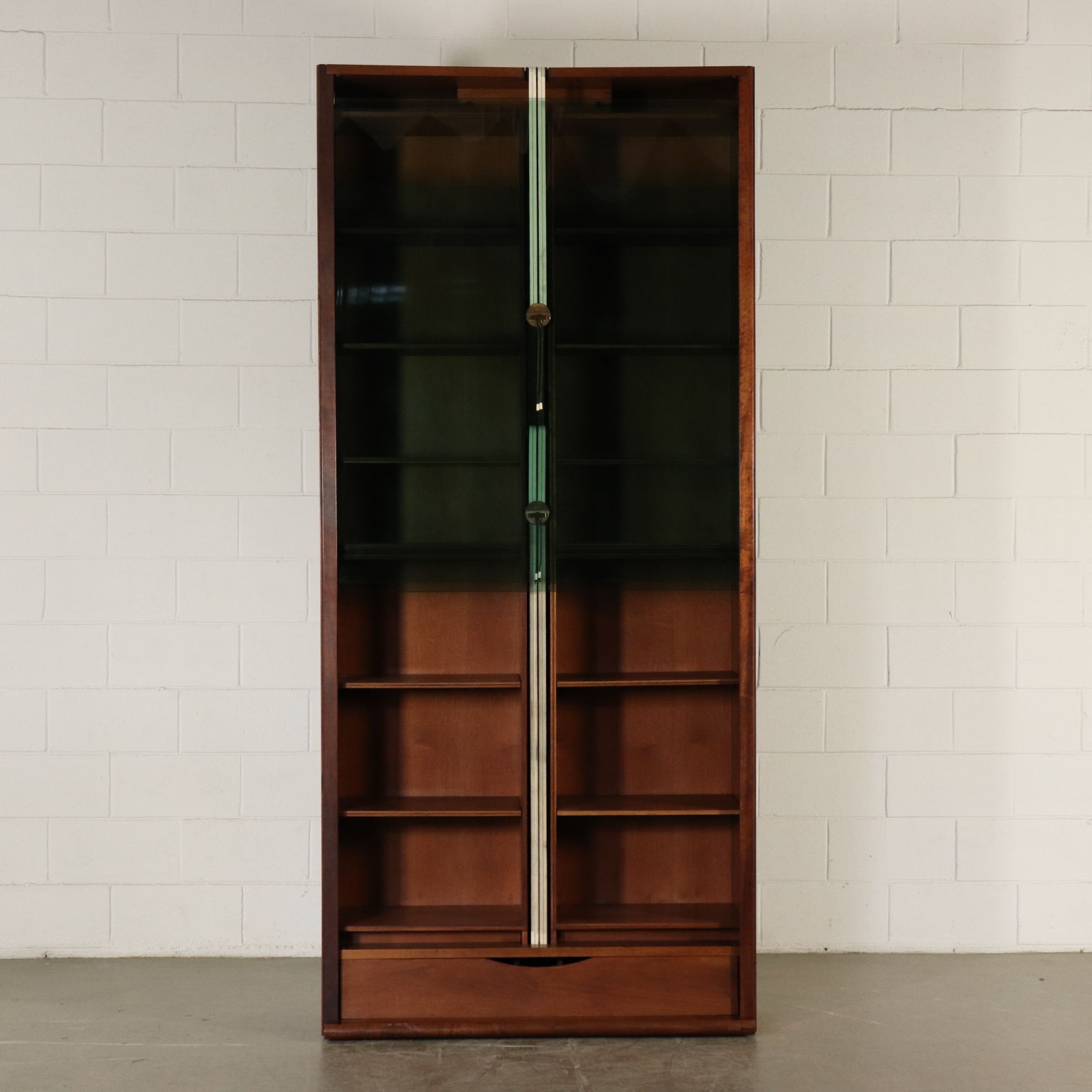 Bücherregal mit vertikalen Glasschiebetüren. Walnuss Furnierholz.