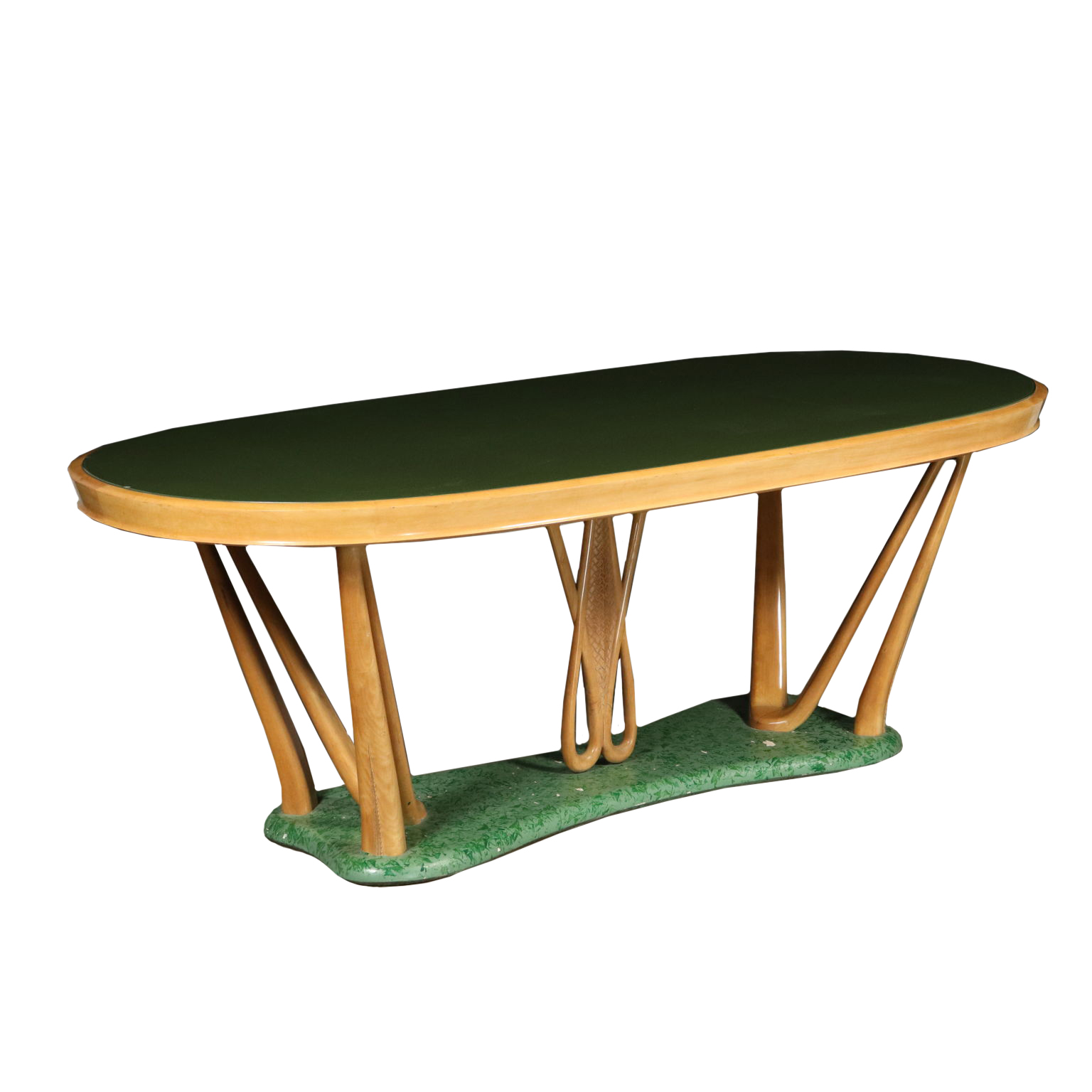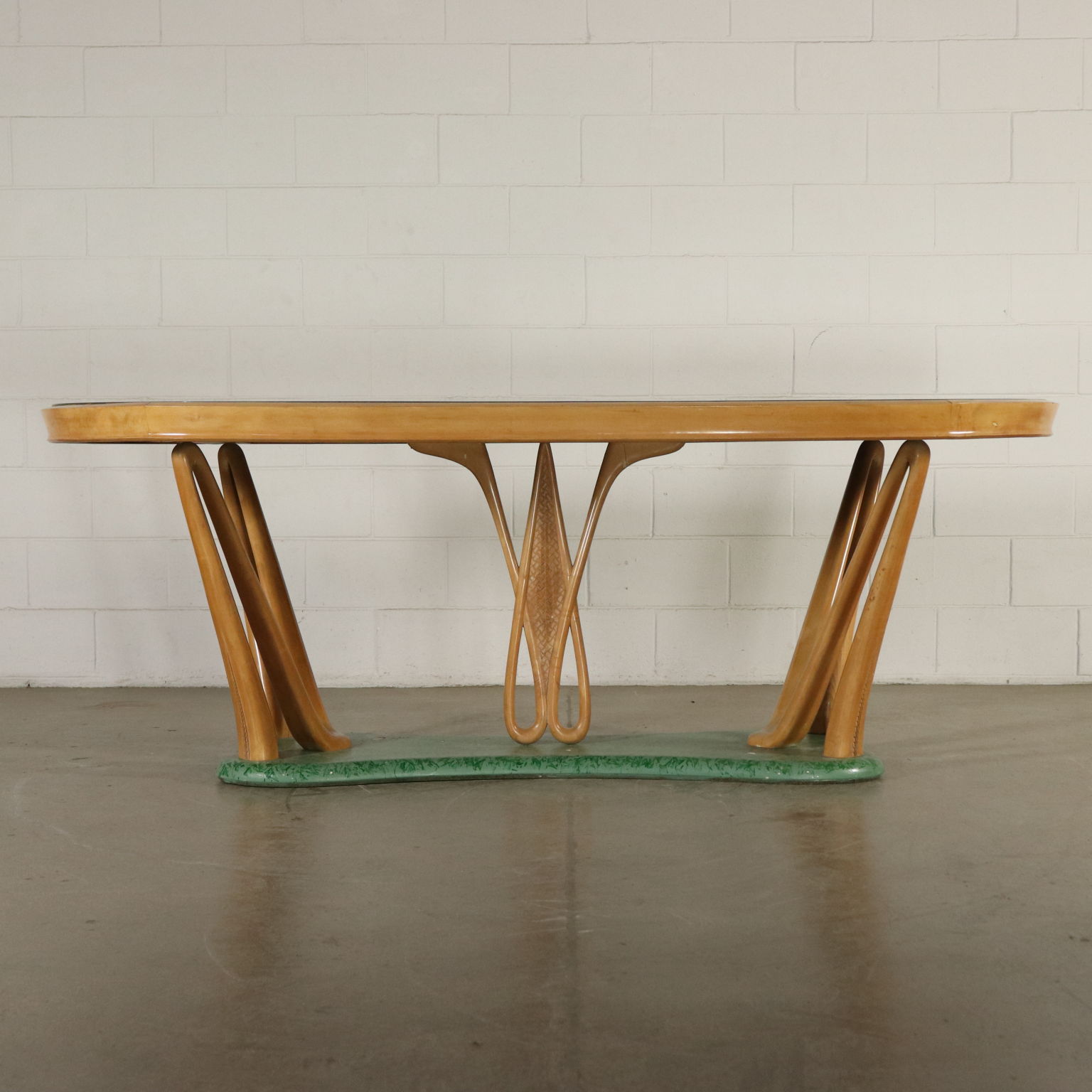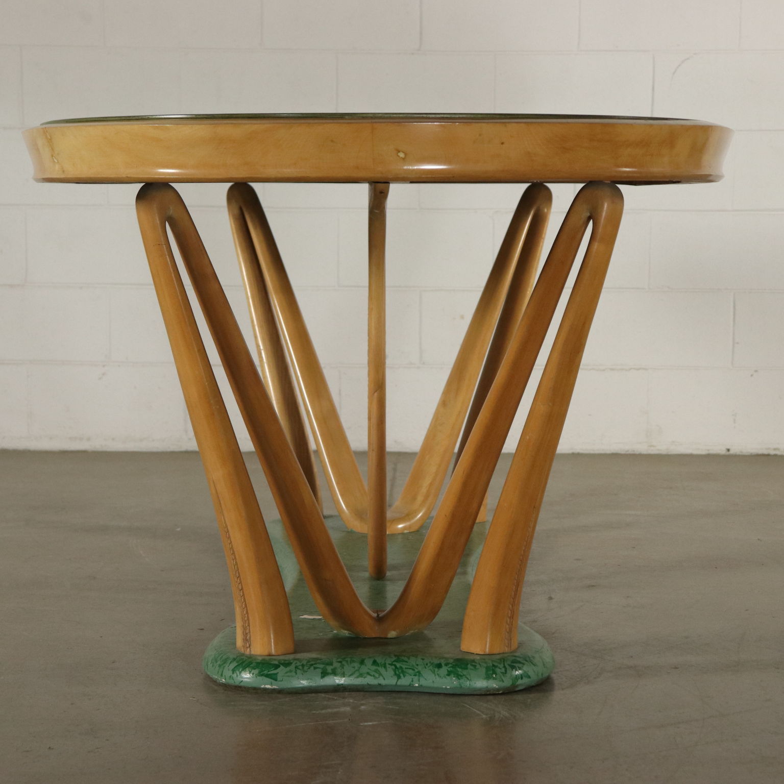 Tisch, holz, buche, sockel mit marmor-effekt-lackierung, platte aus glas, rückseite vertrag.