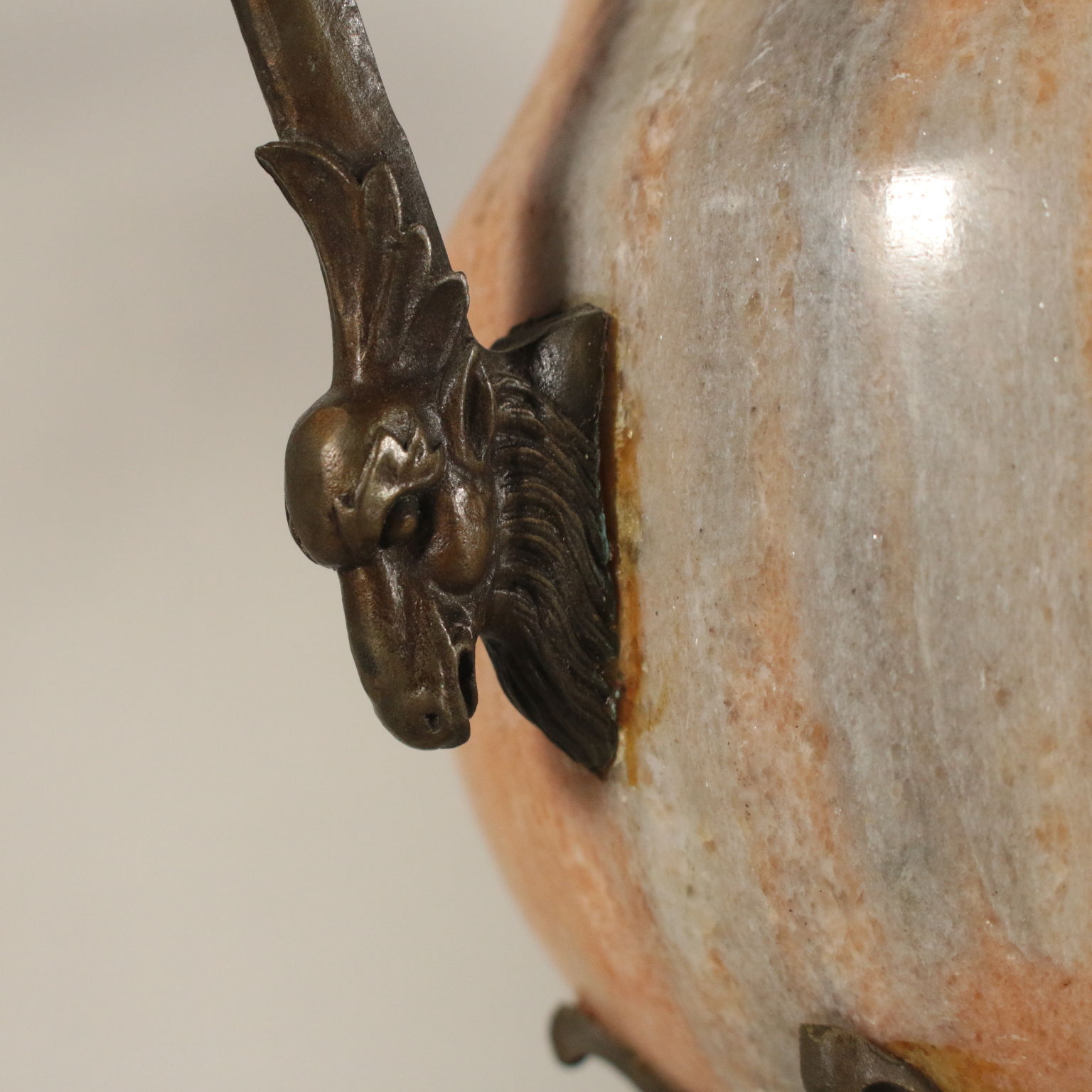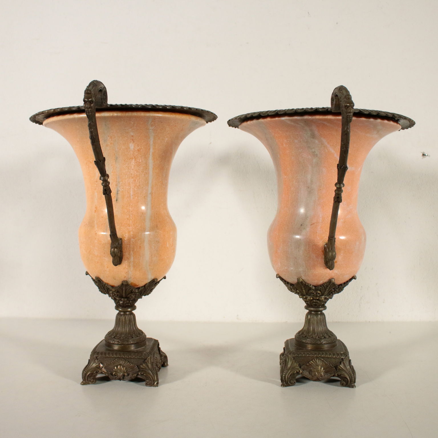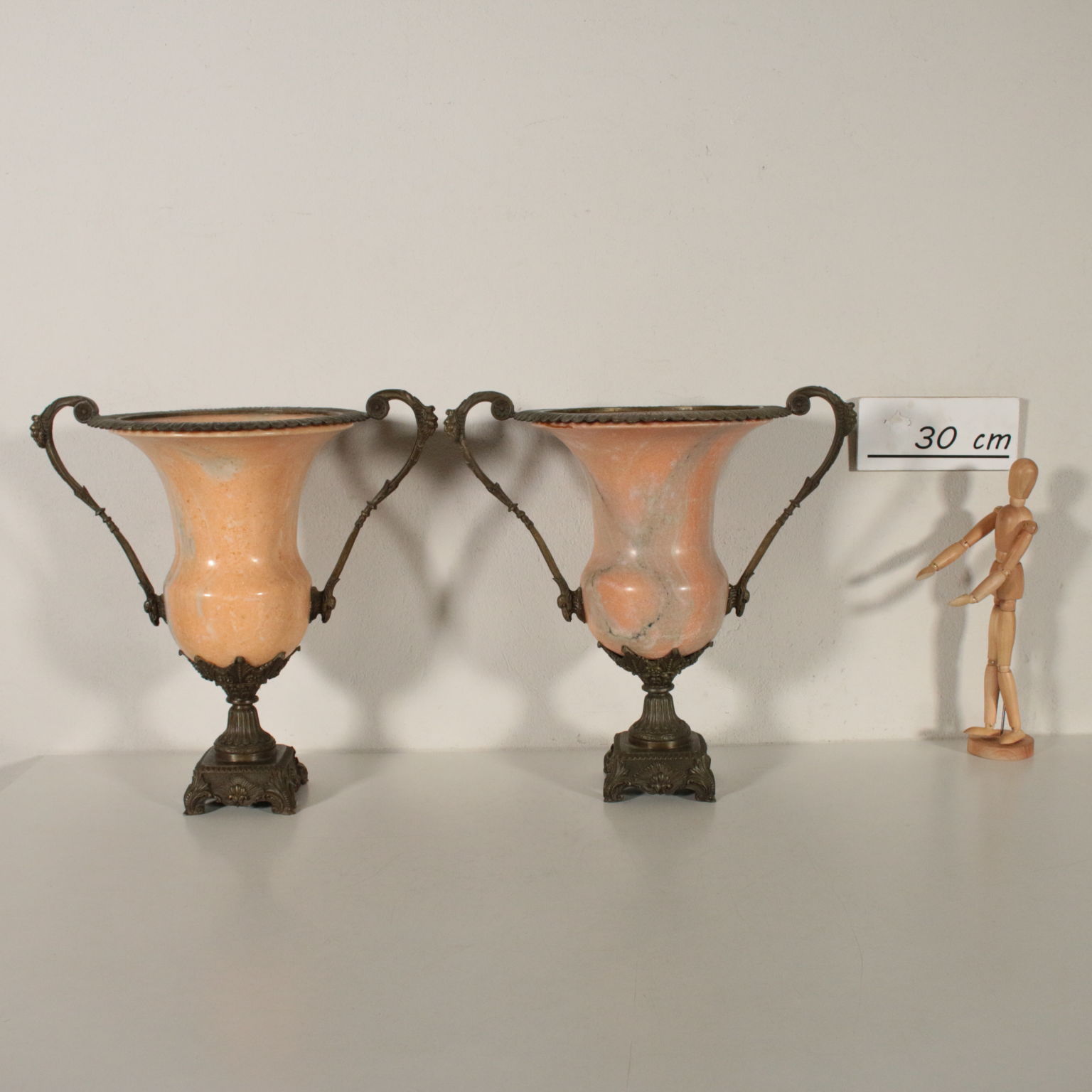 Paar Marmor- und Bronzevasen. Griff mit Voluten und Gesichter mythologischer Figuren.