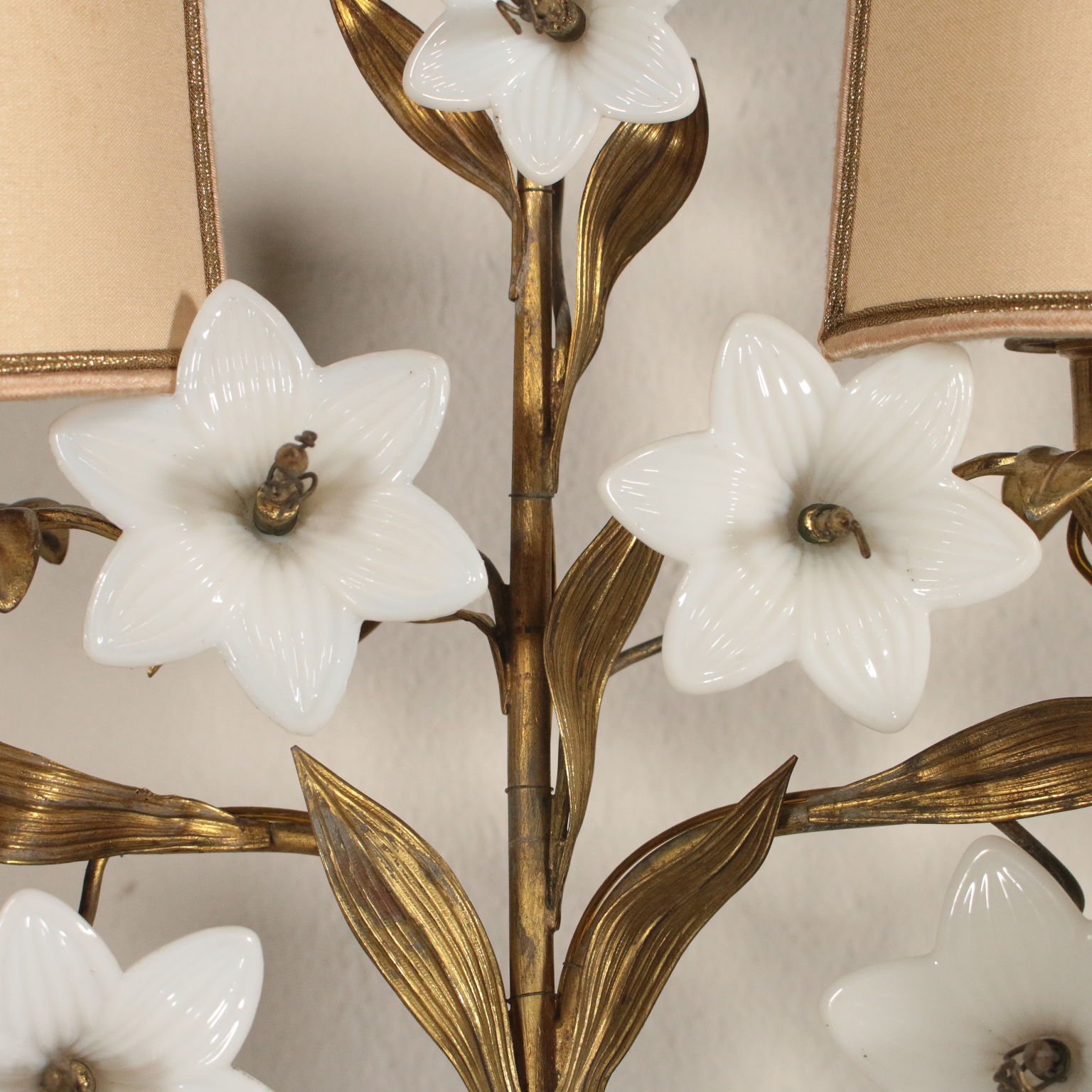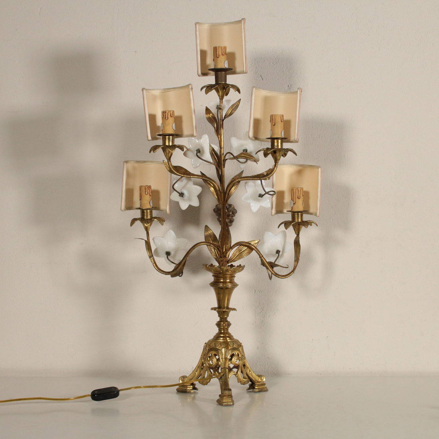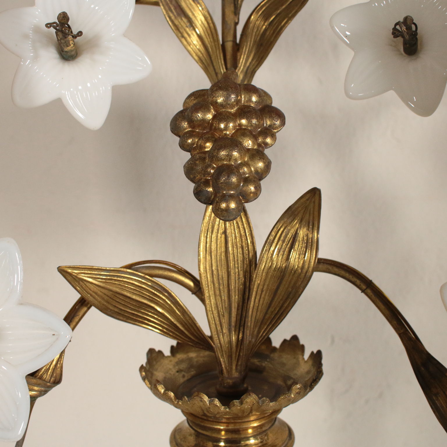 Tischlampe mit fünf Armen und Blumen aus weißem Glas.