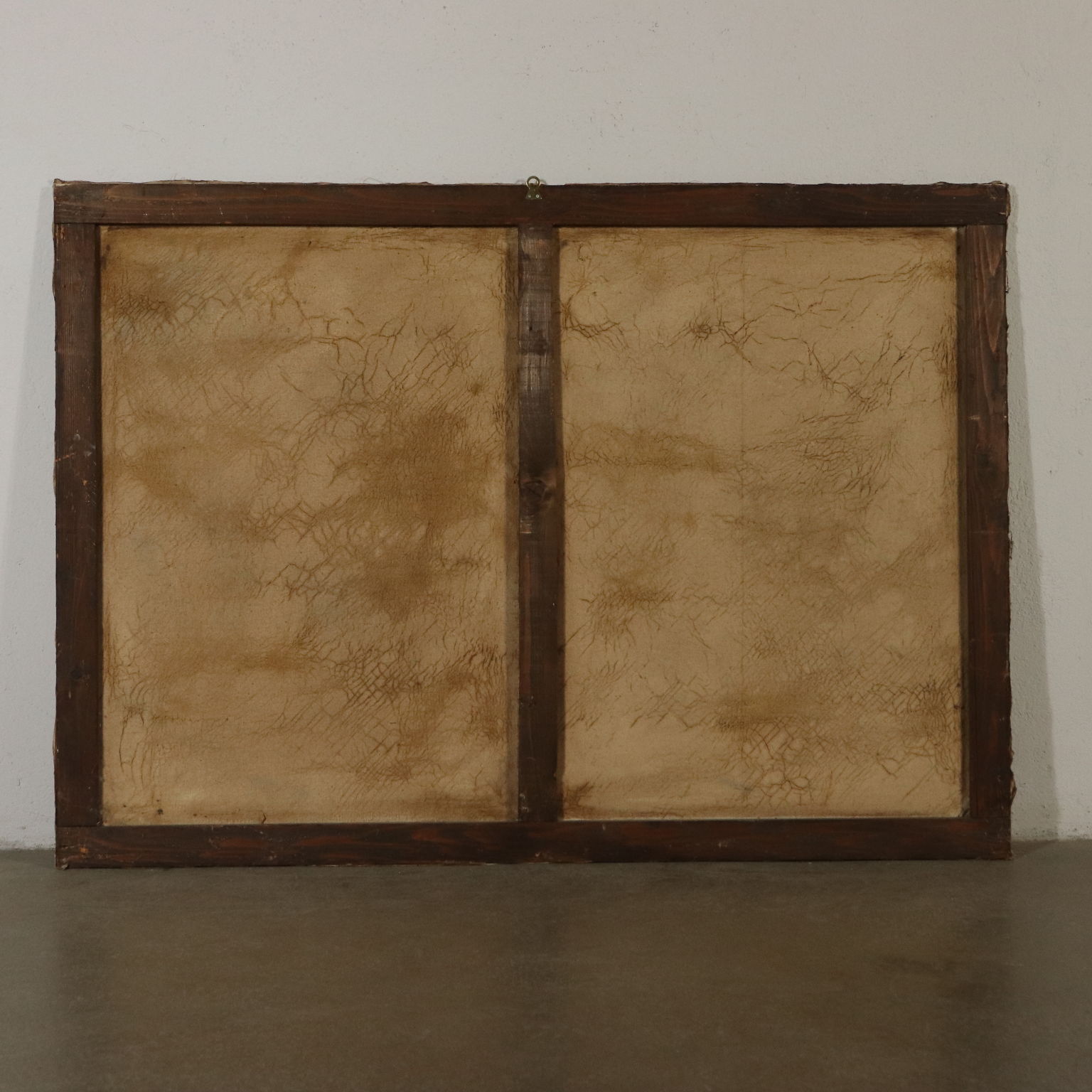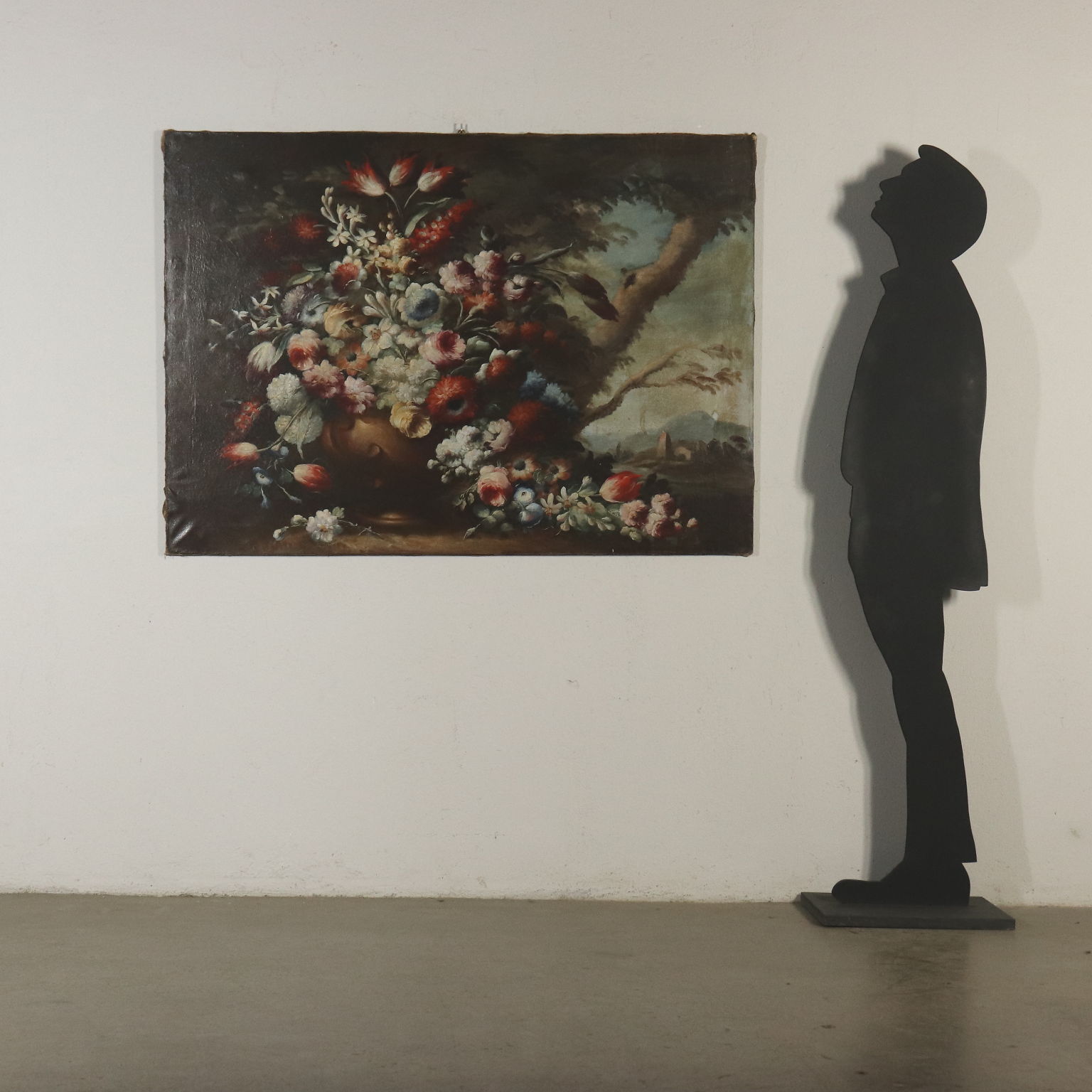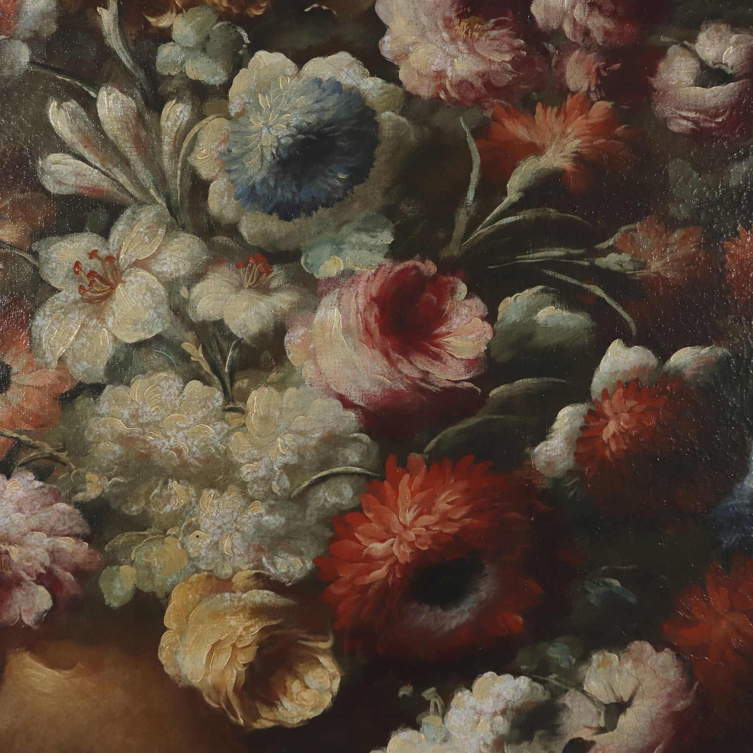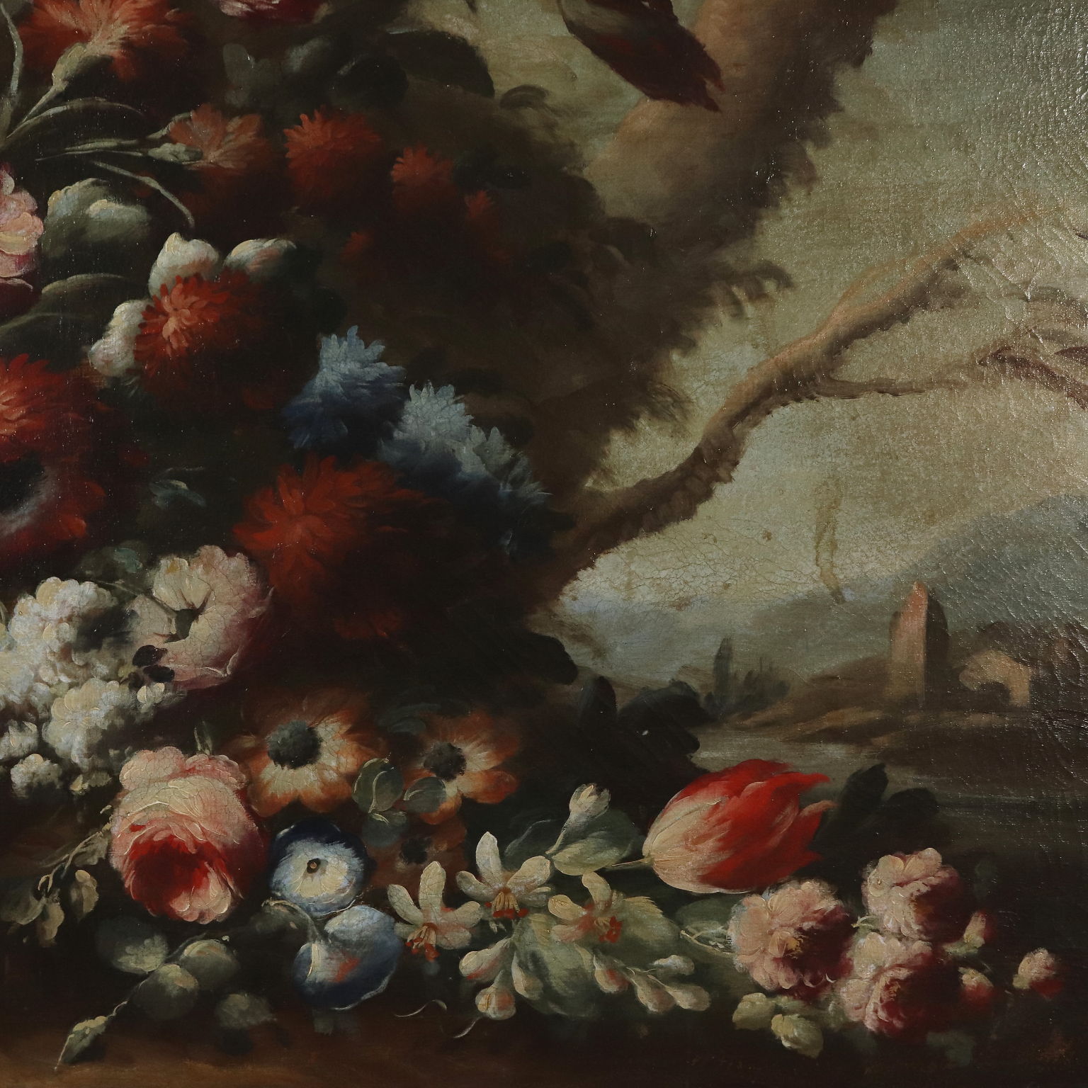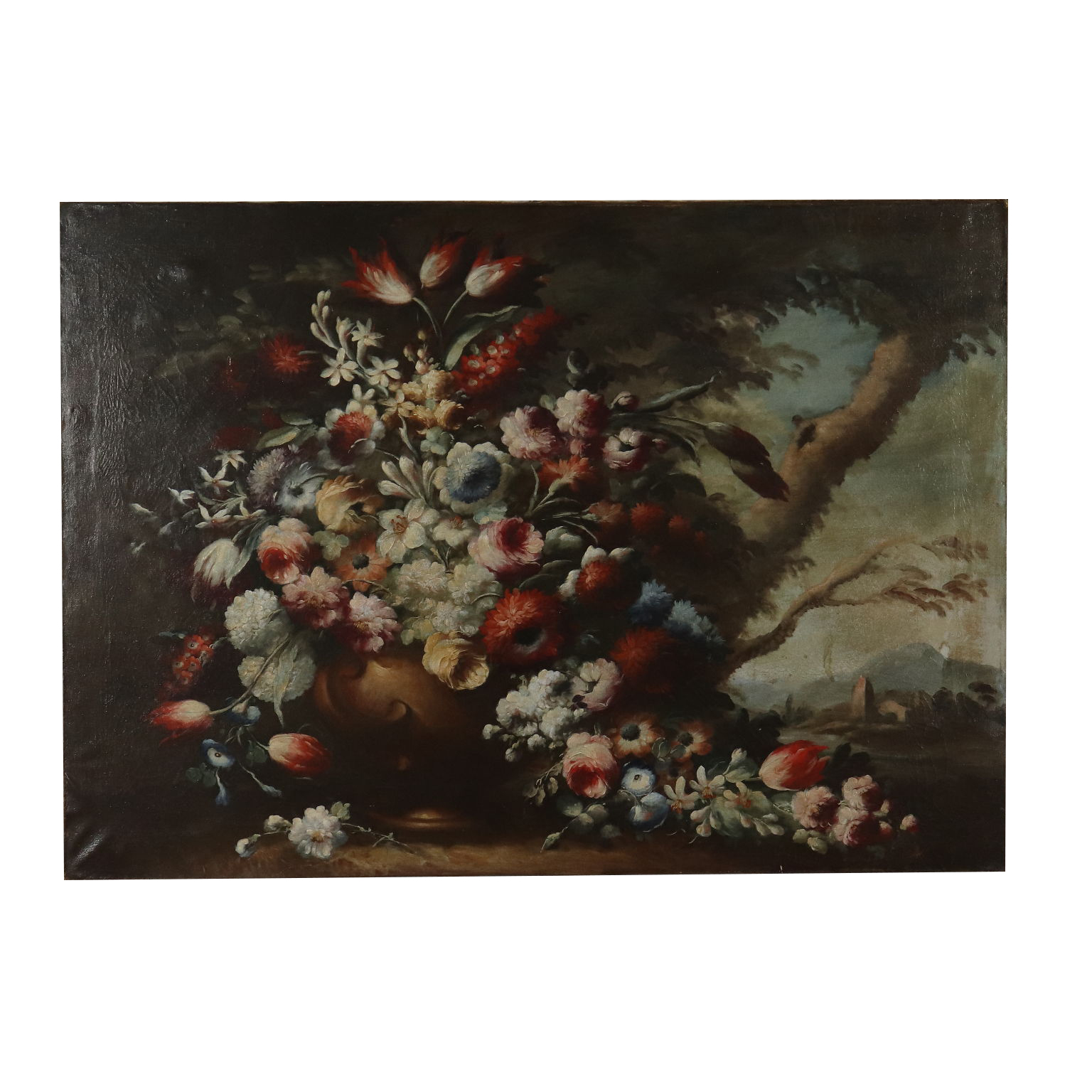 Öl auf Leinwand. Tolle Blumenkomposition in Anlehnung an antike Arbeiten, mit einem riesigen Blumenstrauß aus bunten Blumen, in einer niedrigen Vase platziert und in eine schattierte Hintergrundlandschaft eingefügt.