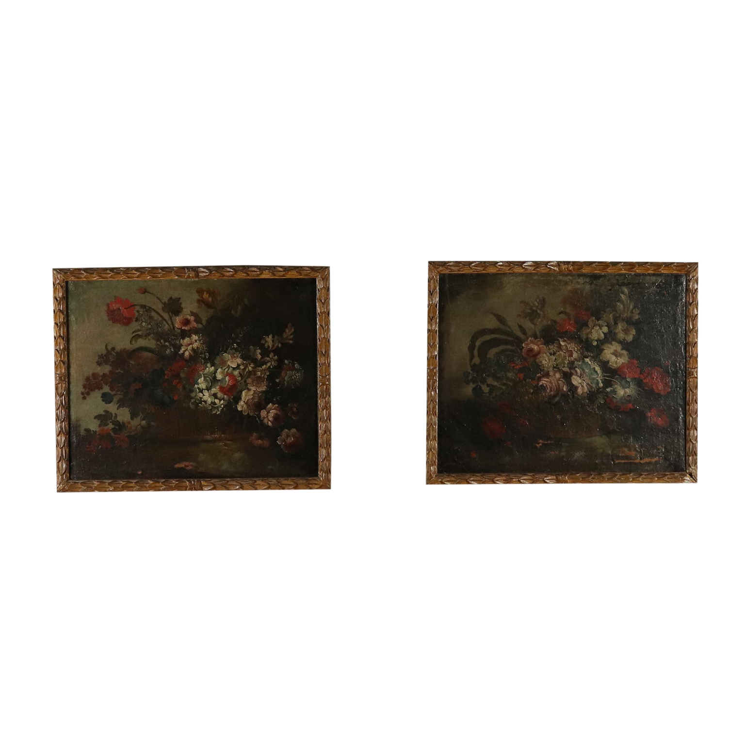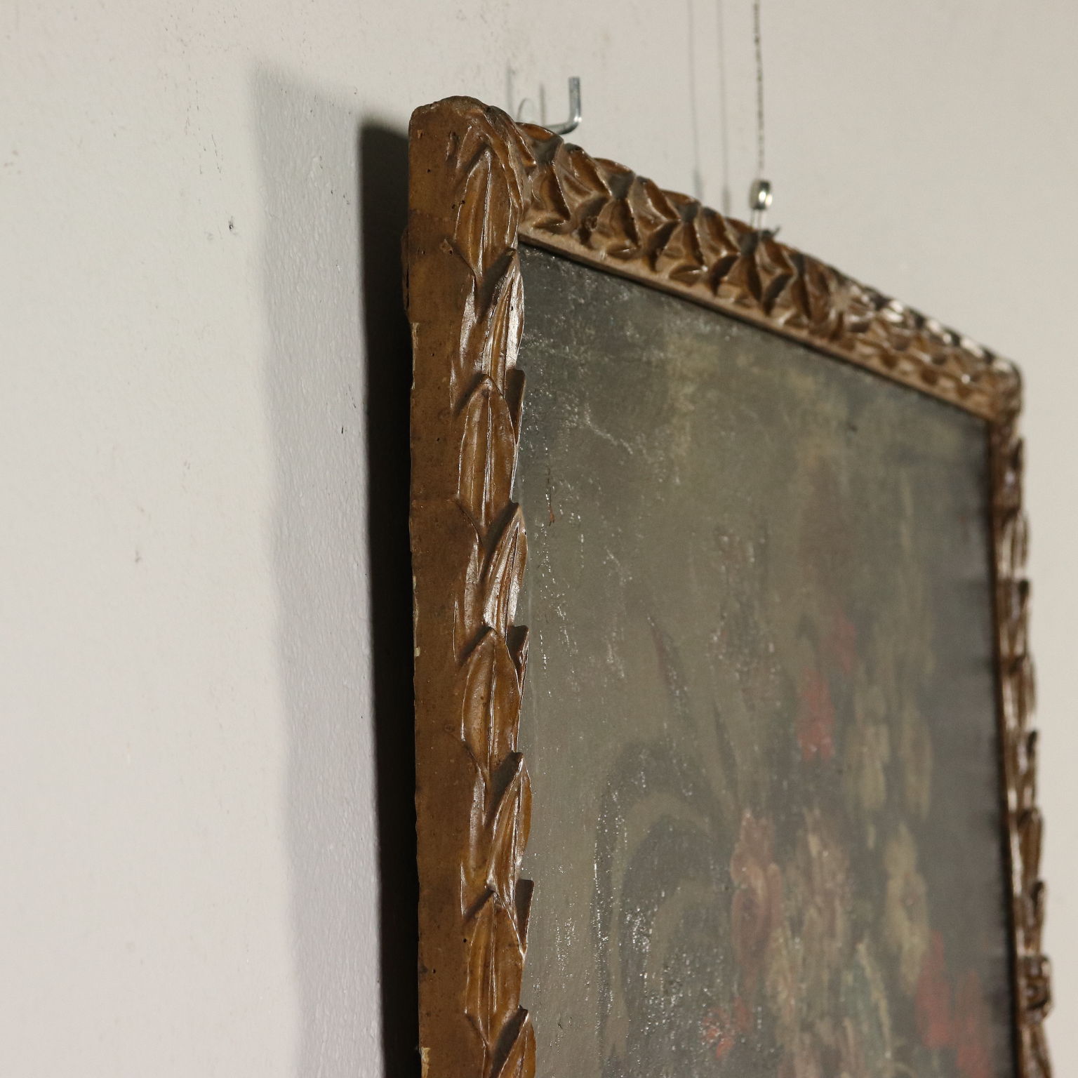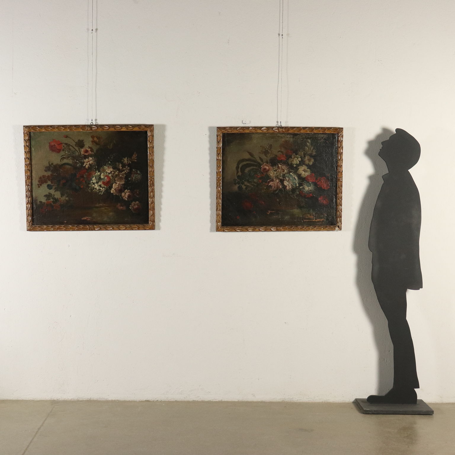 Öl auf Leinwand. Zwei schöne Kompositionen verschiedener Blumen, unordentlich angeordnet und mit Farbkontrasten in einem Korb, der kaum sichtbar ist. Die Blüten mit ihrer Wirkung von brillanten chromatischen Flecken, wenn auch mit schattierten Konturen und einer nebligen Hintergrundlandschaft, beziehen sich auf venezianisch-lombardische Elemente. Sie werden auf der ersten Leinwand und in zeitgenössischen Rahmen präsentiert. Sie haben einige Farbtropfen.