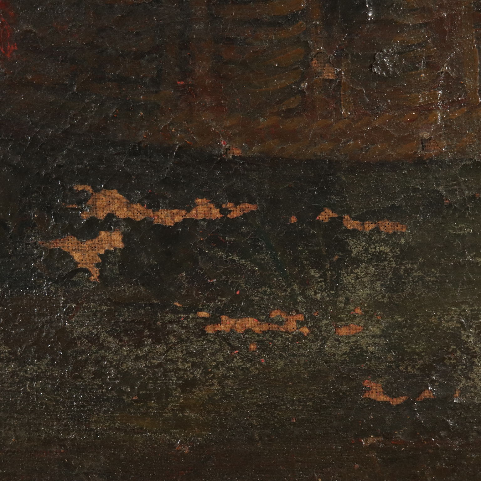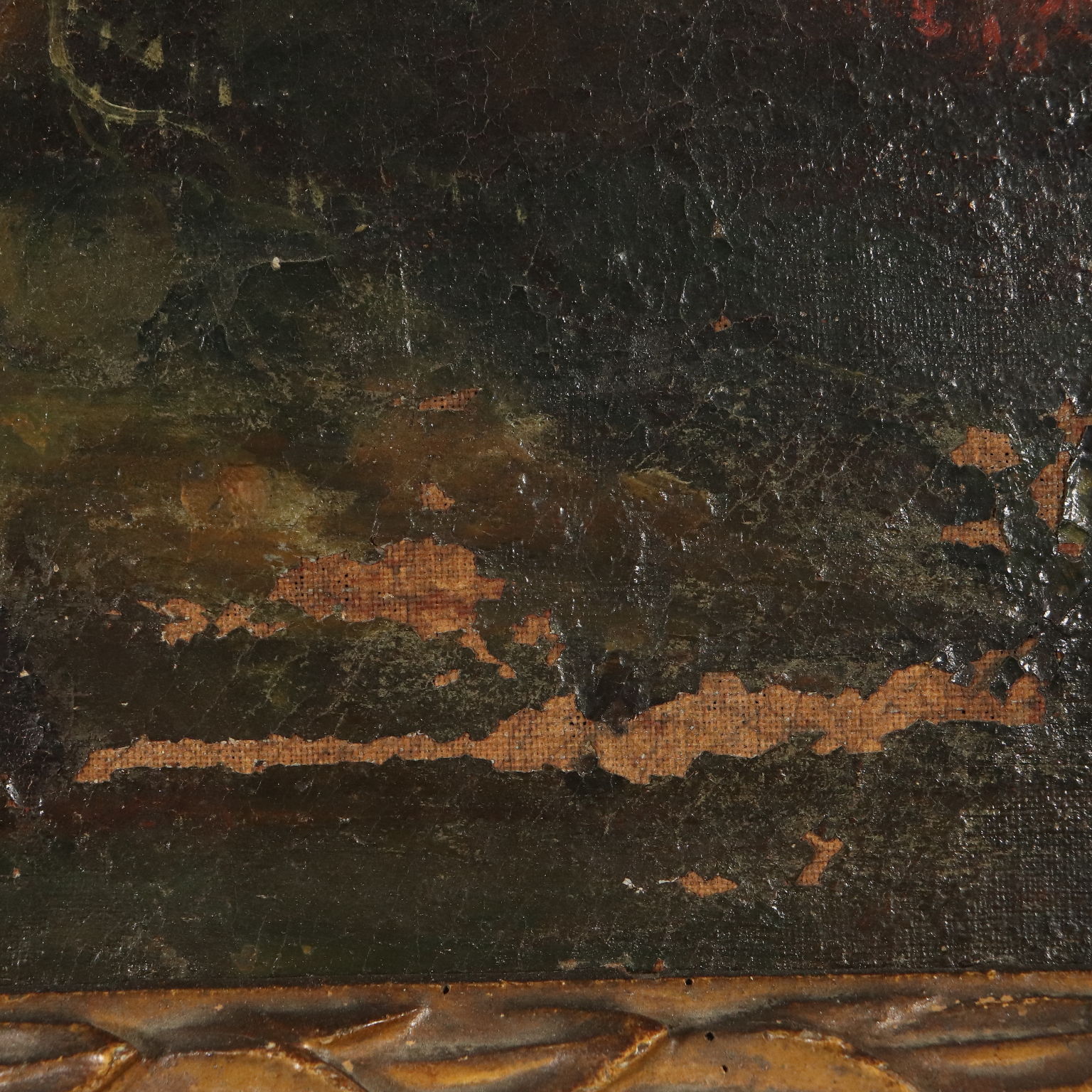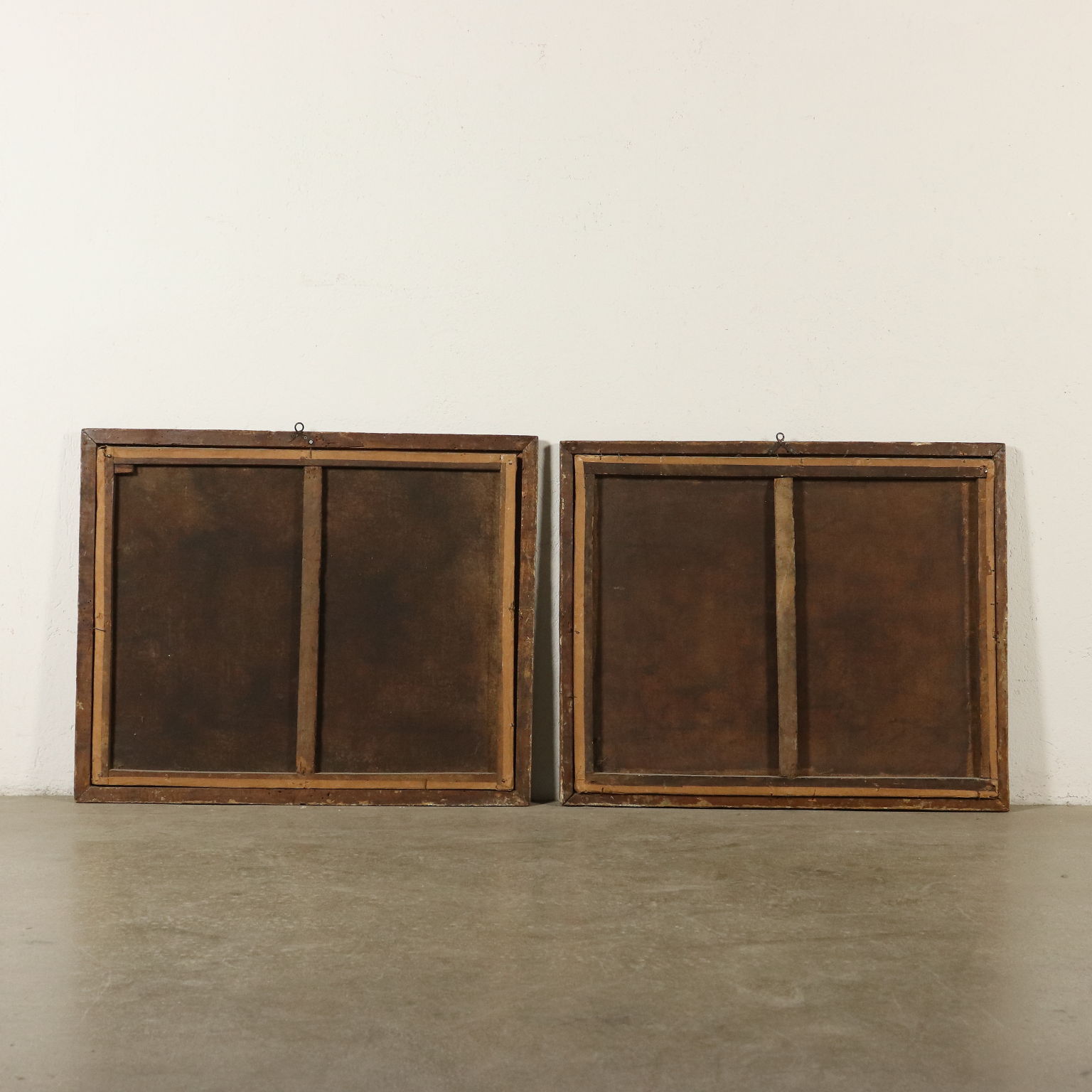 Öl auf Leinwand. Zwei schöne Kompositionen verschiedener Blumen, unordentlich angeordnet und mit Farbkontrasten in einem Korb, der kaum sichtbar ist. Die Blüten mit ihrer Wirkung von brillanten chromatischen Flecken, wenn auch mit schattierten Konturen und einer nebligen Hintergrundlandschaft, beziehen sich auf venezianisch-lombardische Elemente. Sie werden auf der ersten Leinwand und in zeitgenössischen Rahmen präsentiert. Sie haben einige Farbtropfen.