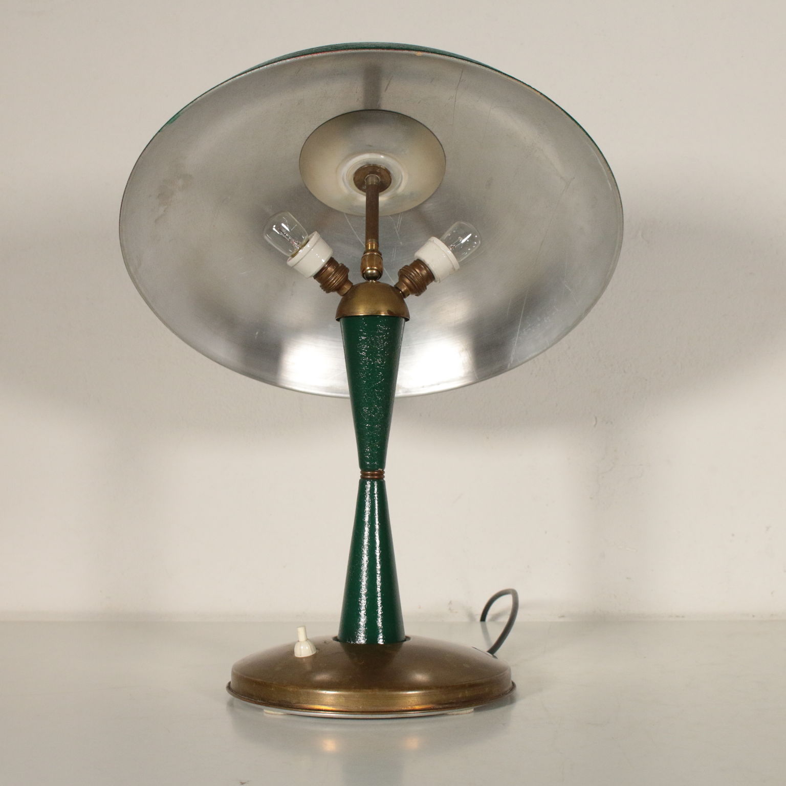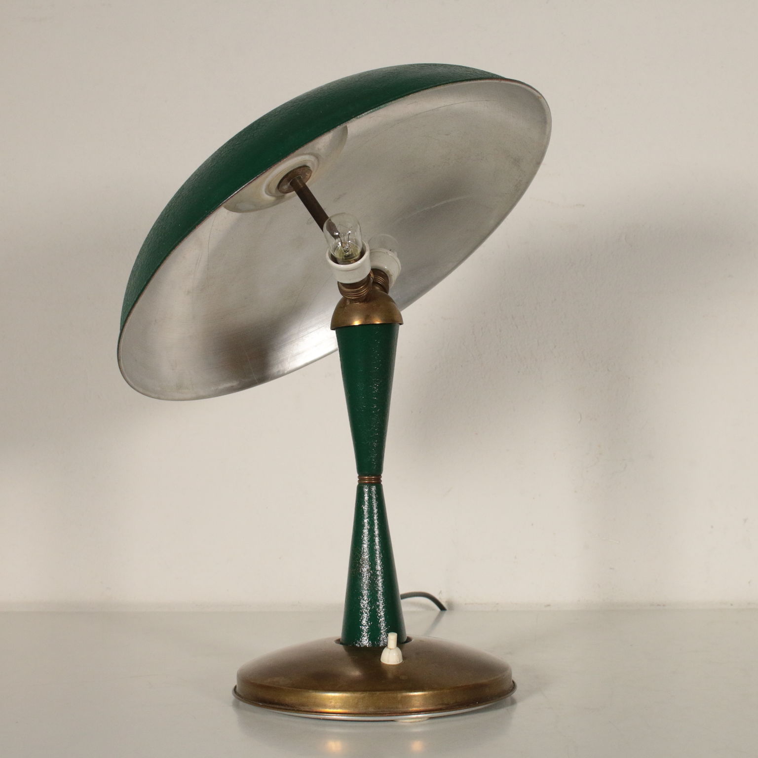 Tischlampe mit einstellbaren Oberteil. Lackiertes Aluminium, Messing. Hergestellt in Italien, 40er-50er Jahre.