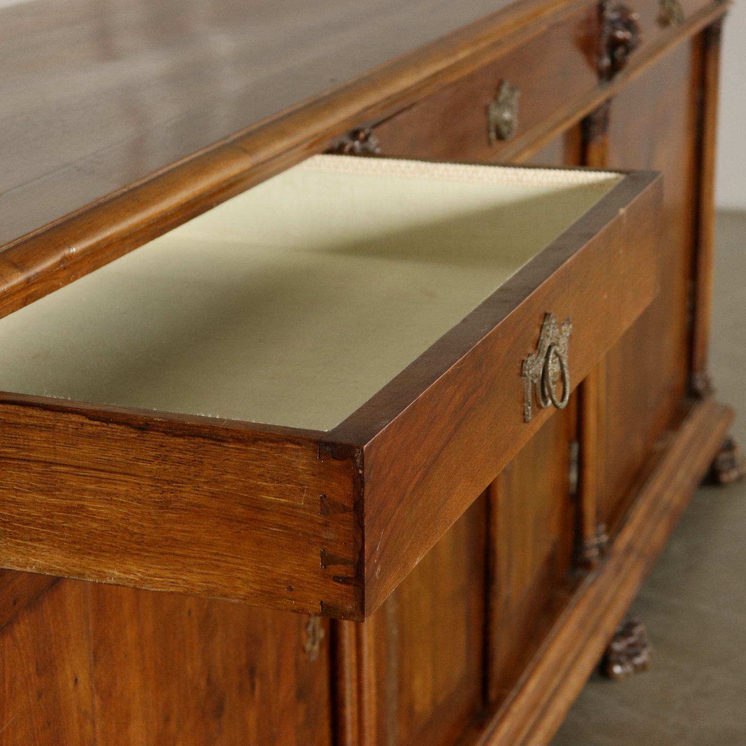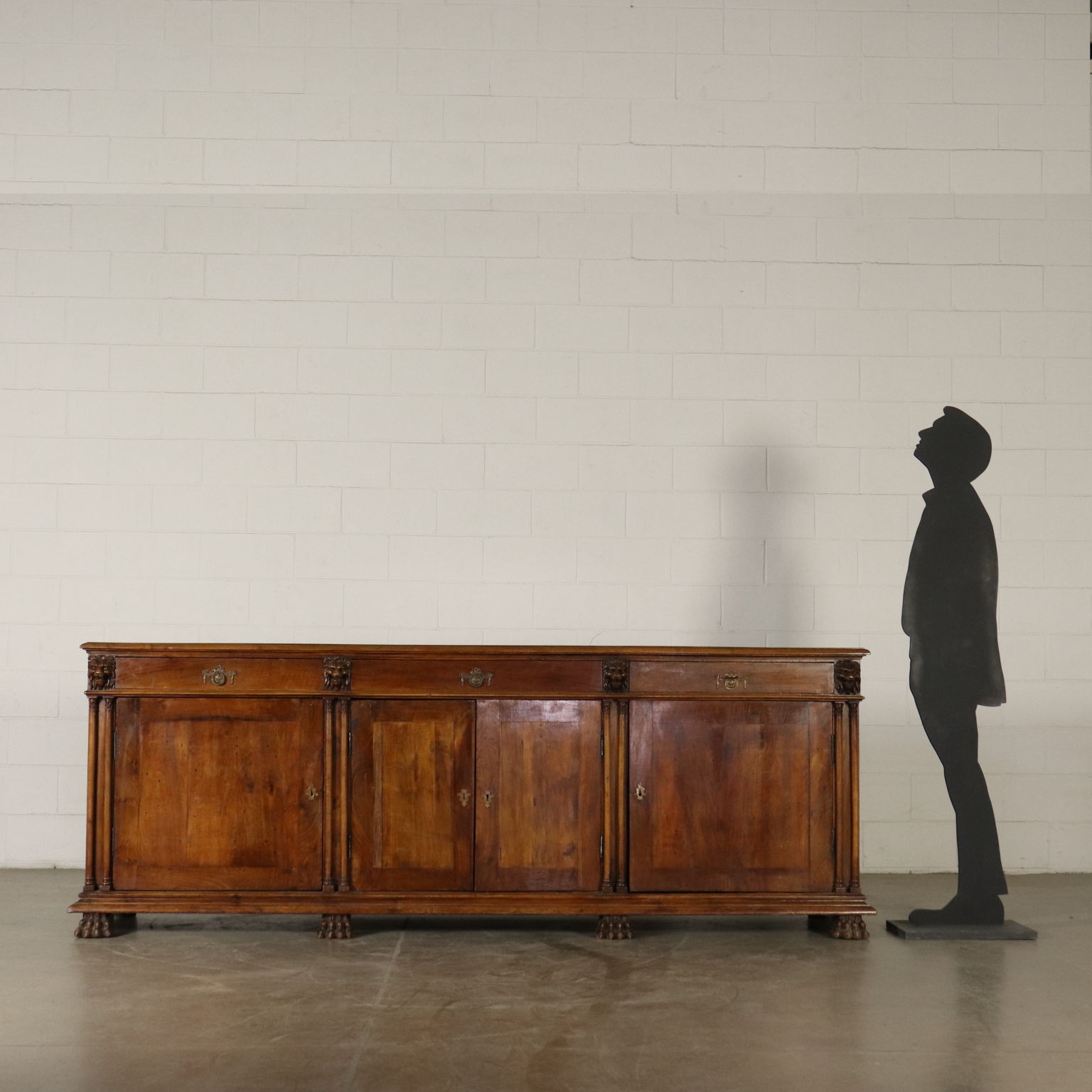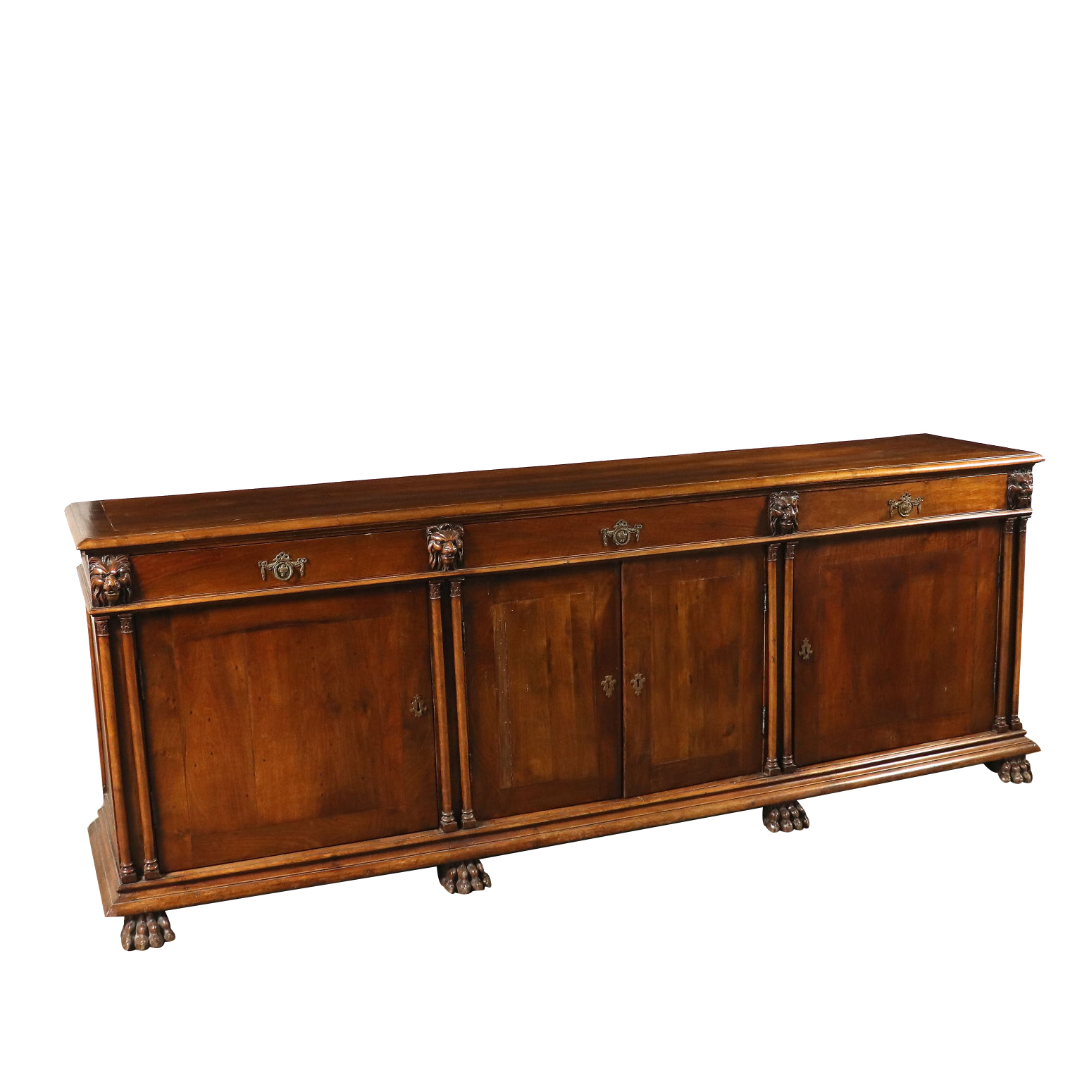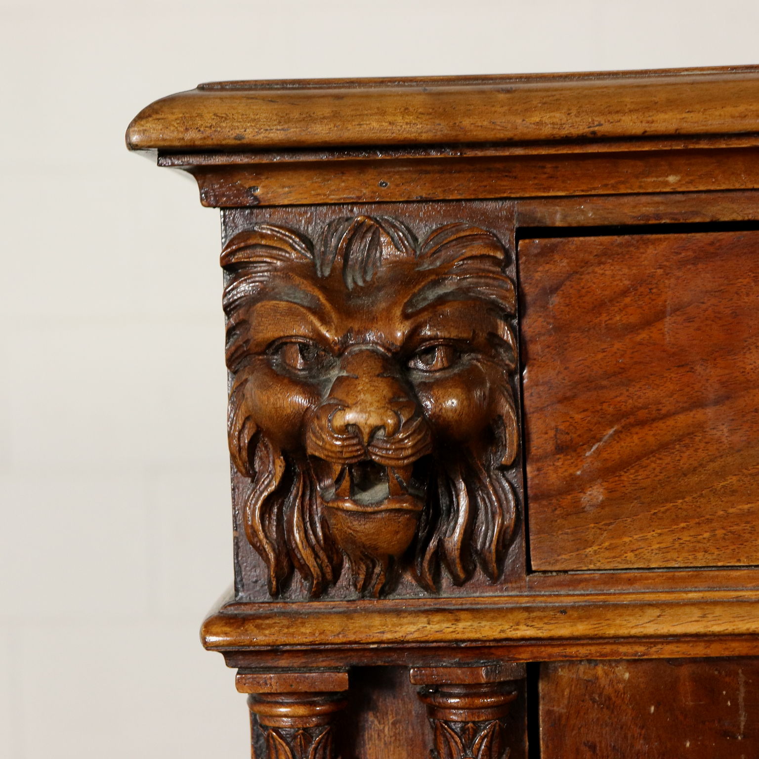 Küchenschrank im Stil, vier Türen und drei Schubladen unter der Platte. Stützen mit doppelte Säulen. Geschnitzte Löwenköpfen. Hergestellt in Italien, 20. Jahrhundert.