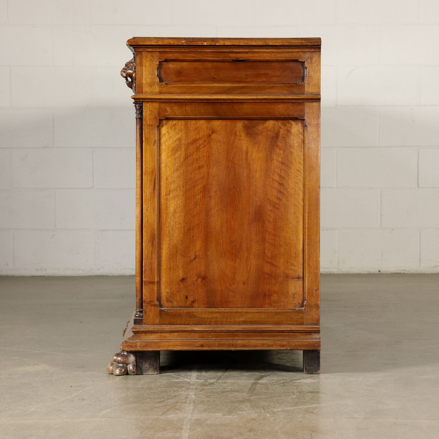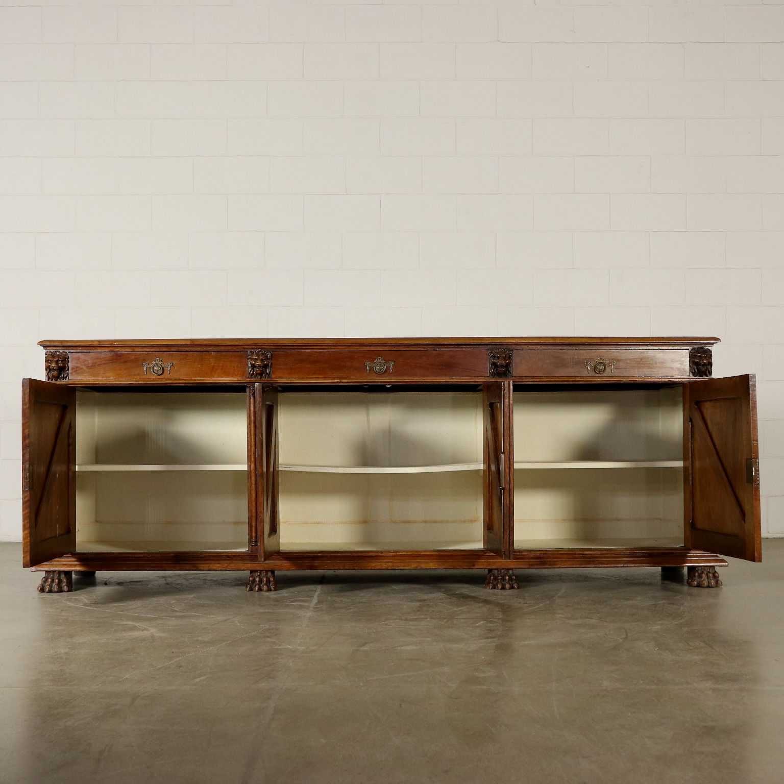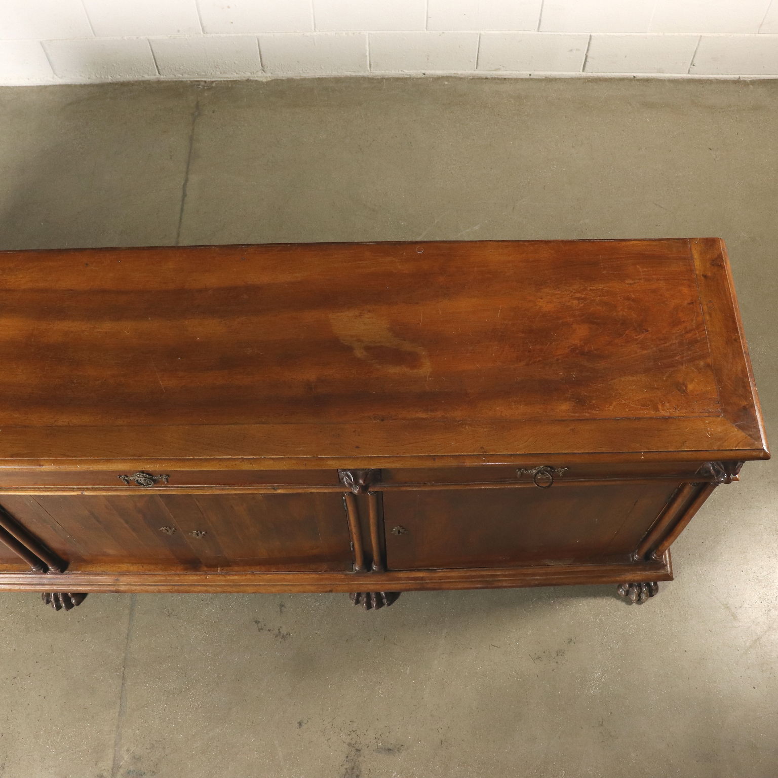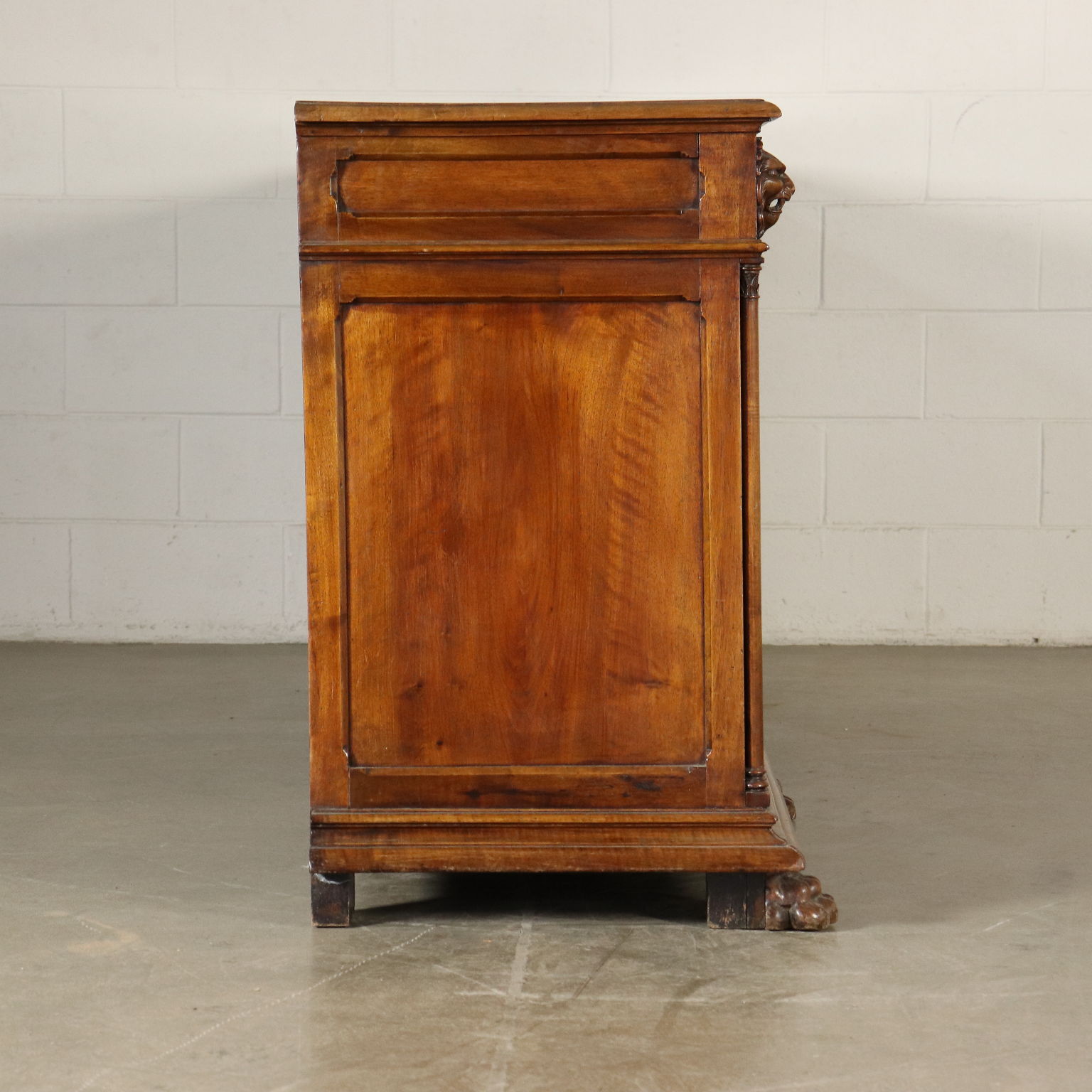 Küchenschrank im Stil, vier Türen und drei Schubladen unter der Platte. Stützen mit doppelte Säulen. Geschnitzte Löwenköpfen. Hergestellt in Italien, 20. Jahrhundert.