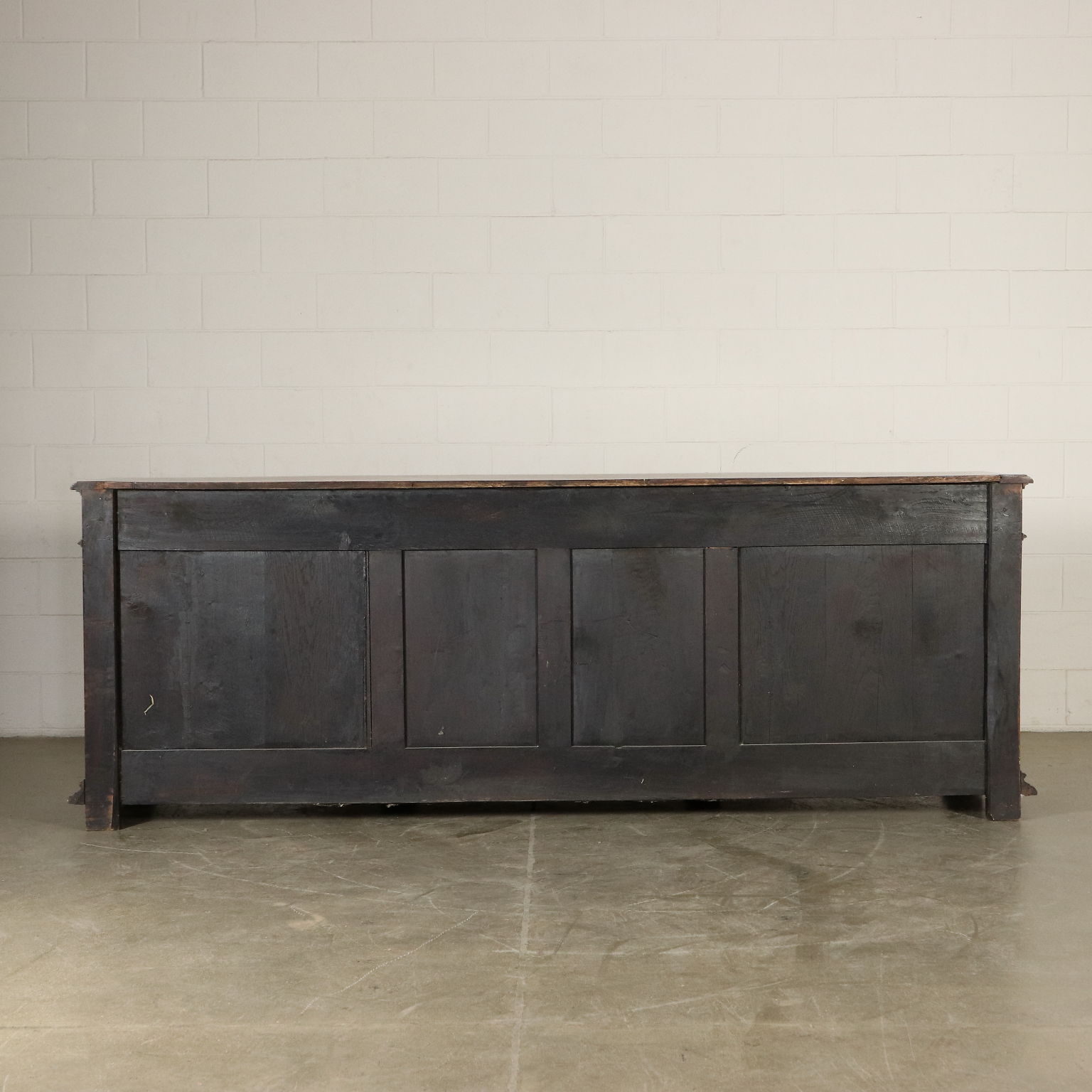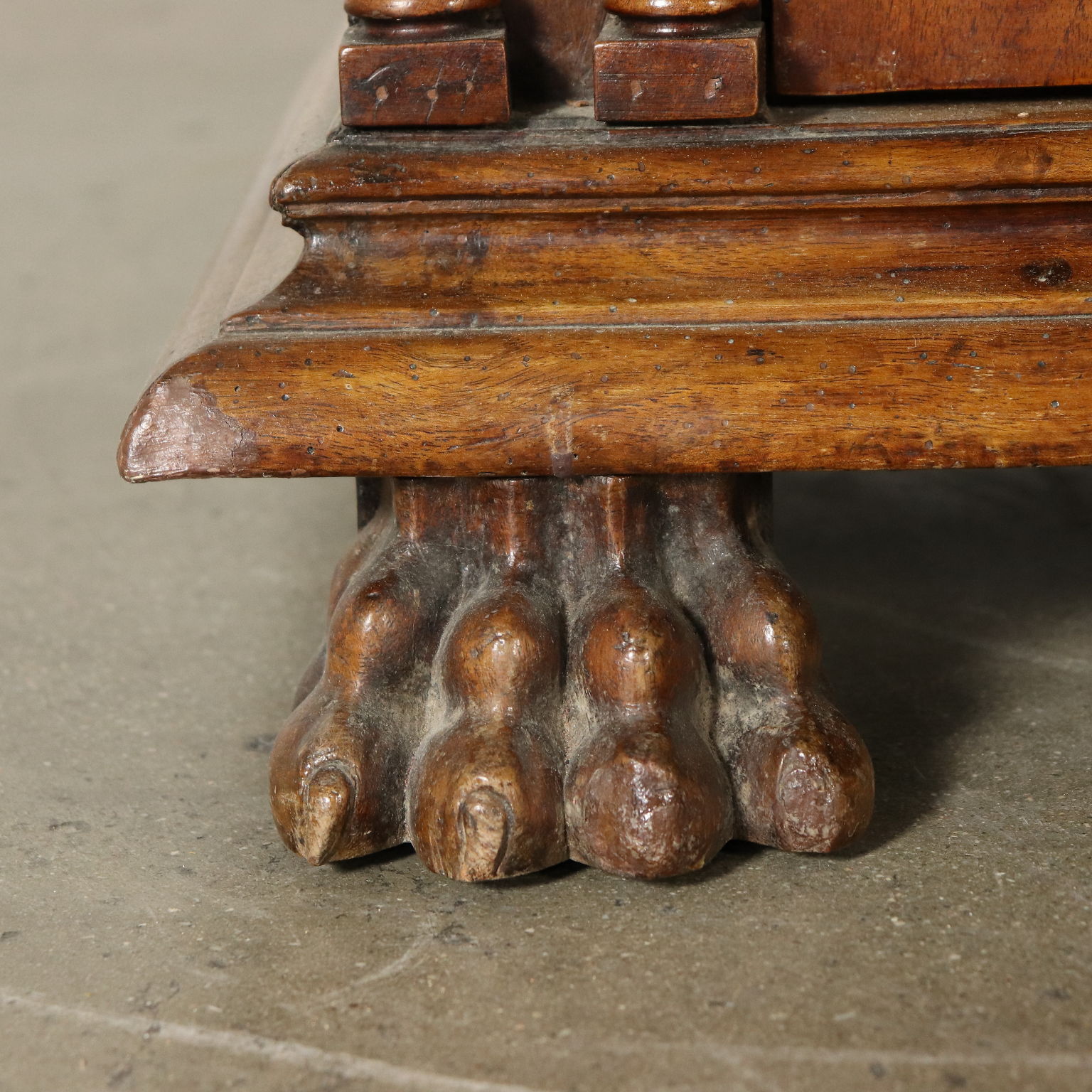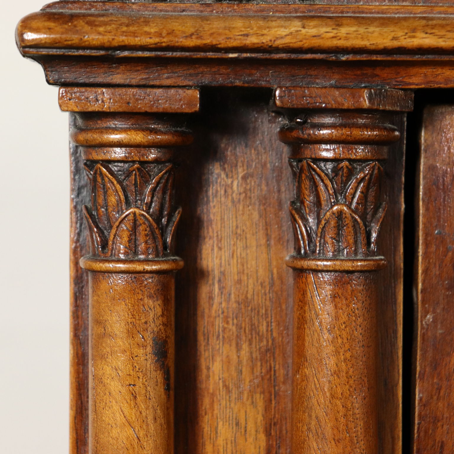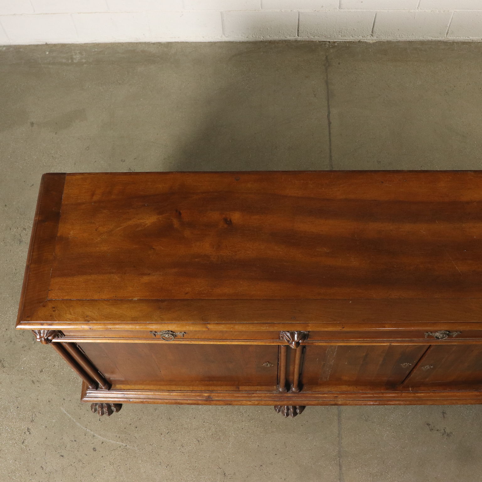 Küchenschrank im Stil, vier Türen und drei Schubladen unter der Platte. Stützen mit doppelte Säulen. Geschnitzte Löwenköpfen. Hergestellt in Italien, 20. Jahrhundert.