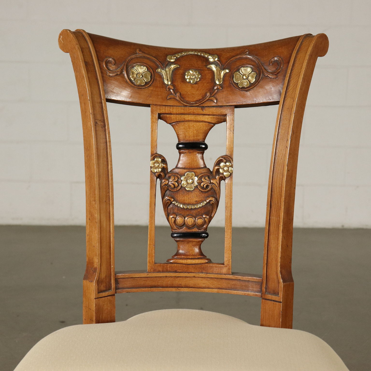 Acht Stühle und vier Sessel mit offenen geschnitzen Rücklehne. Gepolsterte Sitze und vergoldete Schnitzerei. Hergestellt in Italien, 20. Jahrhundert.