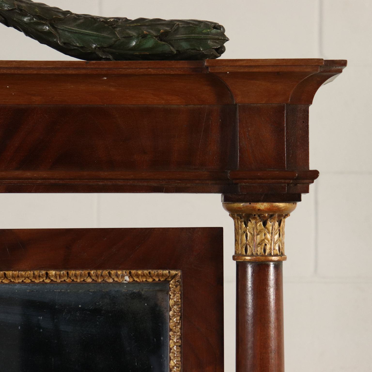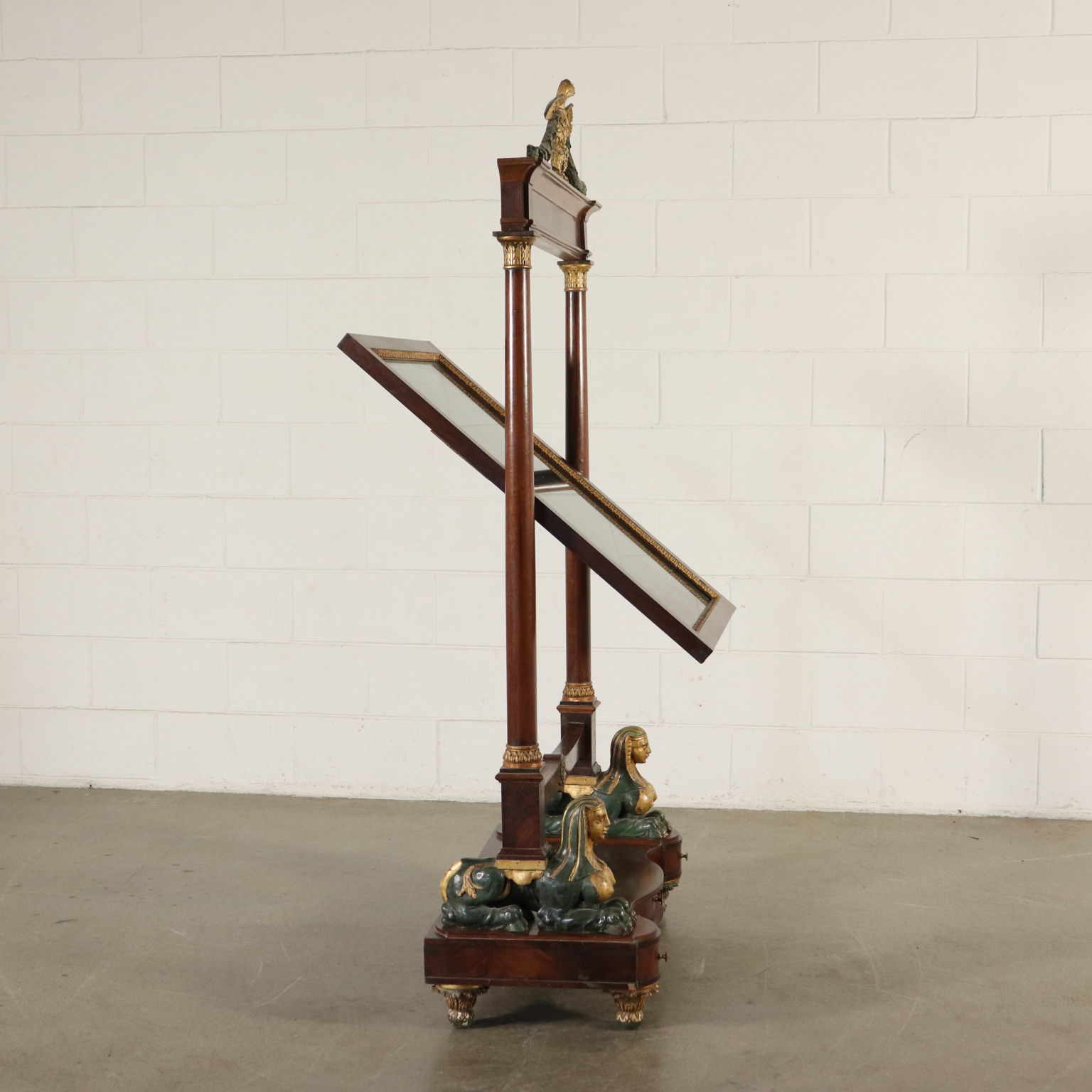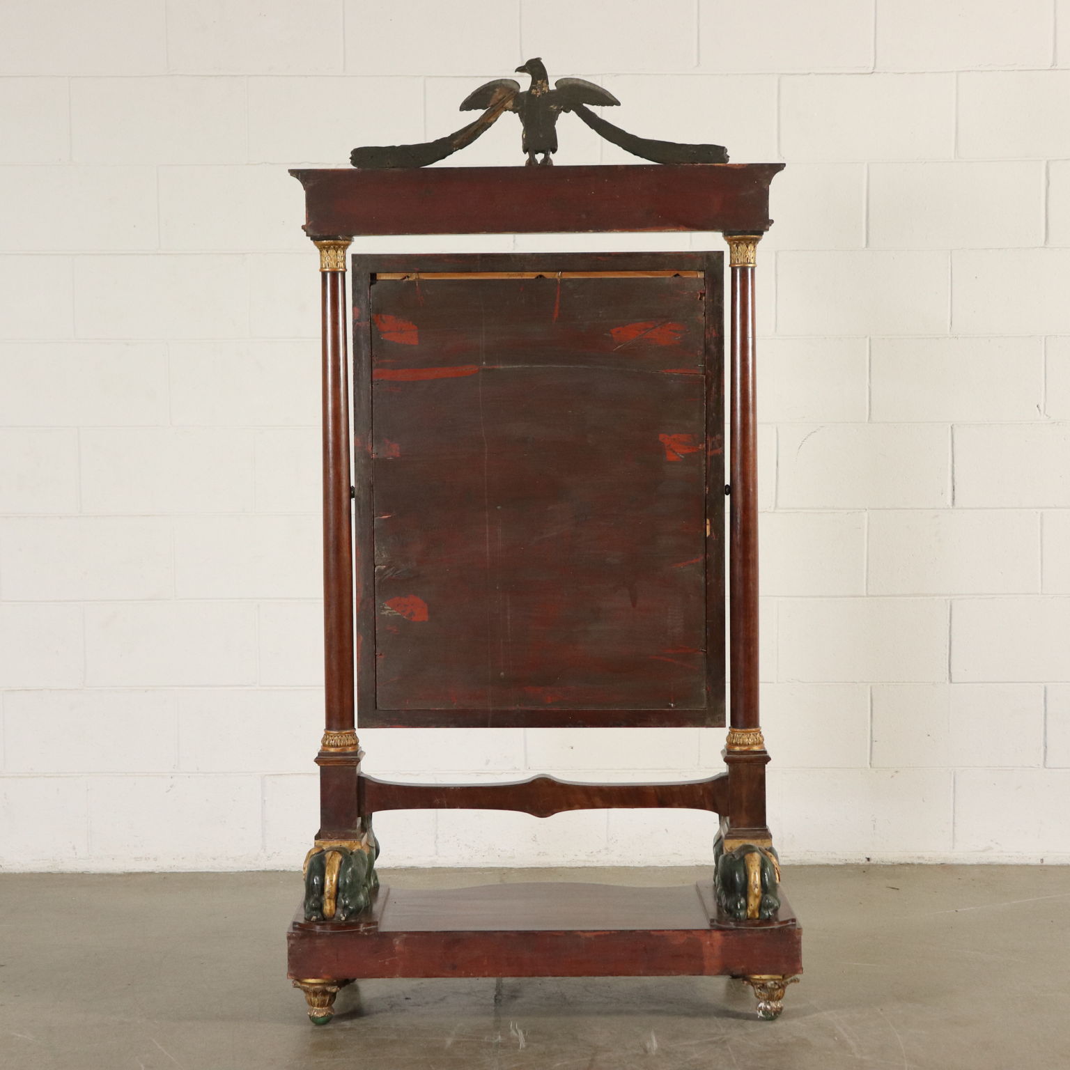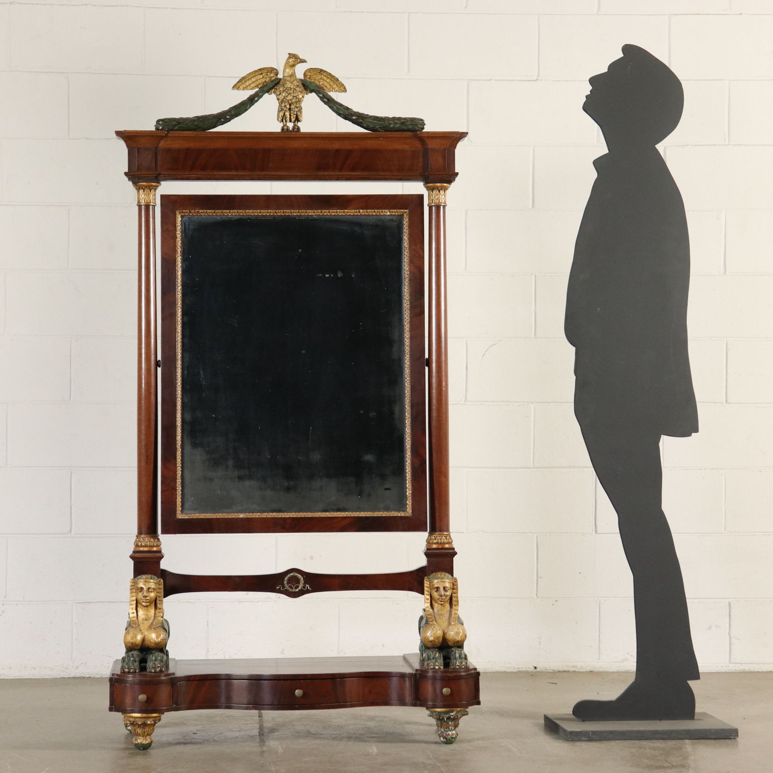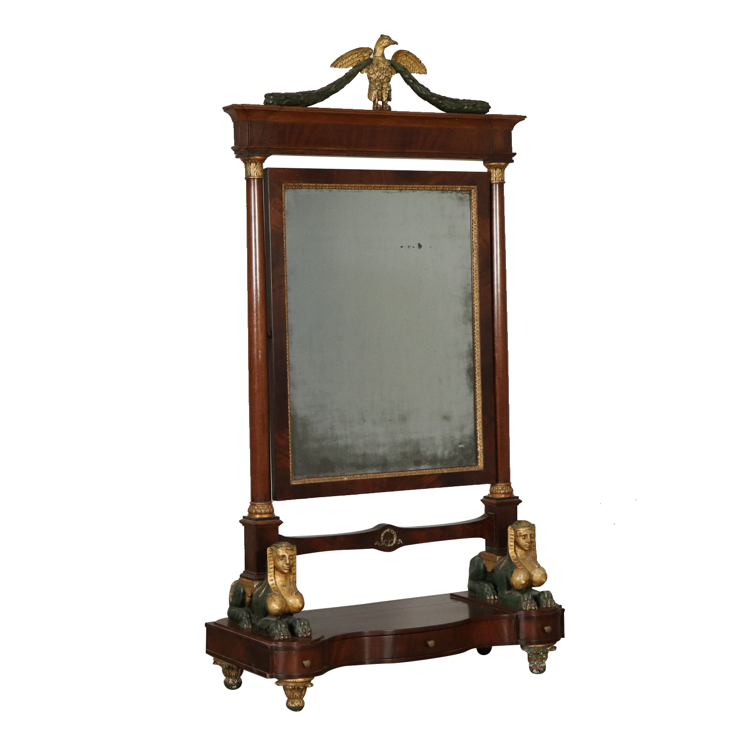 Elegante psyche Empire präsentiert profilierten sockel mit drei schubladen. Paar sphingen geschnitzt halten, säulen mit kapitellen. Adler geschnitzt mit serti lorbeer. Kerben lackiert in polychromie. Spiegel kippen.