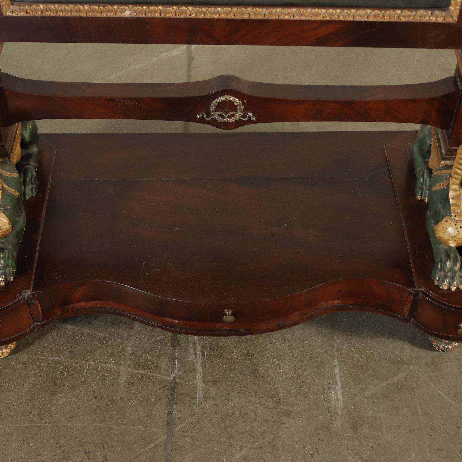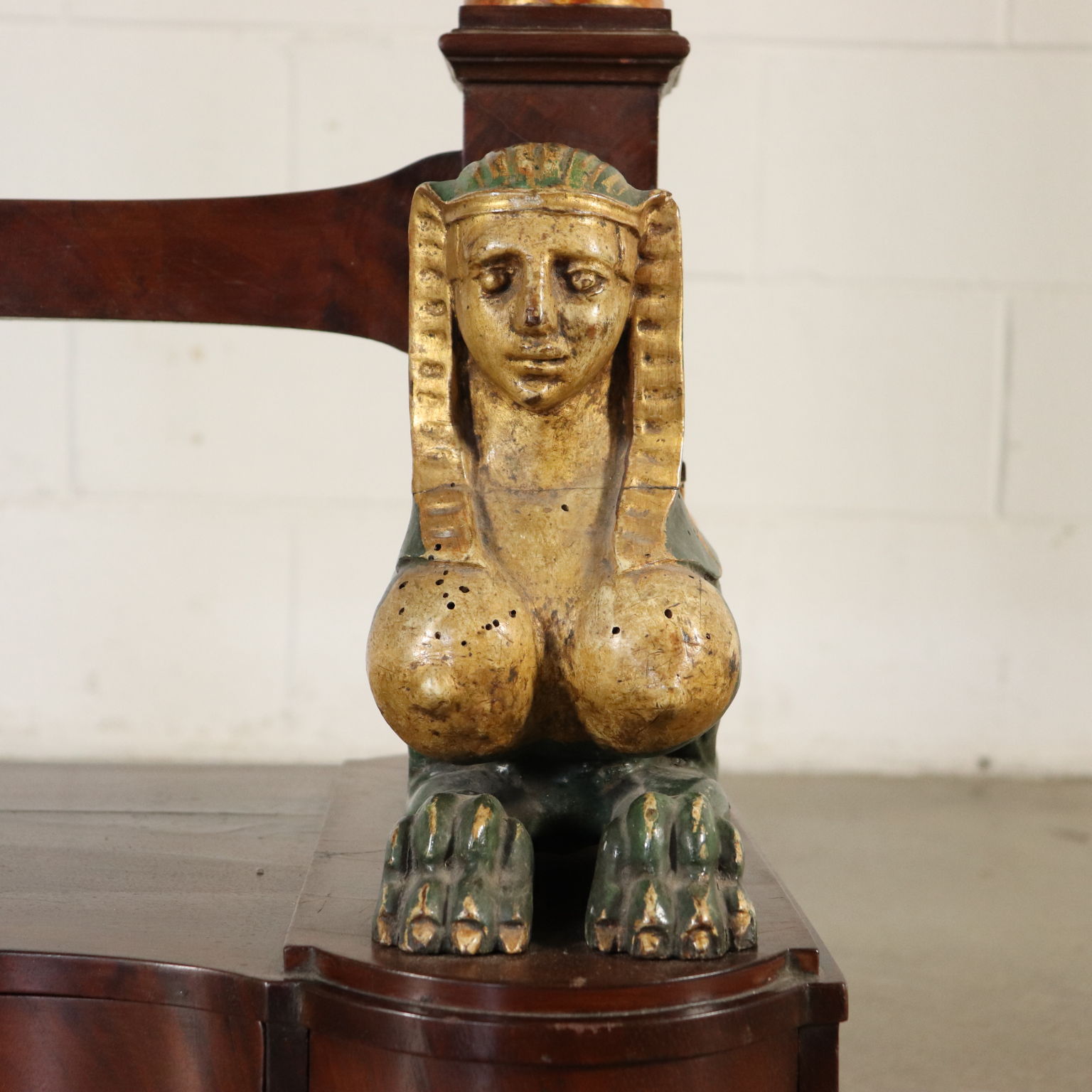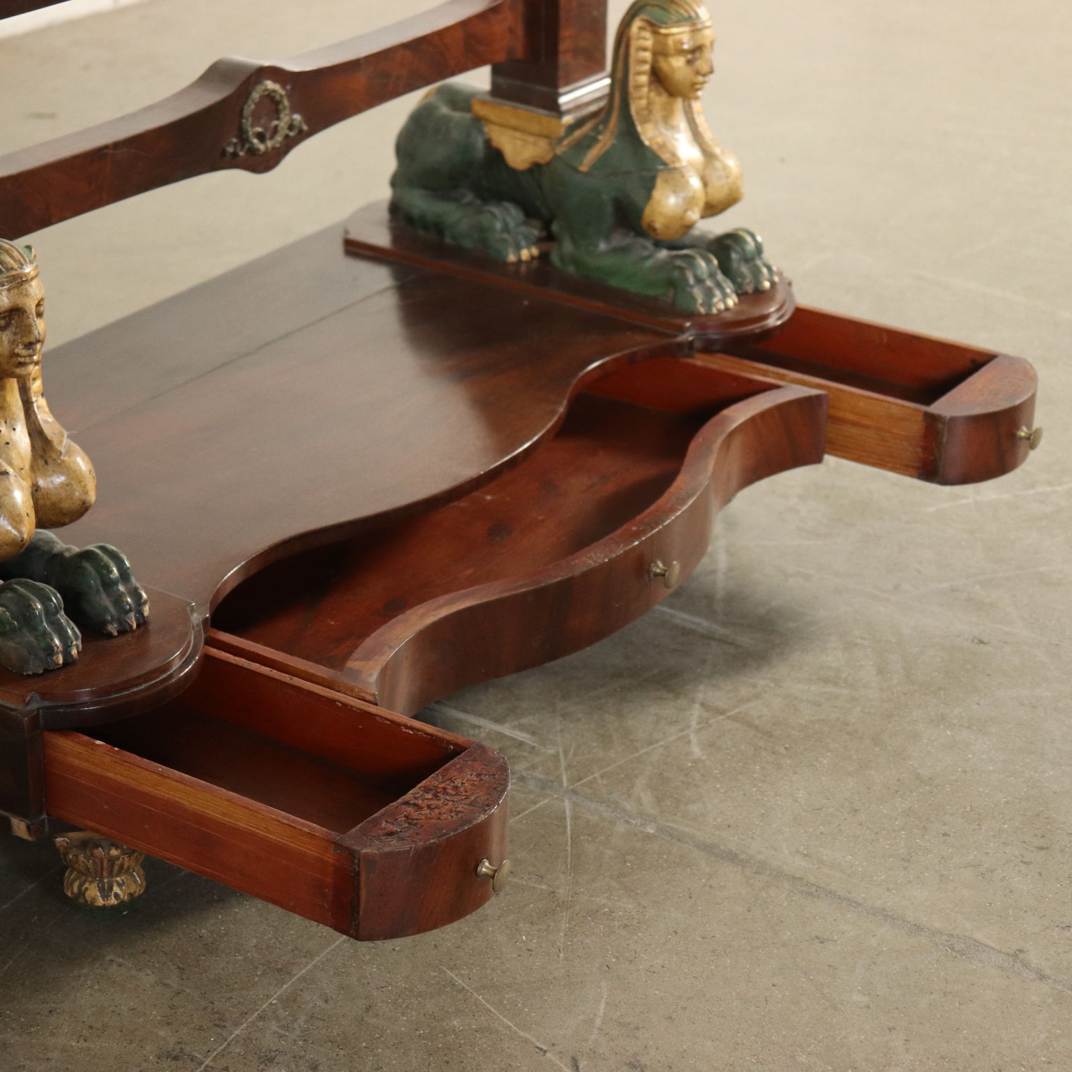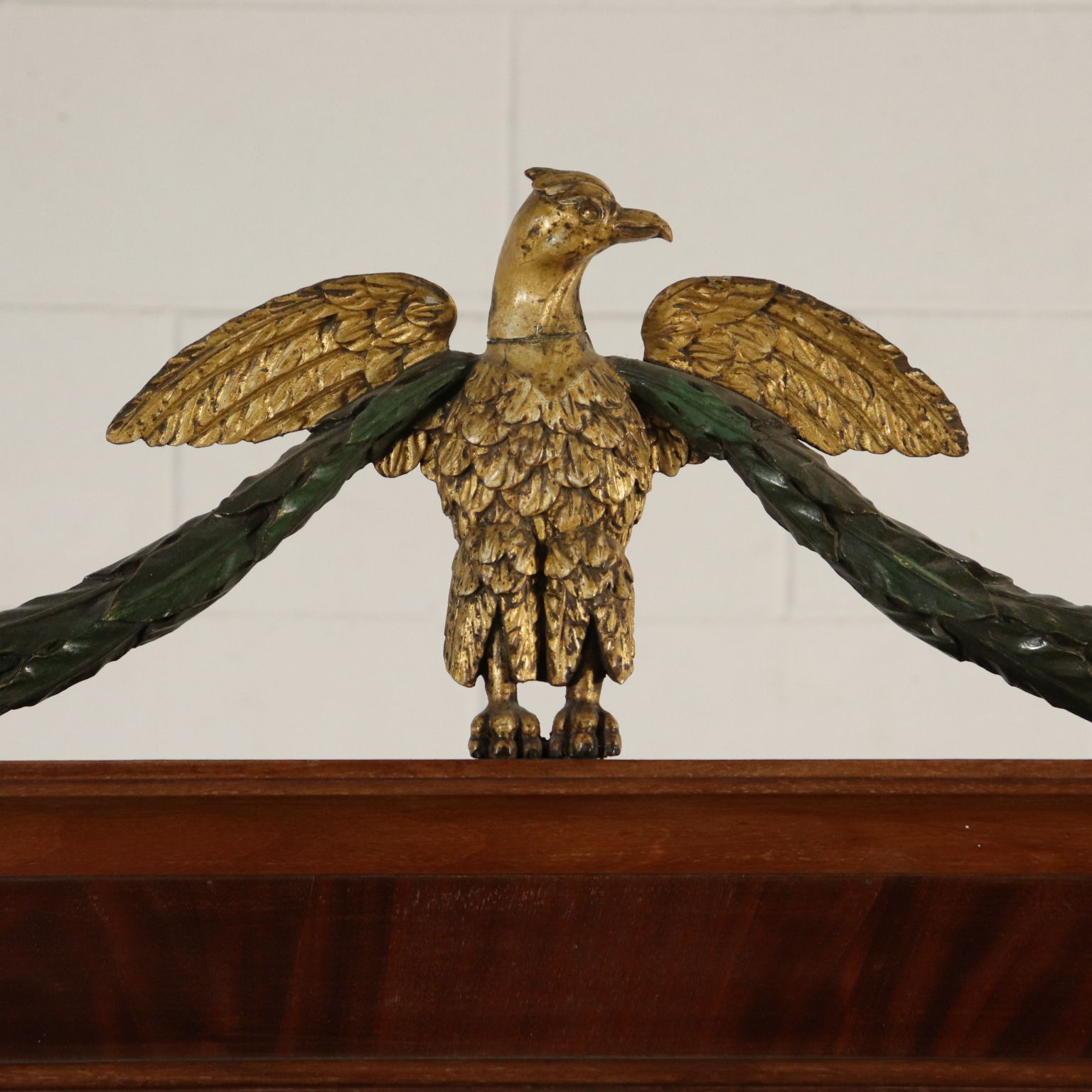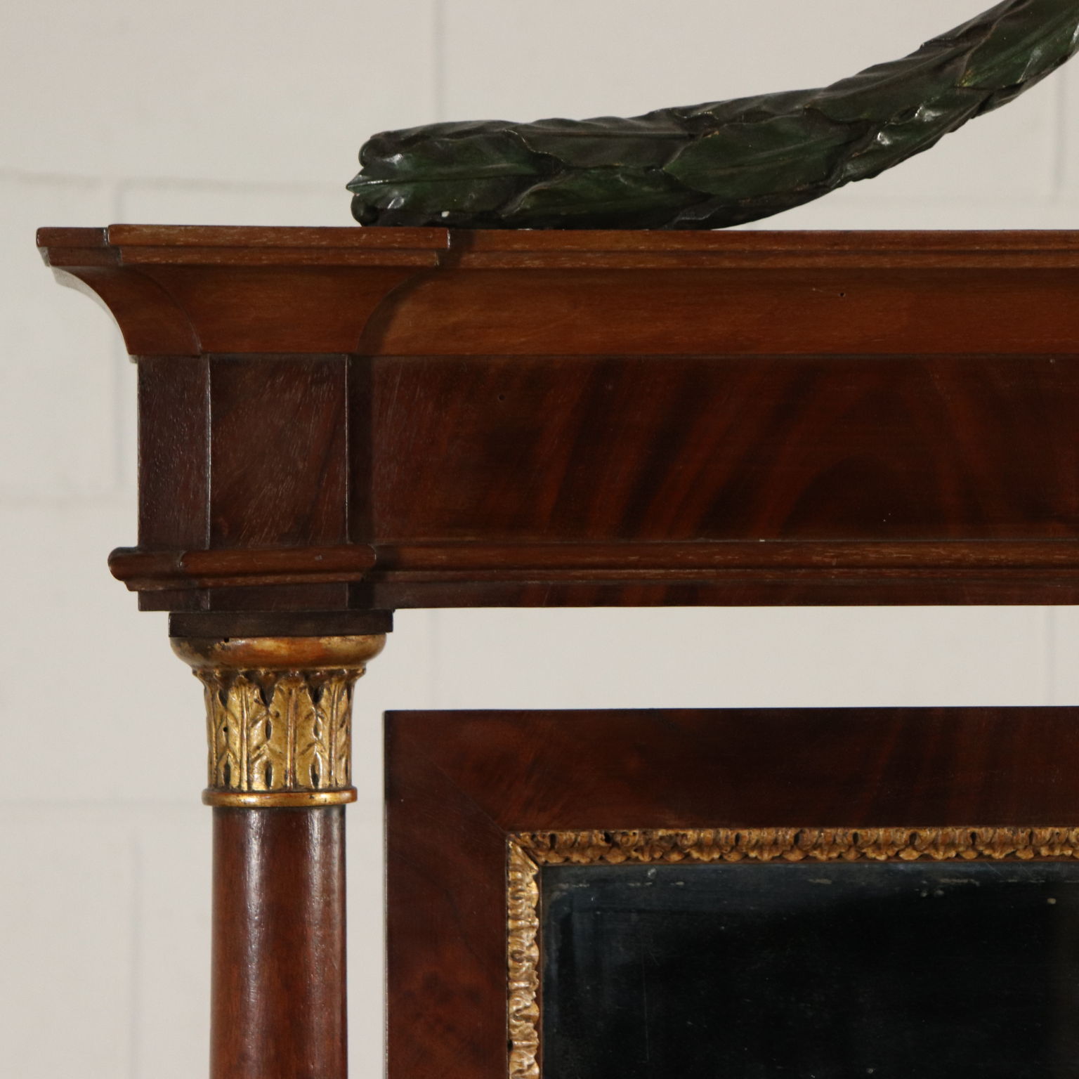Elegante psyche Empire präsentiert profilierten sockel mit drei schubladen. Paar sphingen geschnitzt halten, säulen mit kapitellen. Adler geschnitzt mit serti lorbeer. Kerben lackiert in polychromie. Spiegel kippen.