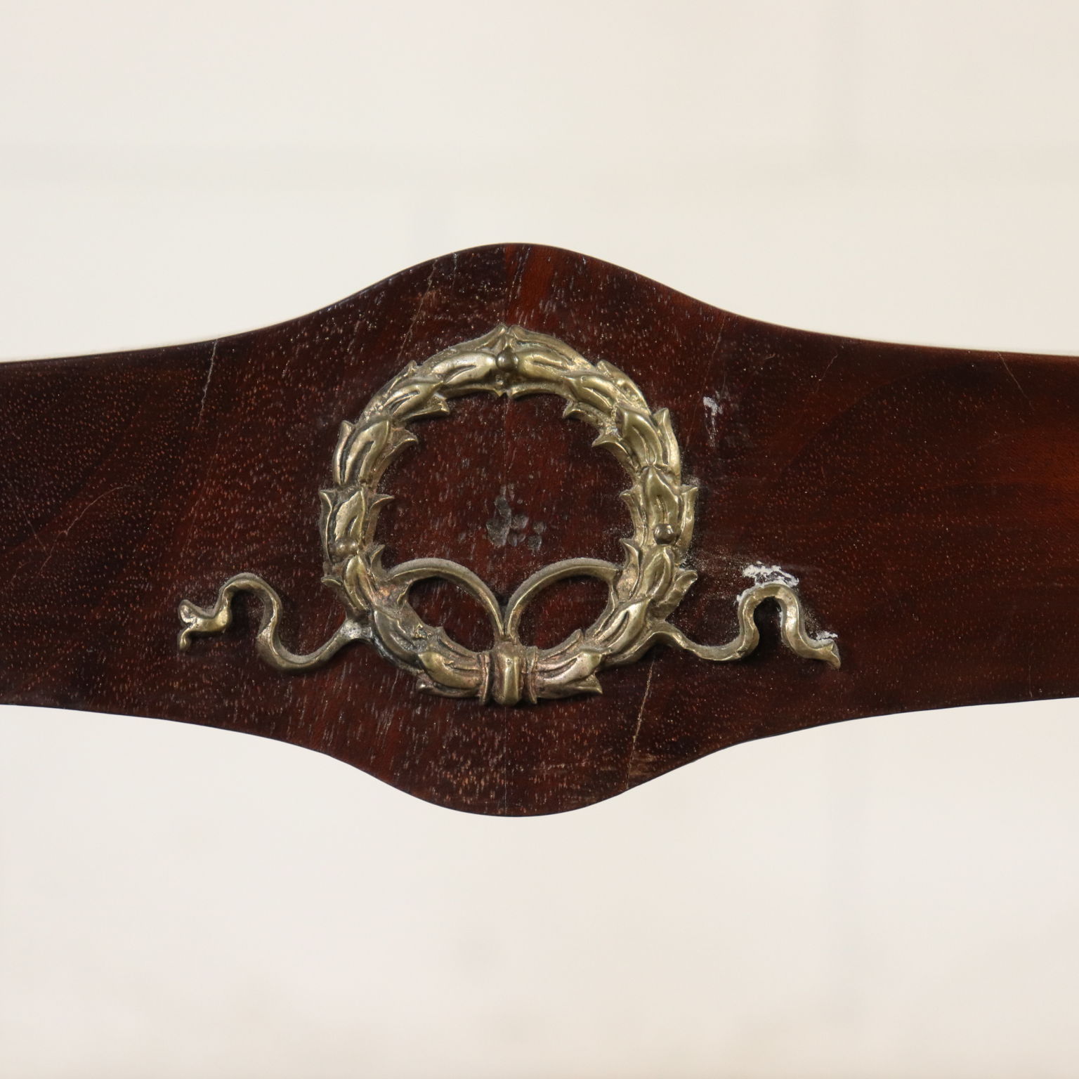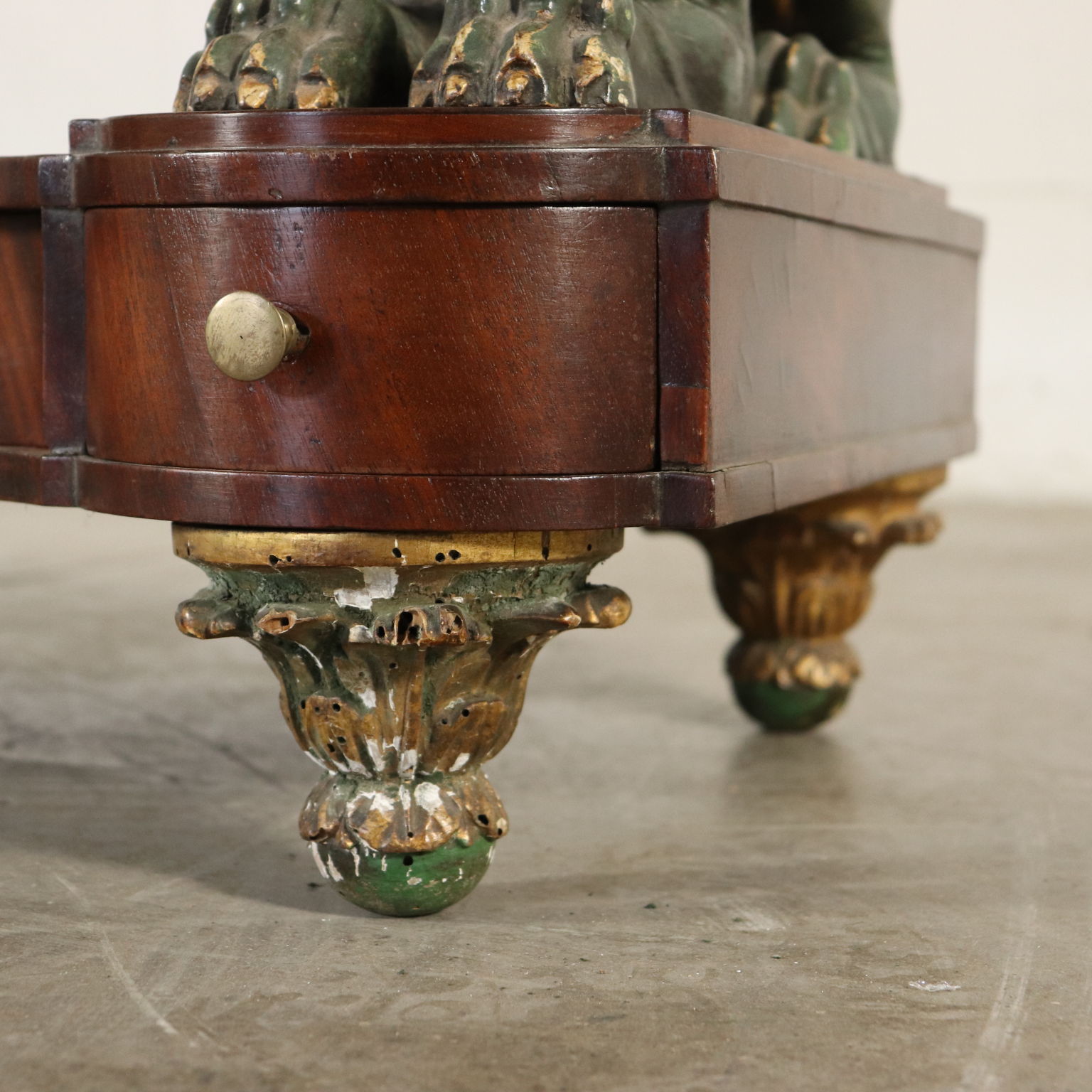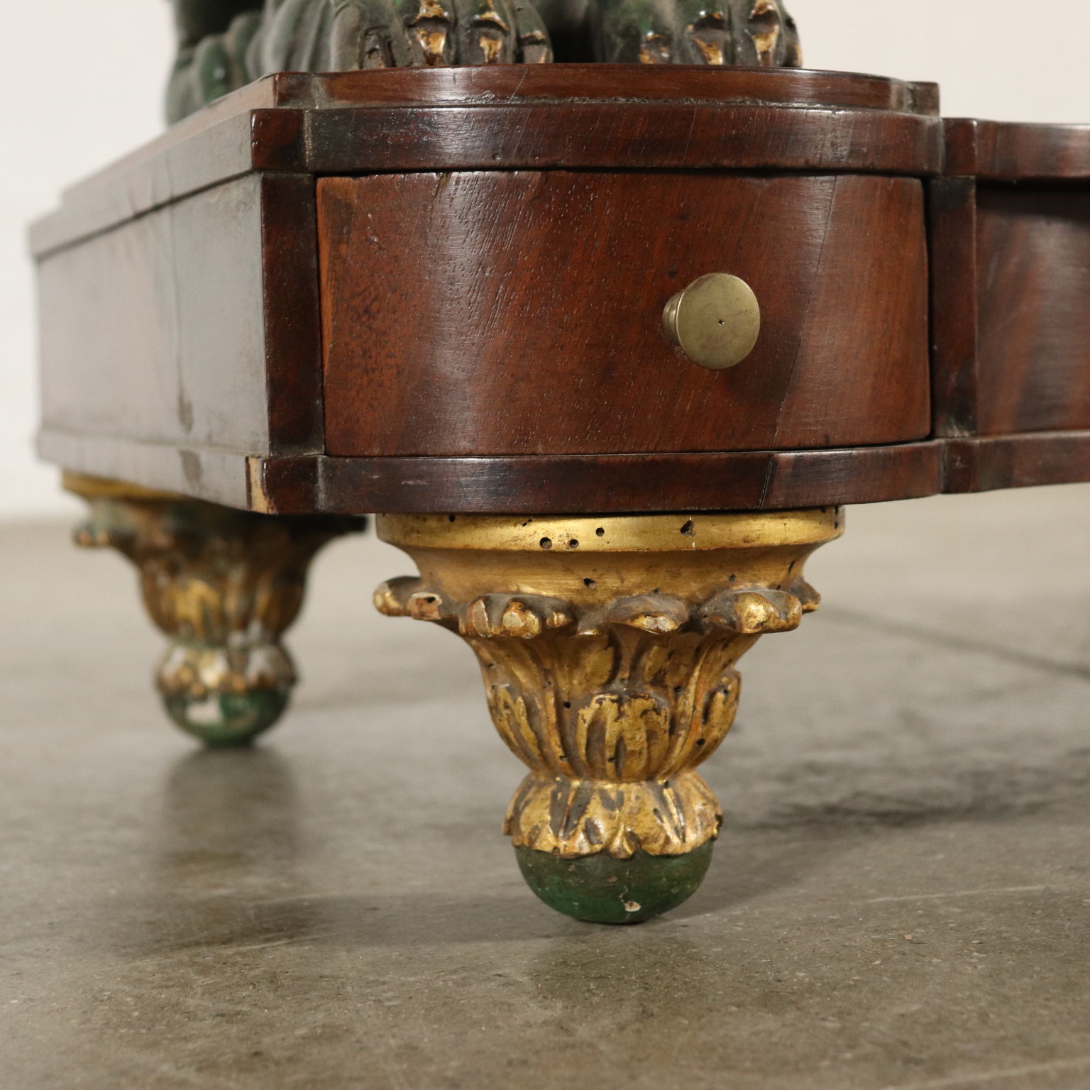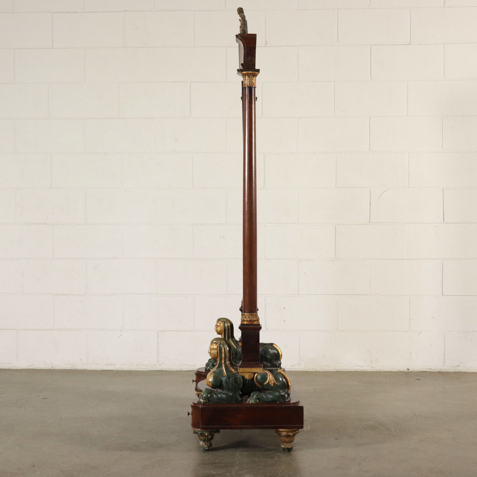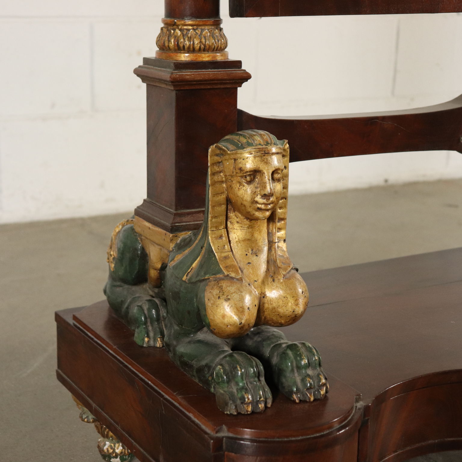 Elegante psyche Empire präsentiert profilierten sockel mit drei schubladen. Paar sphingen geschnitzt halten, säulen mit kapitellen. Adler geschnitzt mit serti lorbeer. Kerben lackiert in polychromie. Spiegel kippen.
