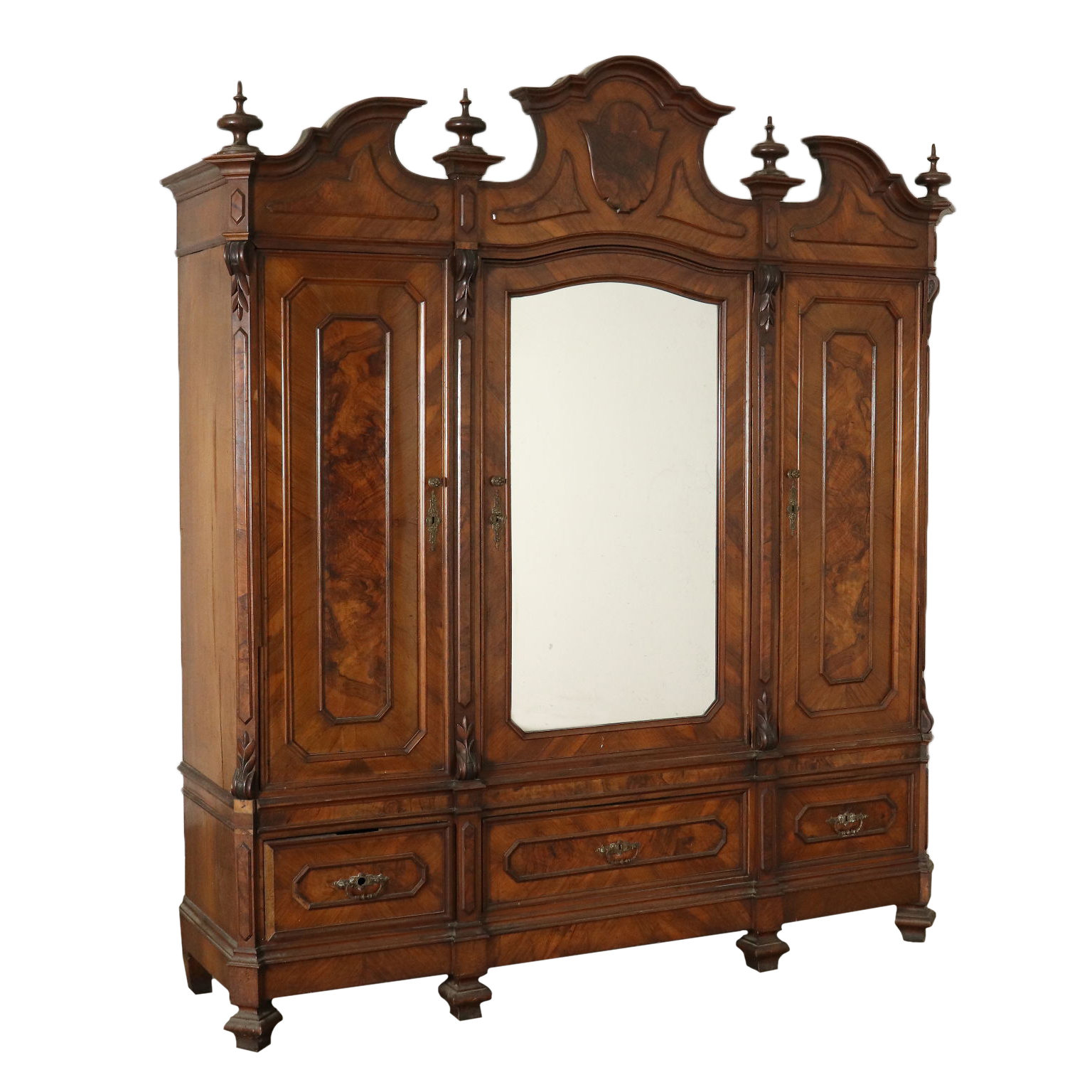 Dreitüriger Kleiderschrank mit Spiegel. In der Basis stehen 3 Schubladen. Walnusswurzel. Kymation mit Drechseln gebrochen.