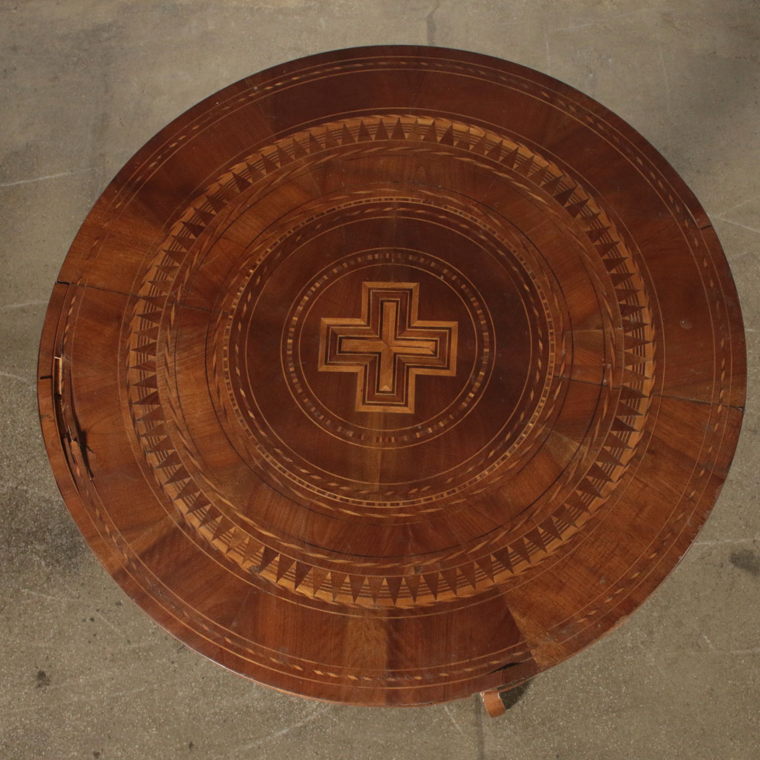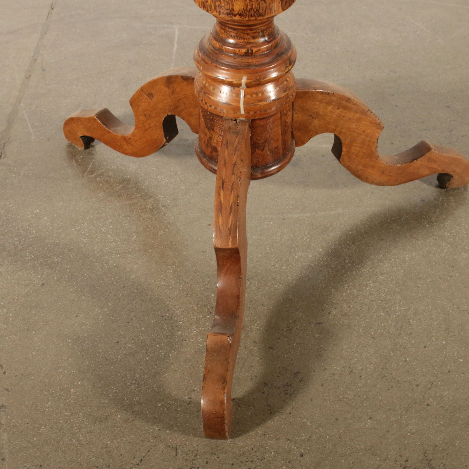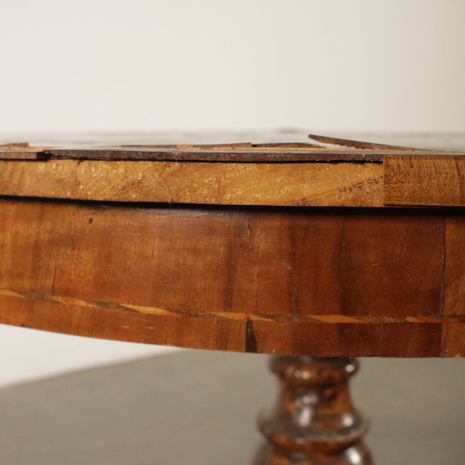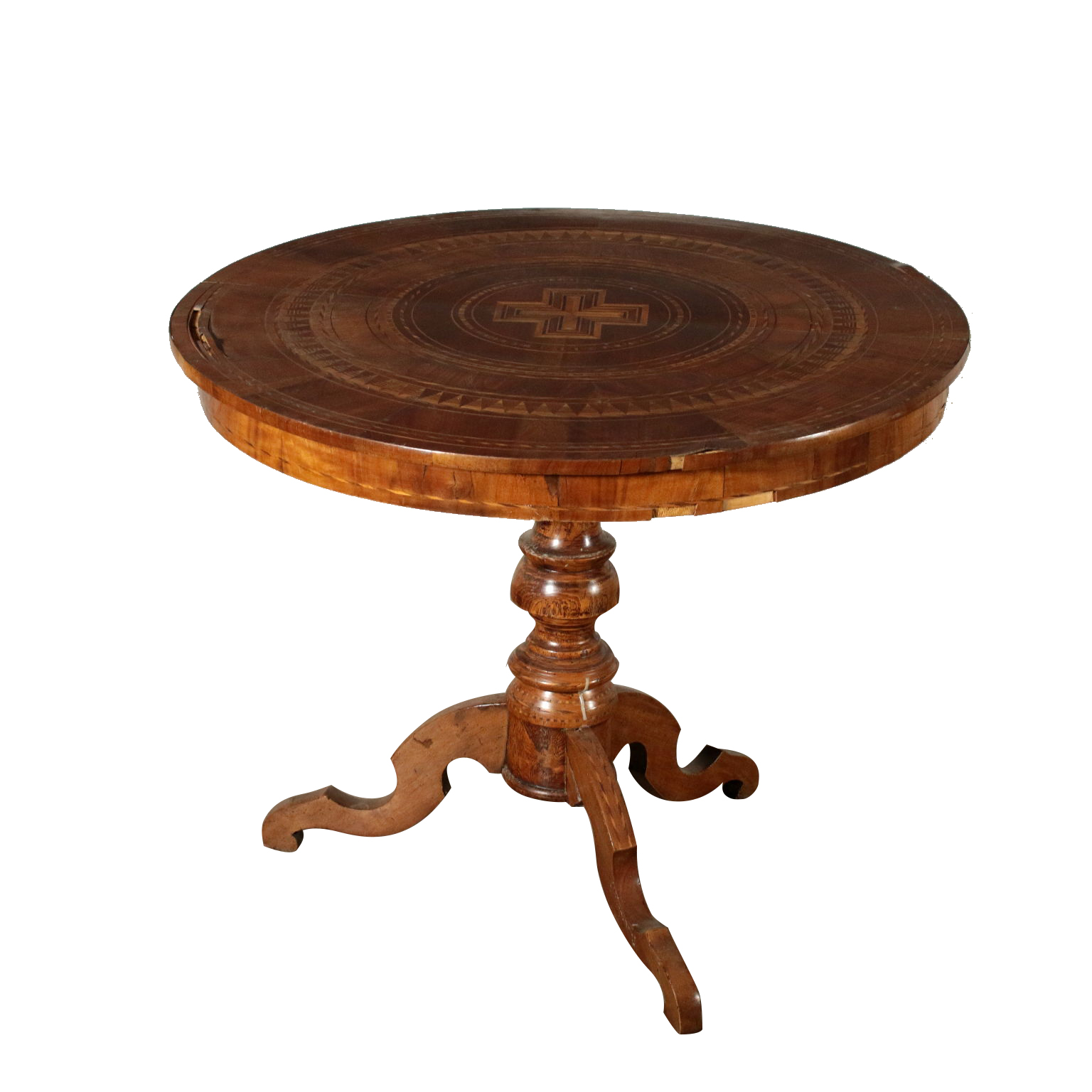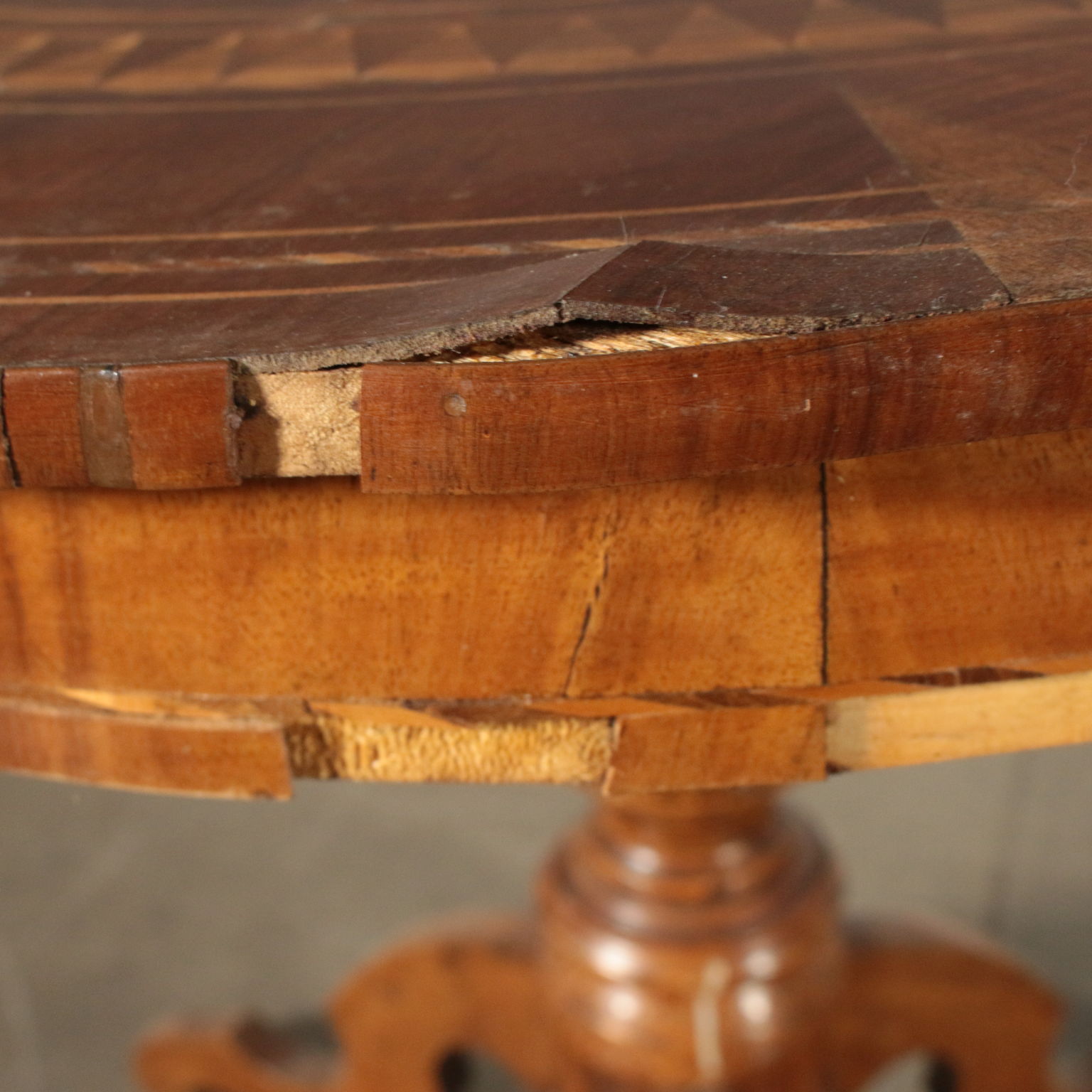 Beistelltisch einem Bein mit Dreifüß. Runde Platte mit Intarsien. Restaurierung ist erforderlich. Hergestellt in Rolo, Italien, 19. Jahrhundert.
