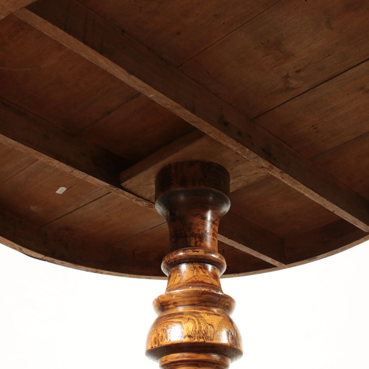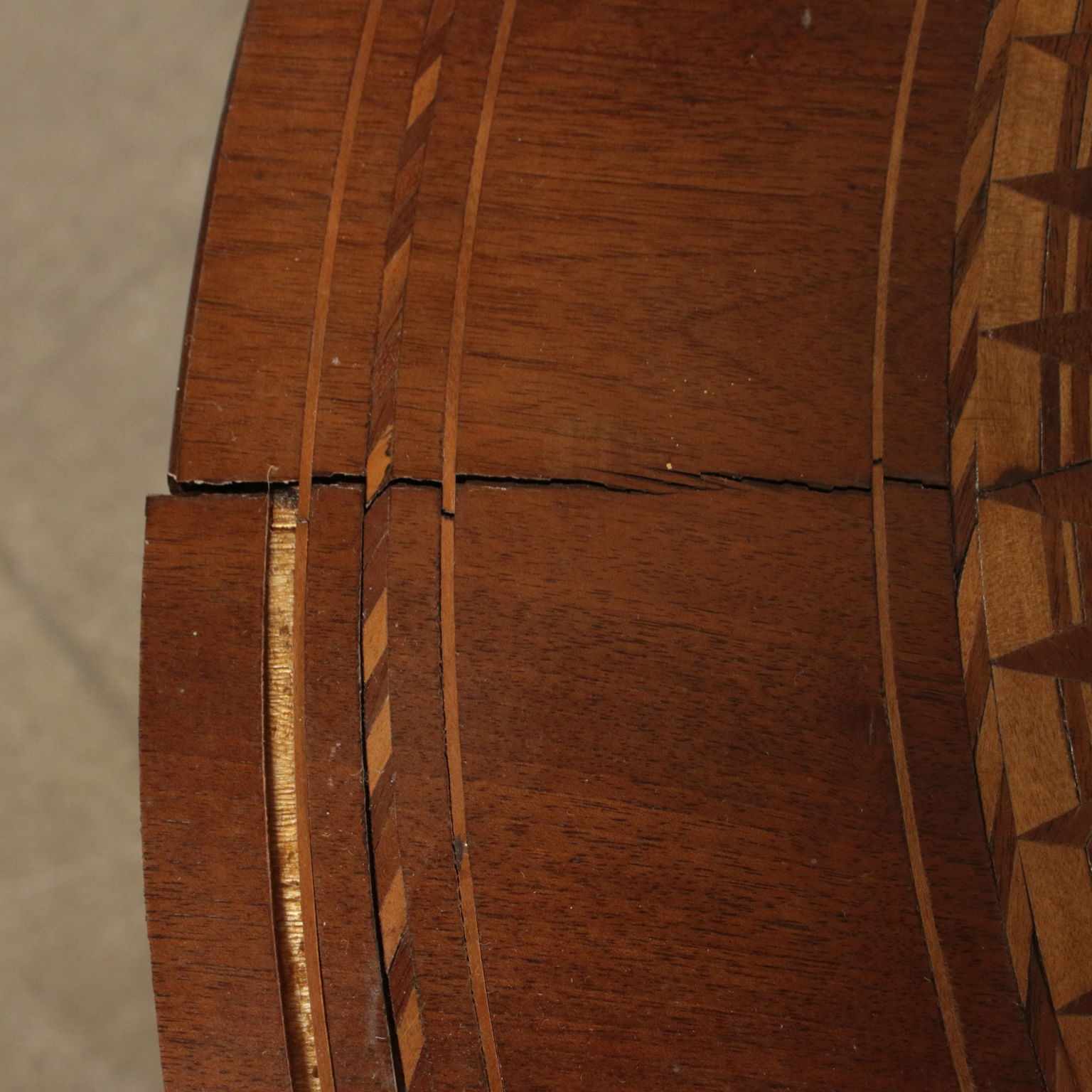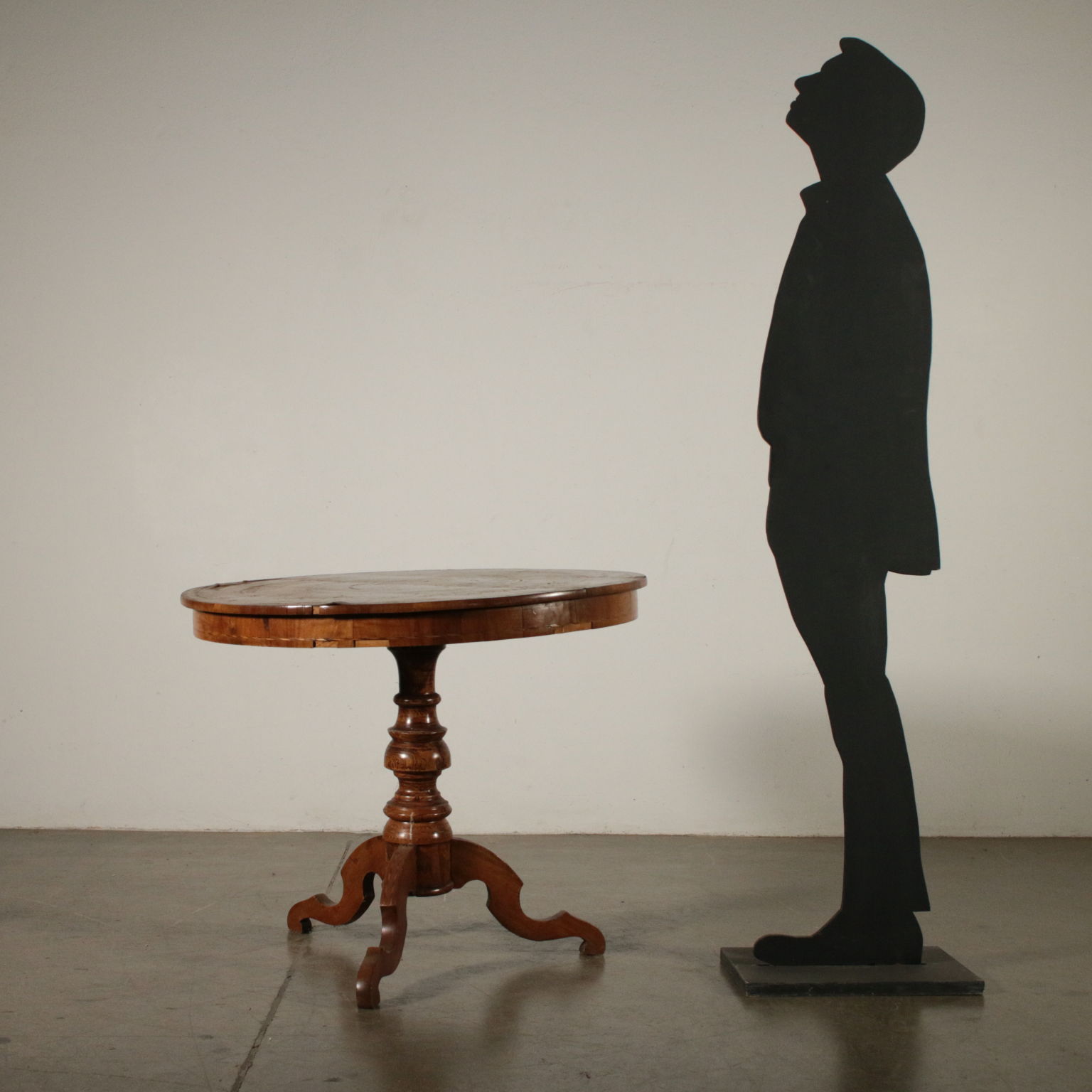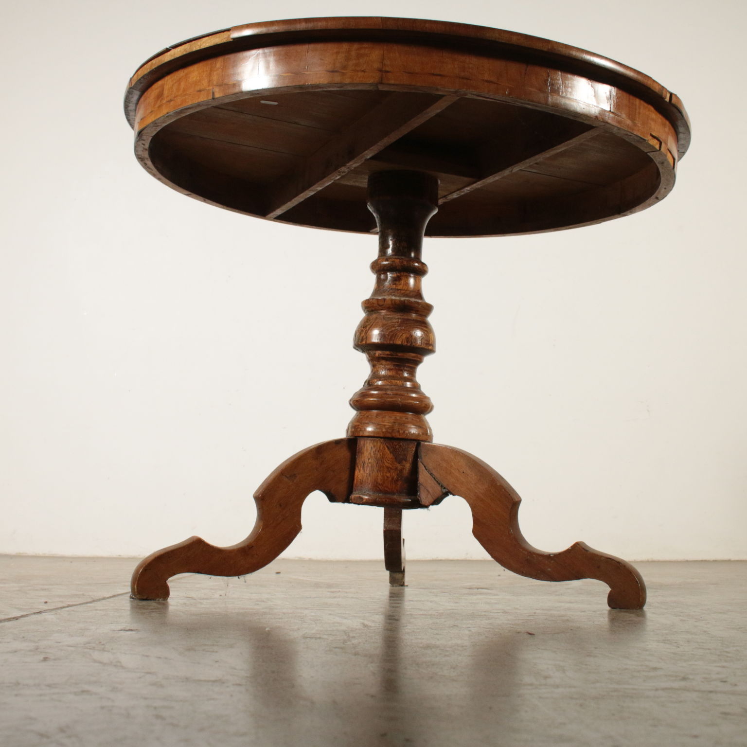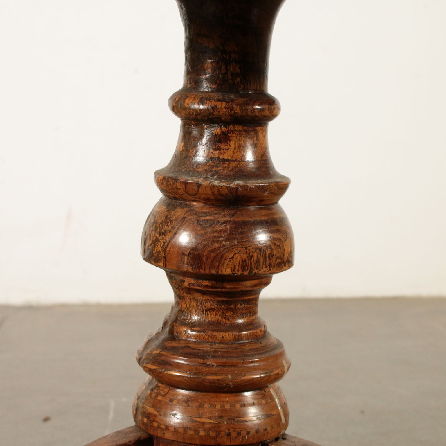 Beistelltisch einem Bein mit Dreifüß. Runde Platte mit Intarsien. Restaurierung ist erforderlich. Hergestellt in Rolo, Italien, 19. Jahrhundert.