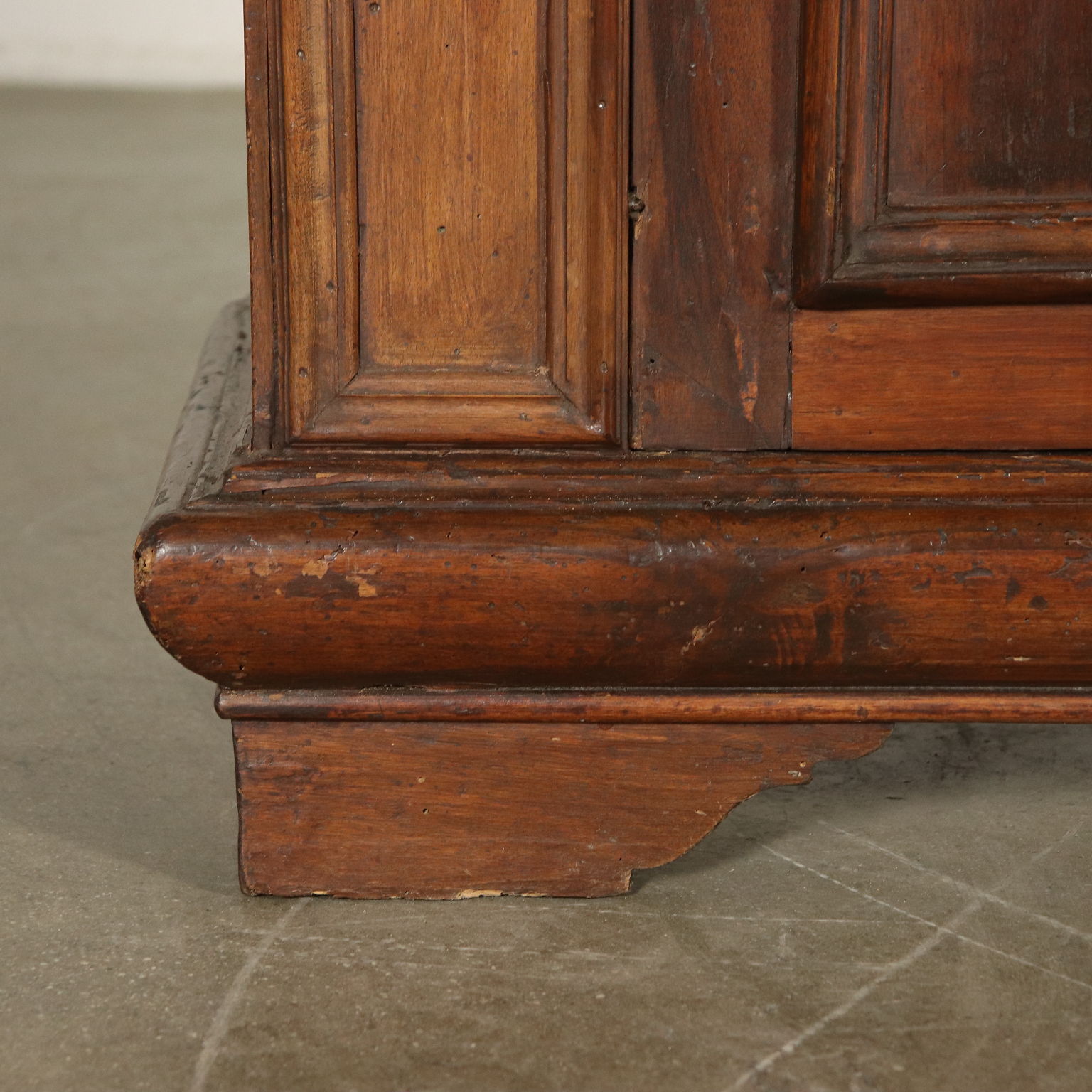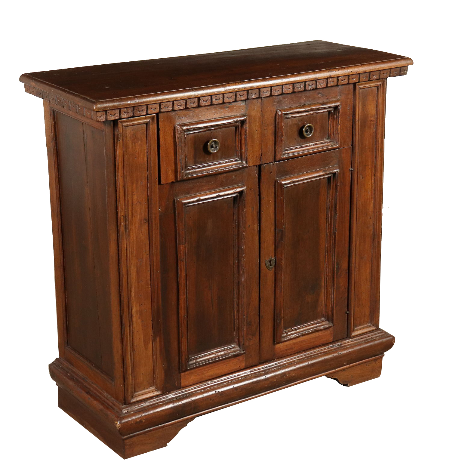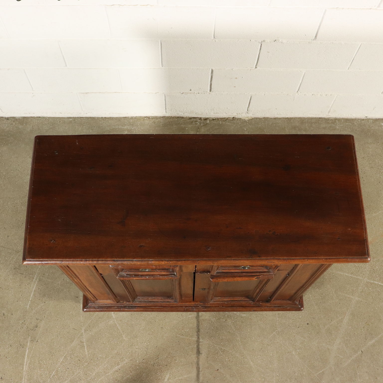 Kleine kommode zusammengebaut mit antikem holz. Verfügt über zwei türen und zwei schubladen aufgereiht. Der rahmen beulen.