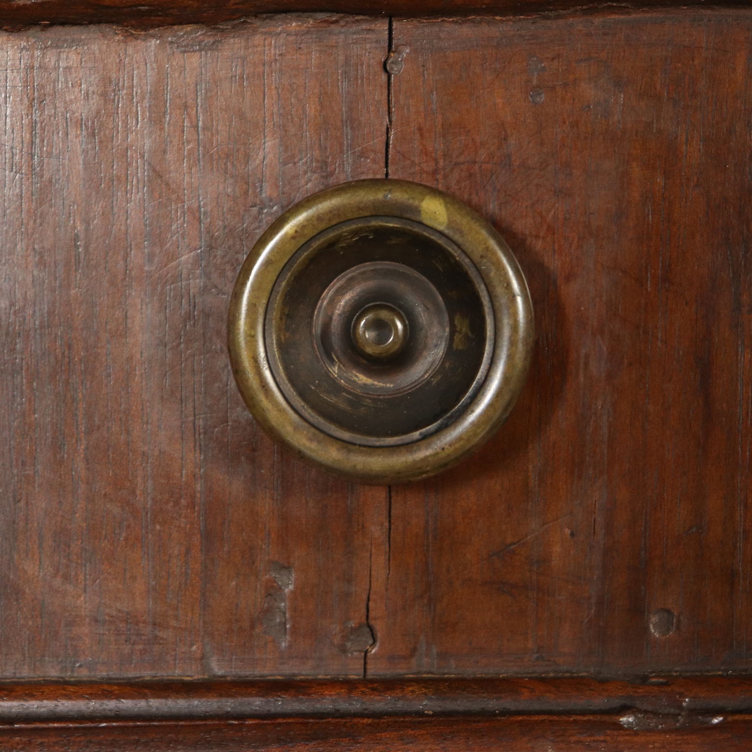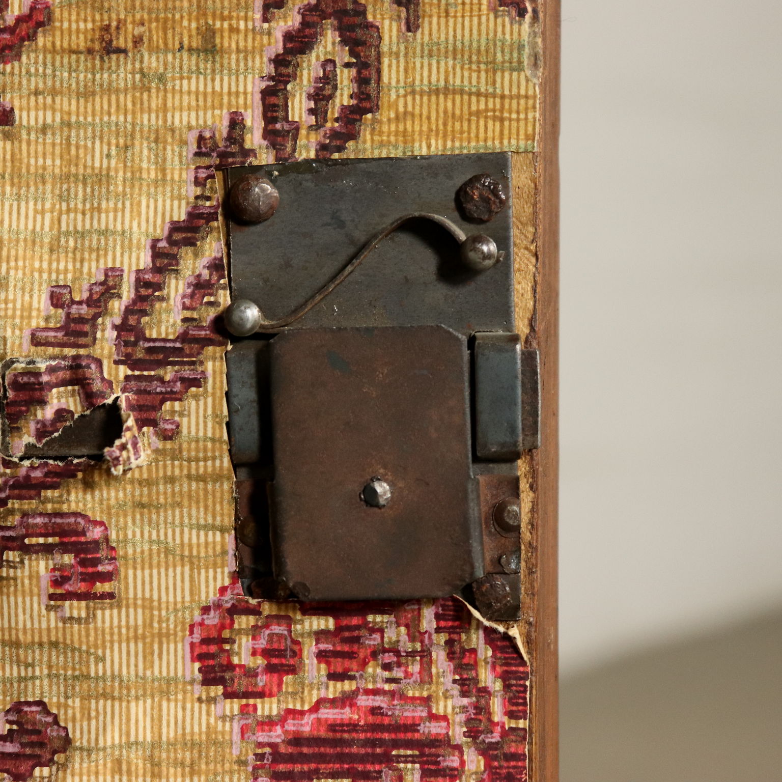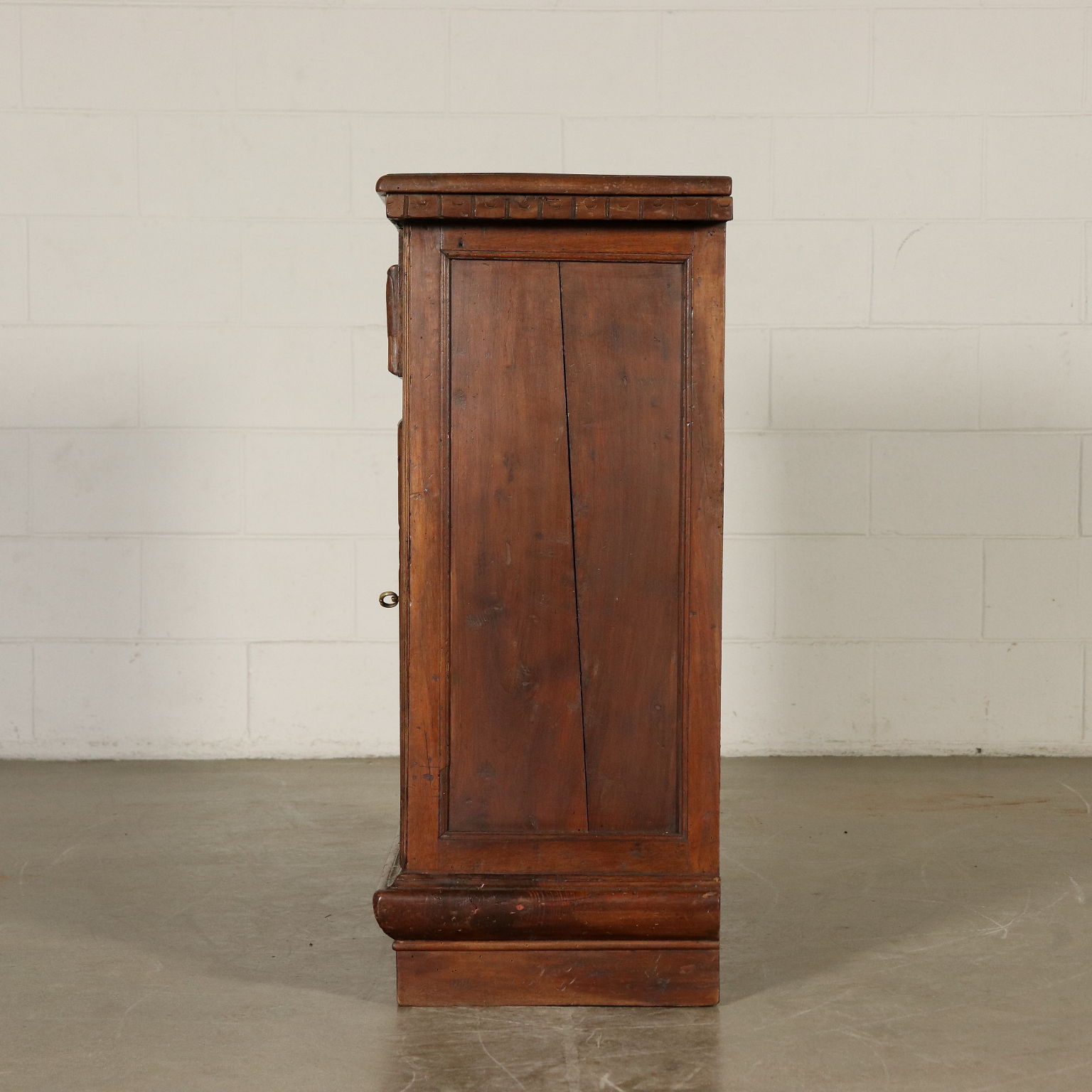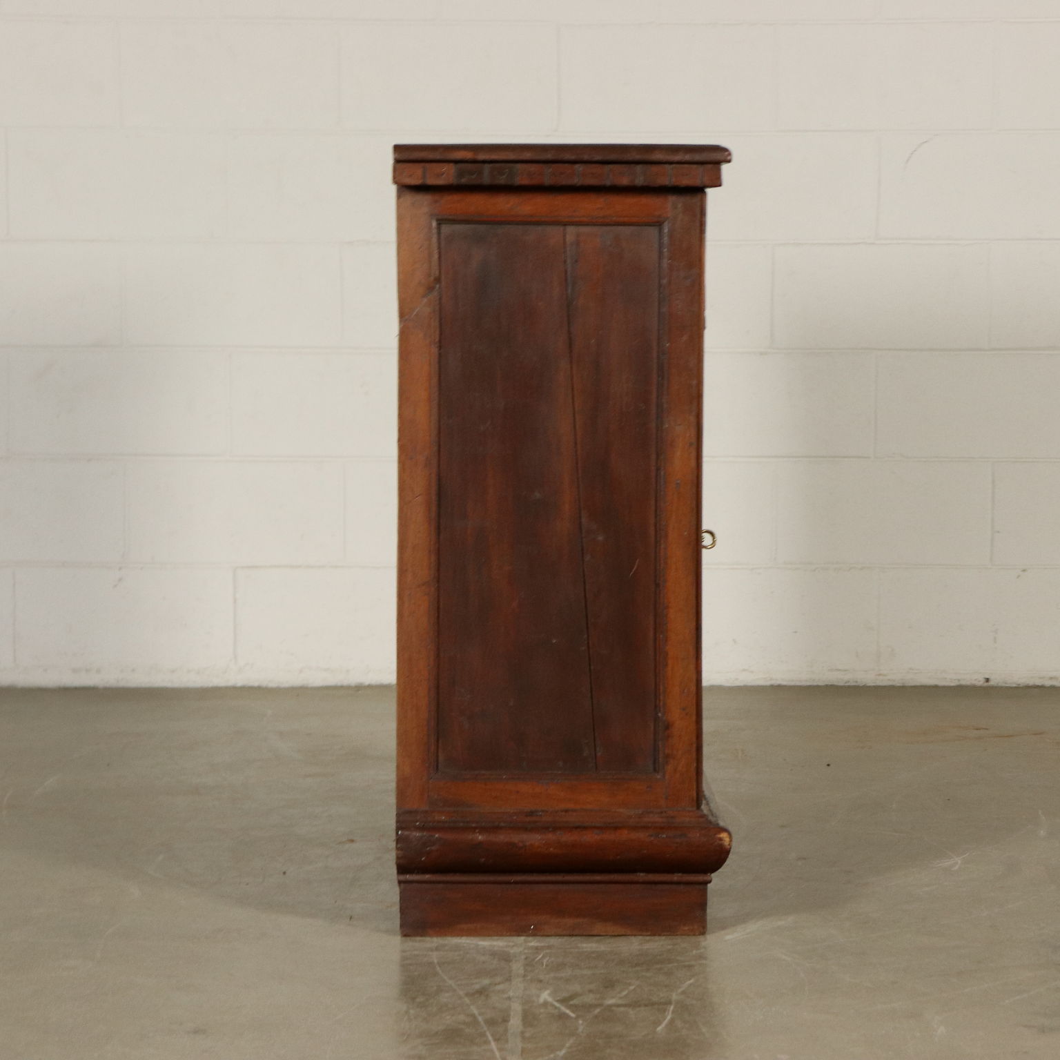 Kleine kommode zusammengebaut mit antikem holz. Verfügt über zwei türen und zwei schubladen aufgereiht. Der rahmen beulen.